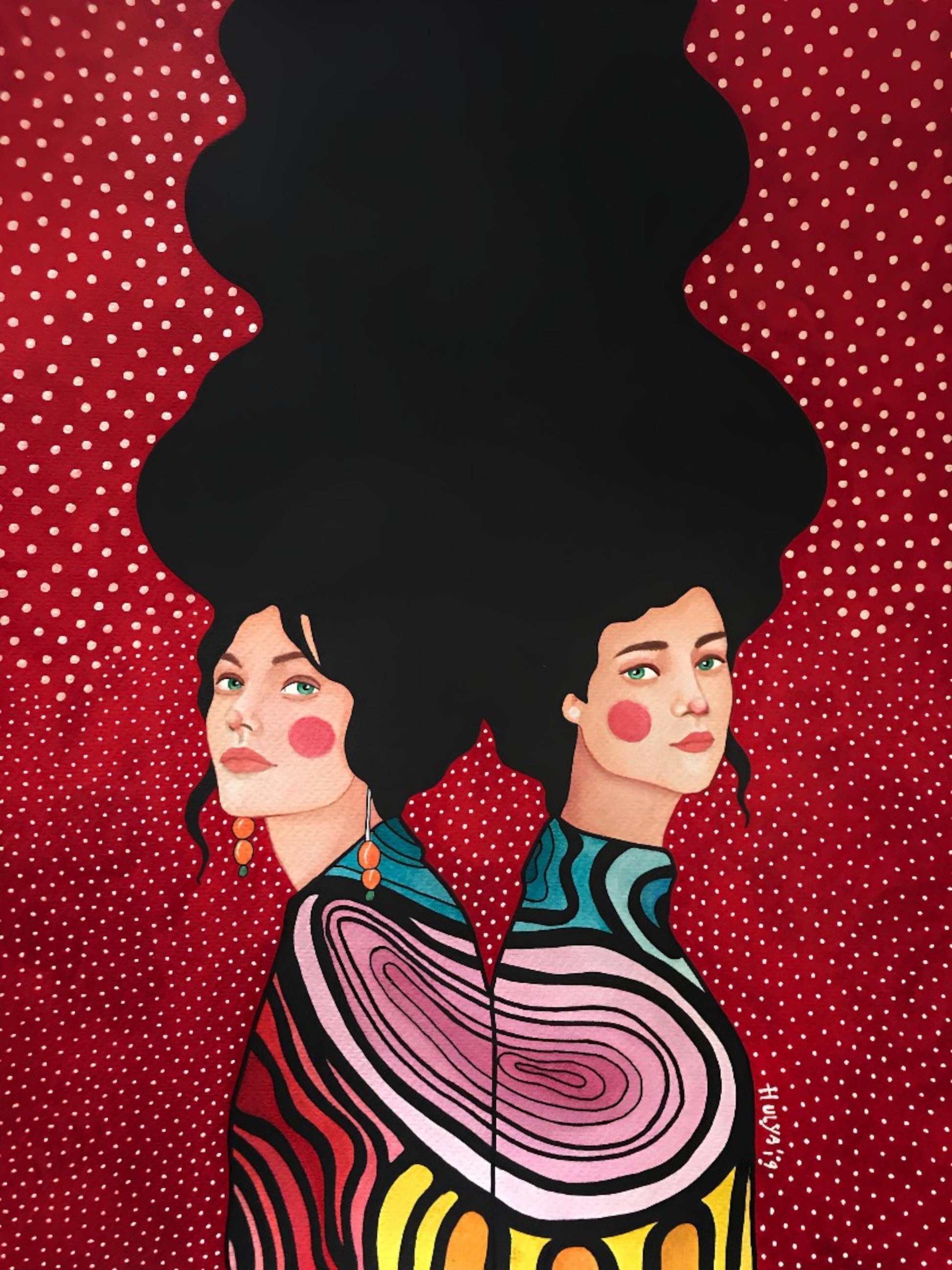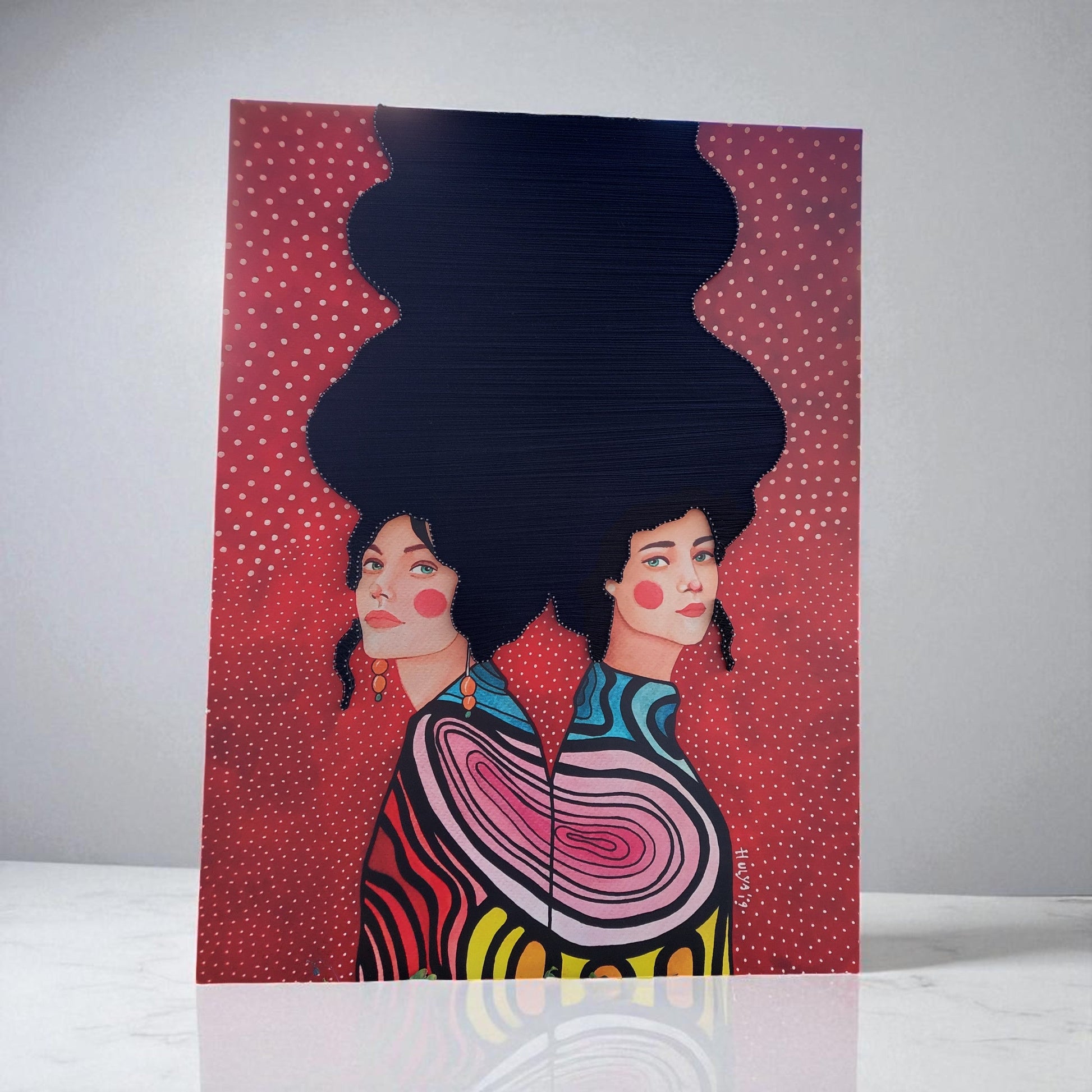 *A string art painting was made by transferring the high-resolution images of the unique female portraits made with watercolor by the illustrator Hülya Özdemir to wood and using nails and thread on the hair part.