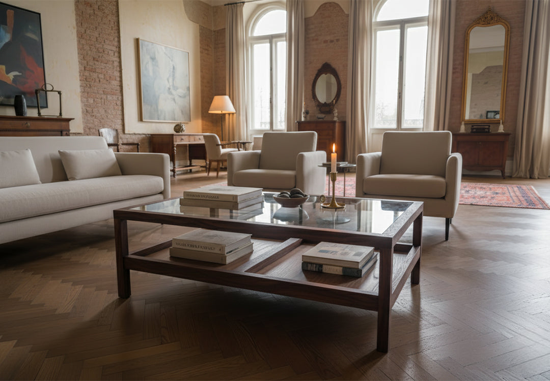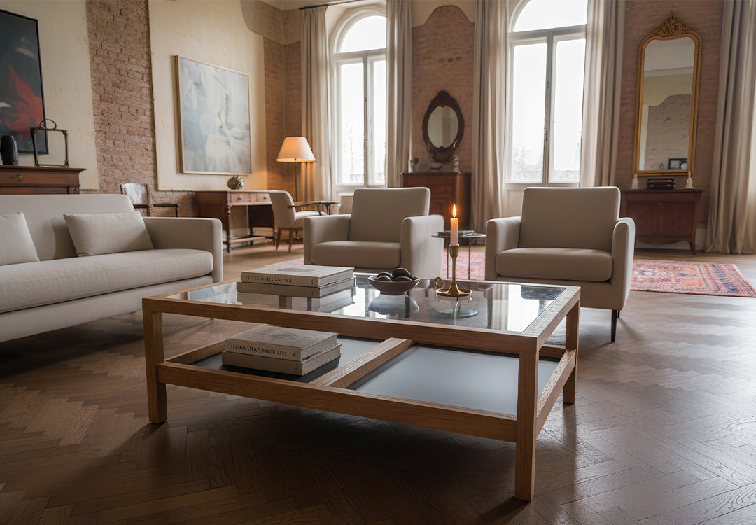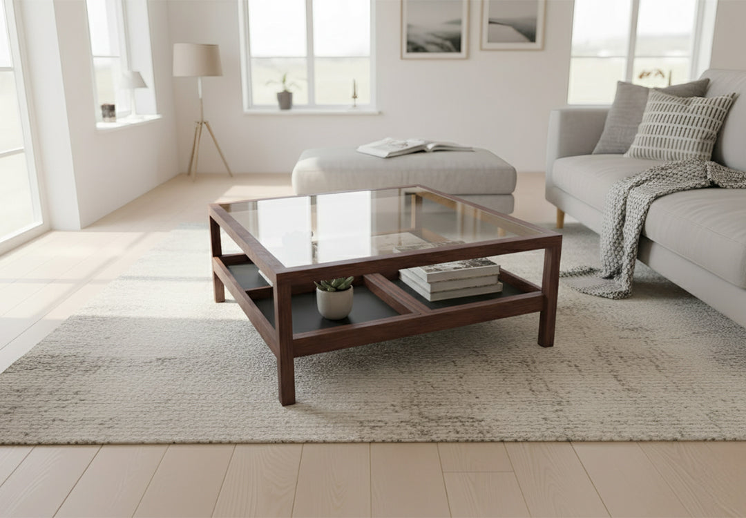 Providing practical use with its drawer-function tray system at the bottom, the Raku Coffee Table is produced entirely by hand using first-class solid wood and tempered glass.