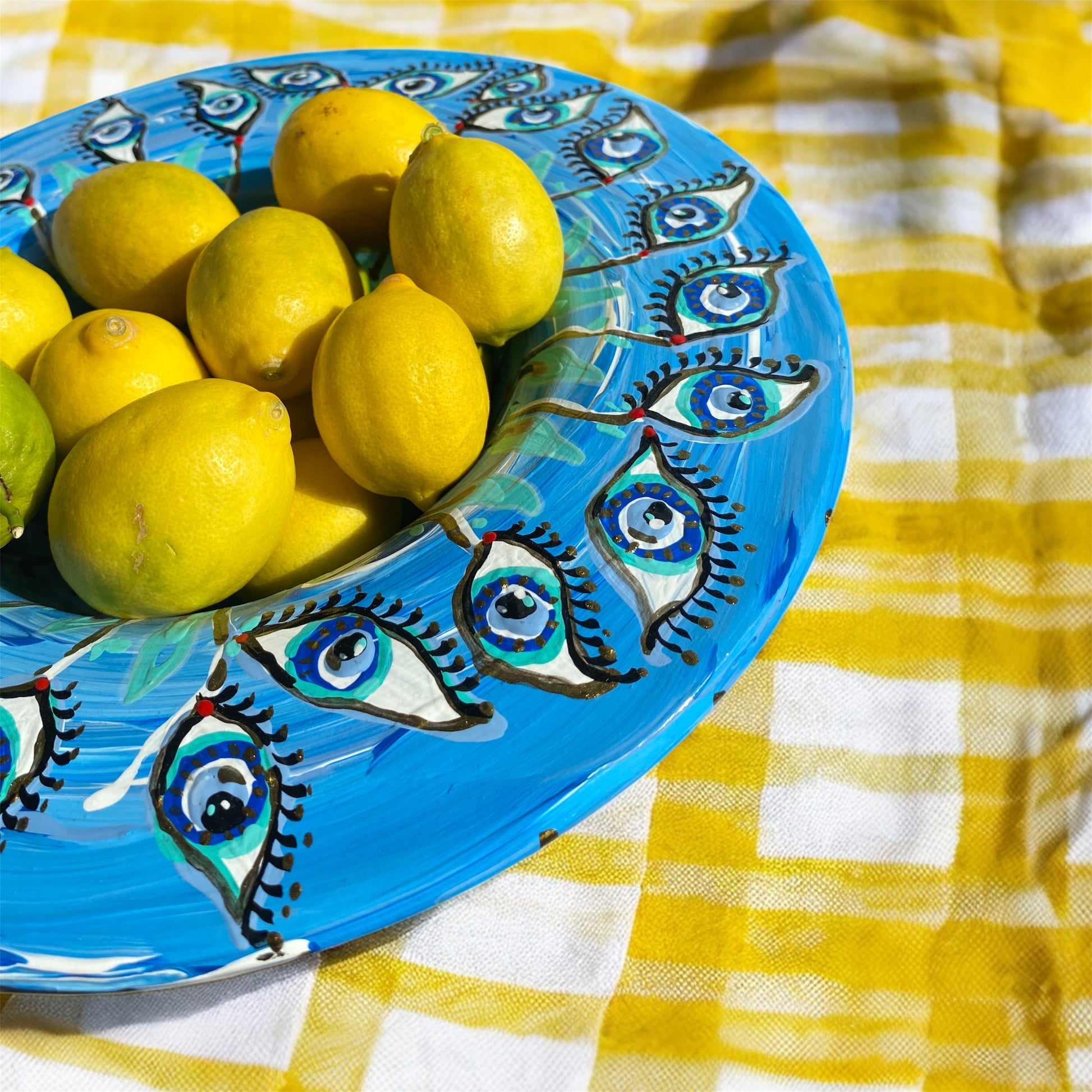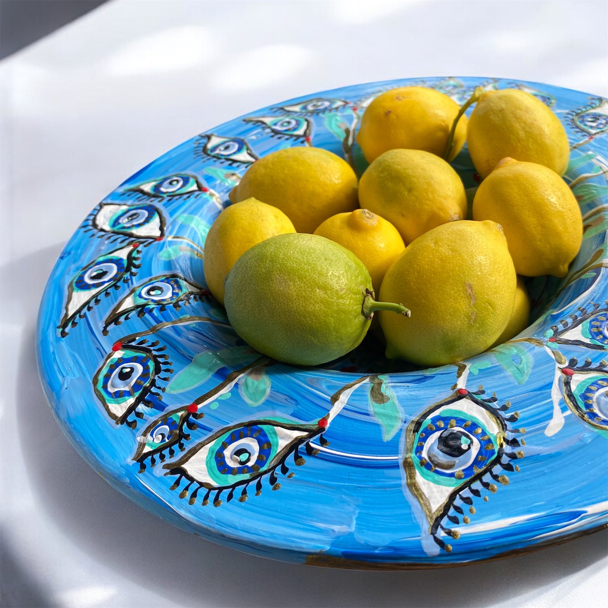 32 cm çapında fırınlaşmış çamur üzeri akrilik karışık teknik çalışması.
