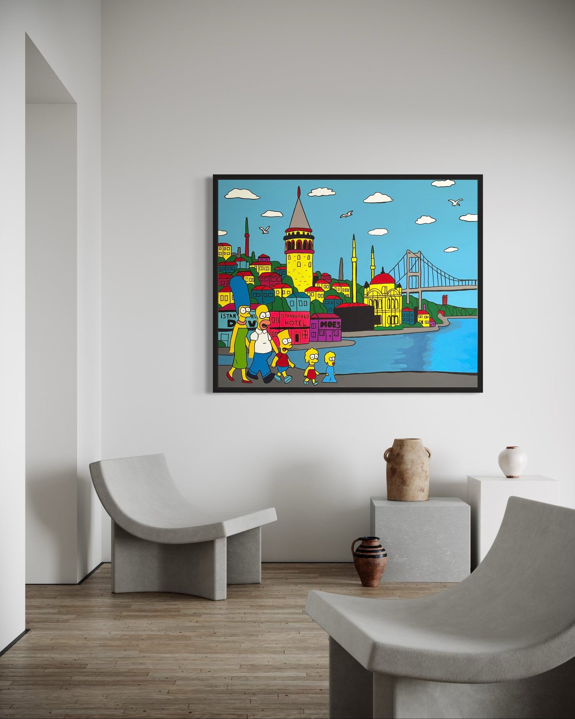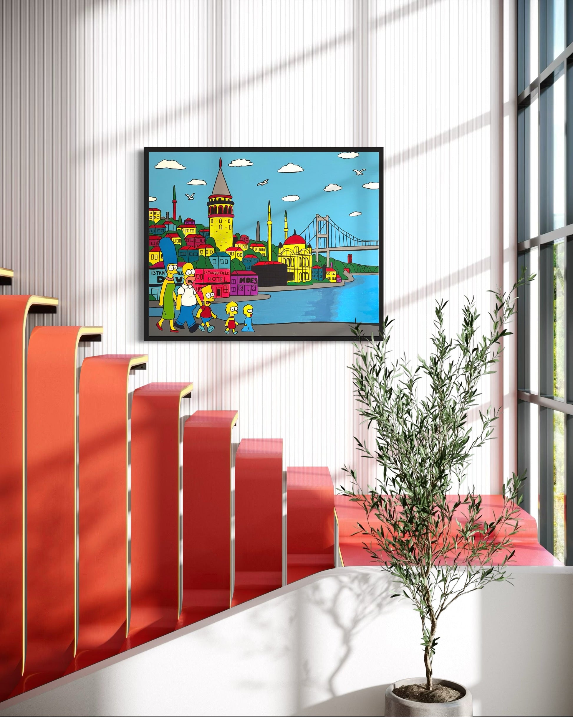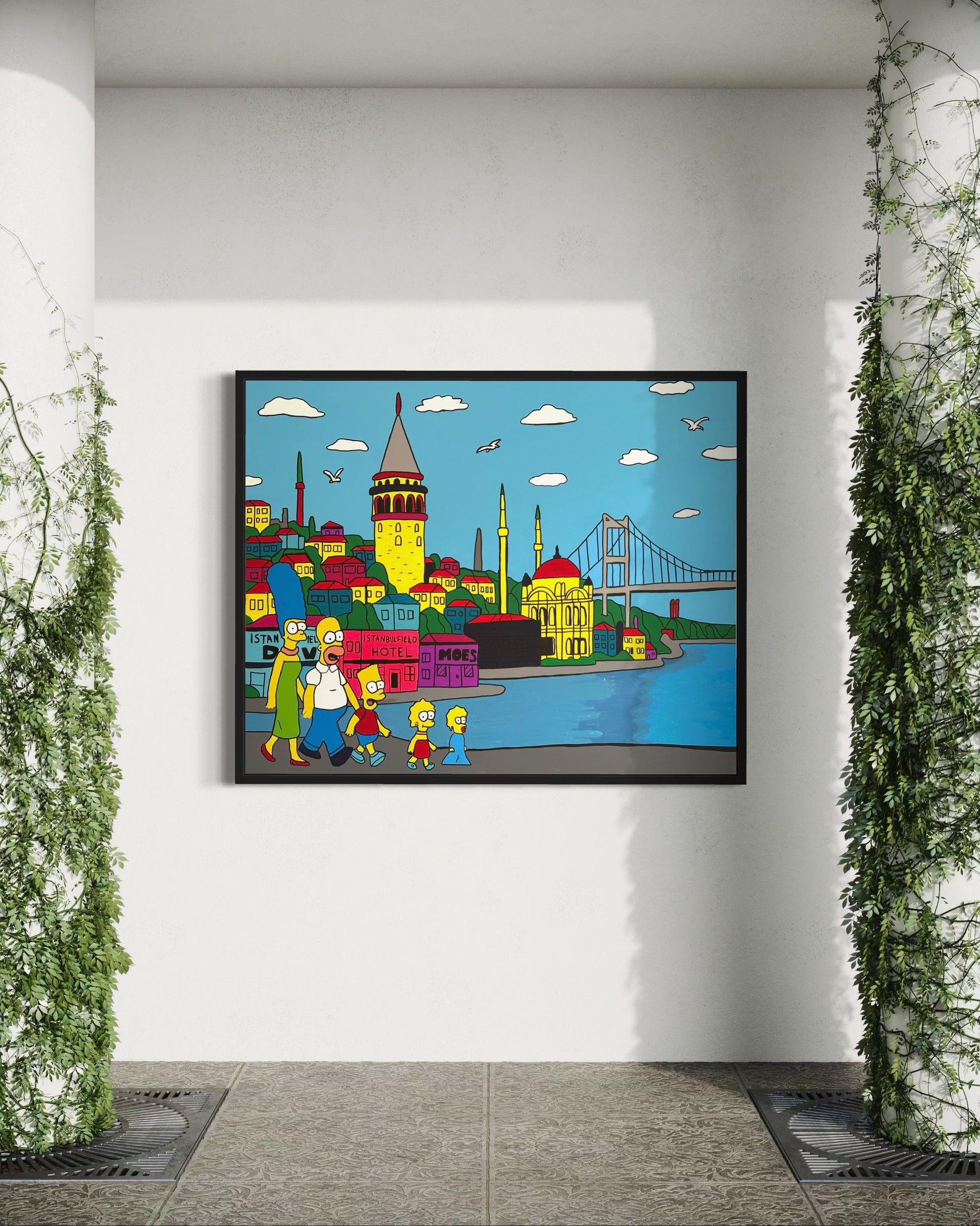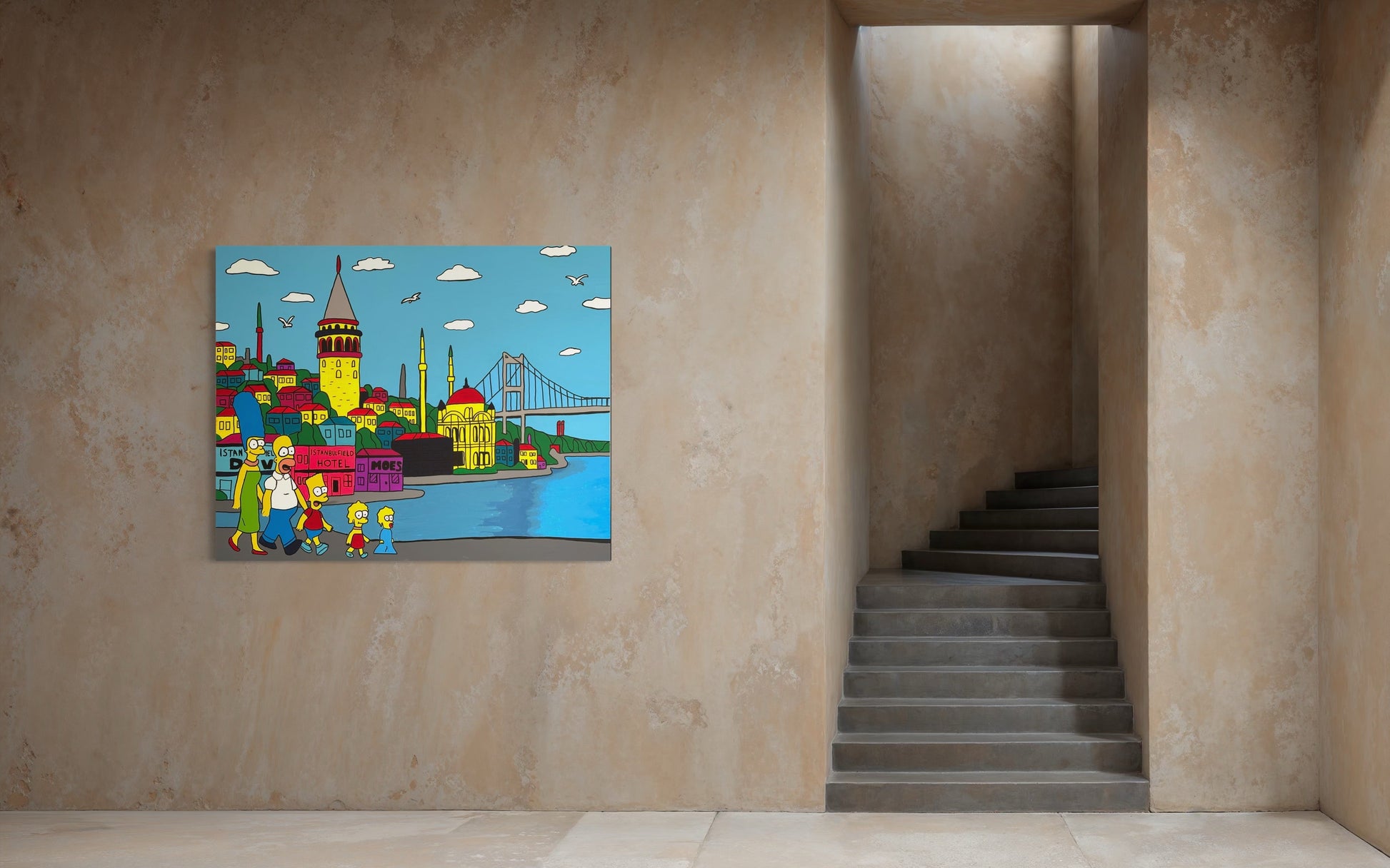 Symbols such as the Galata Tower, Ortaköy Mosque and the Bosphorus Bridge take on a new reality with yellow characters and pastel tones. This work blurs the boundaries of pop culture and urban aesthetics, making the viewer both think and smile.