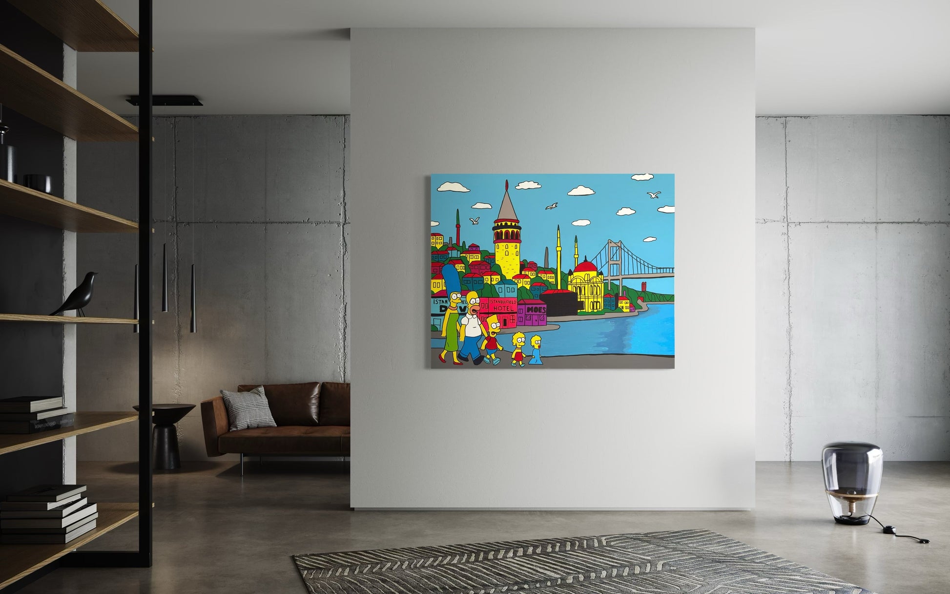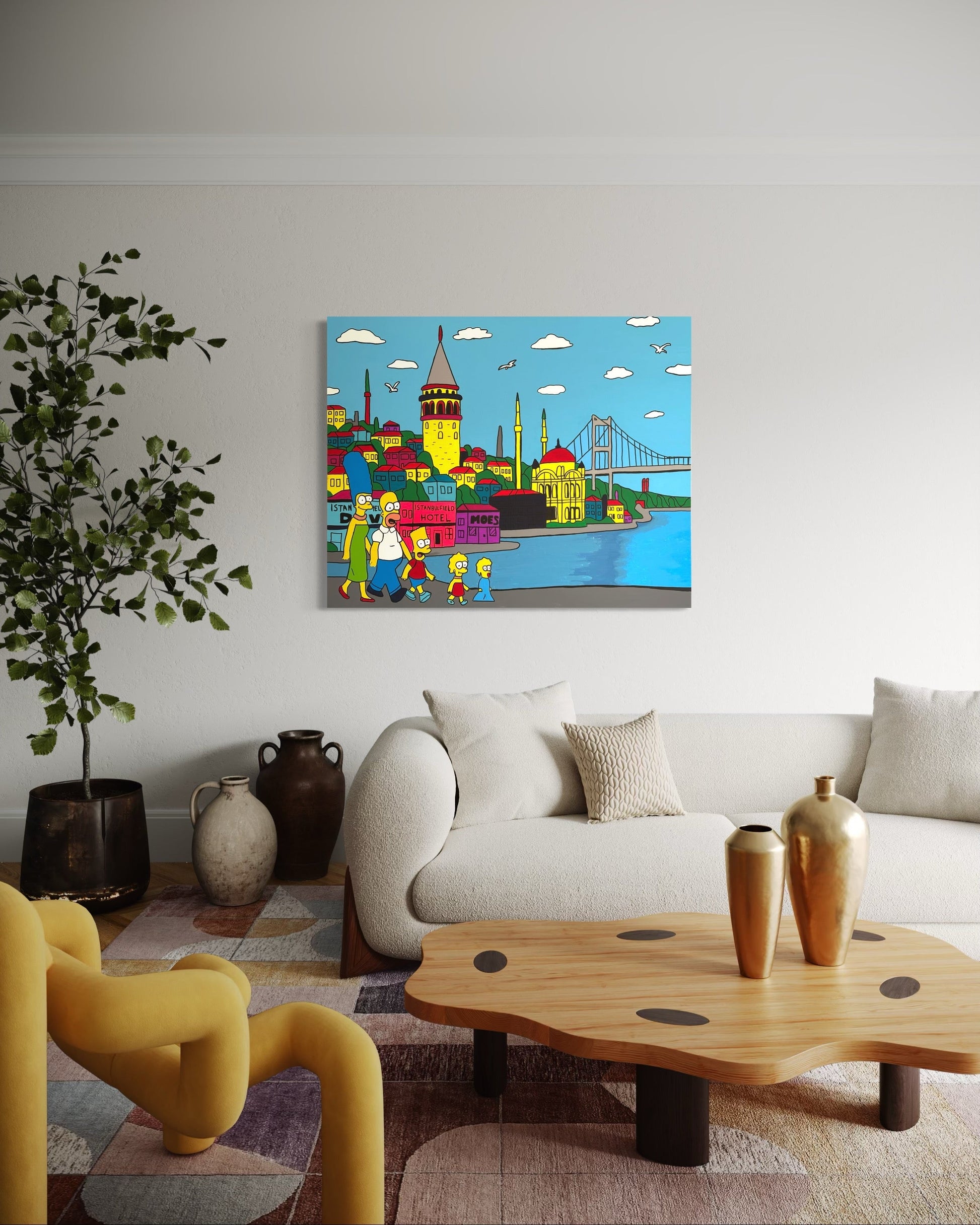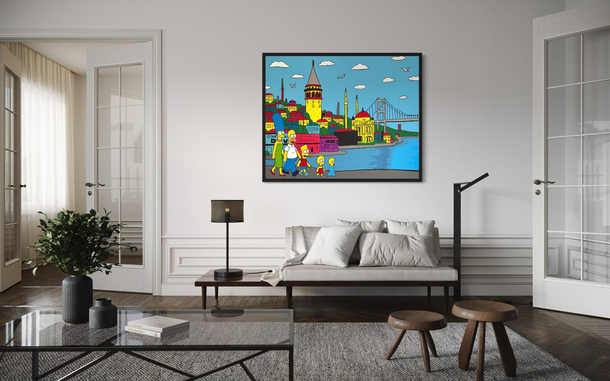 Symbols such as the Galata Tower, Ortaköy Mosque and the Bosphorus Bridge take on a new reality with yellow characters and pastel tones. This work blurs the boundaries of pop culture and urban aesthetics, making the viewer both think and smile.