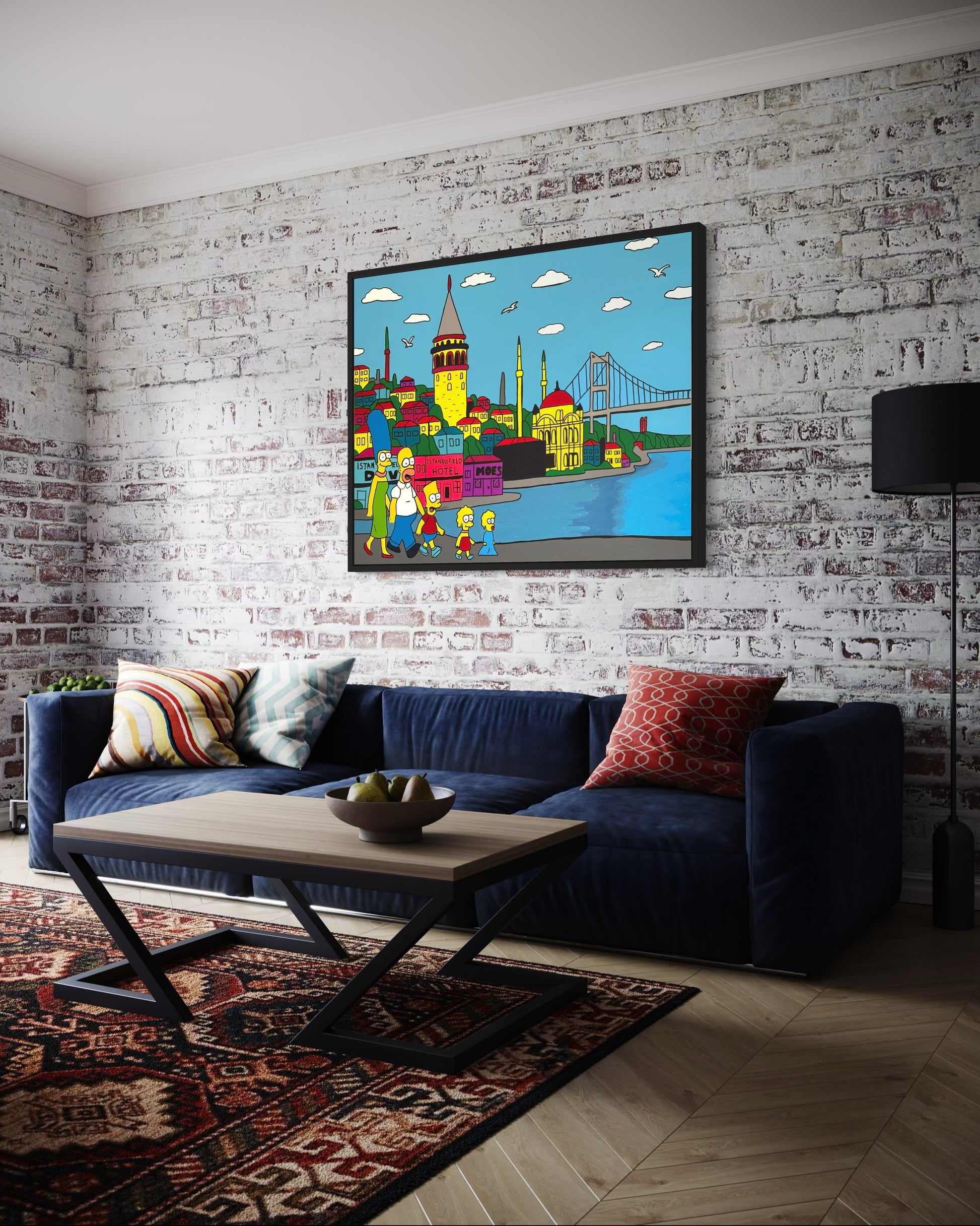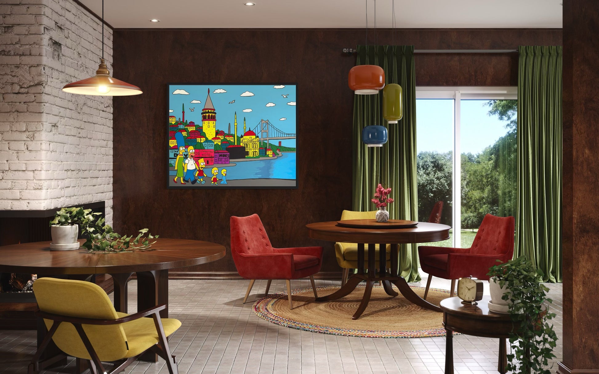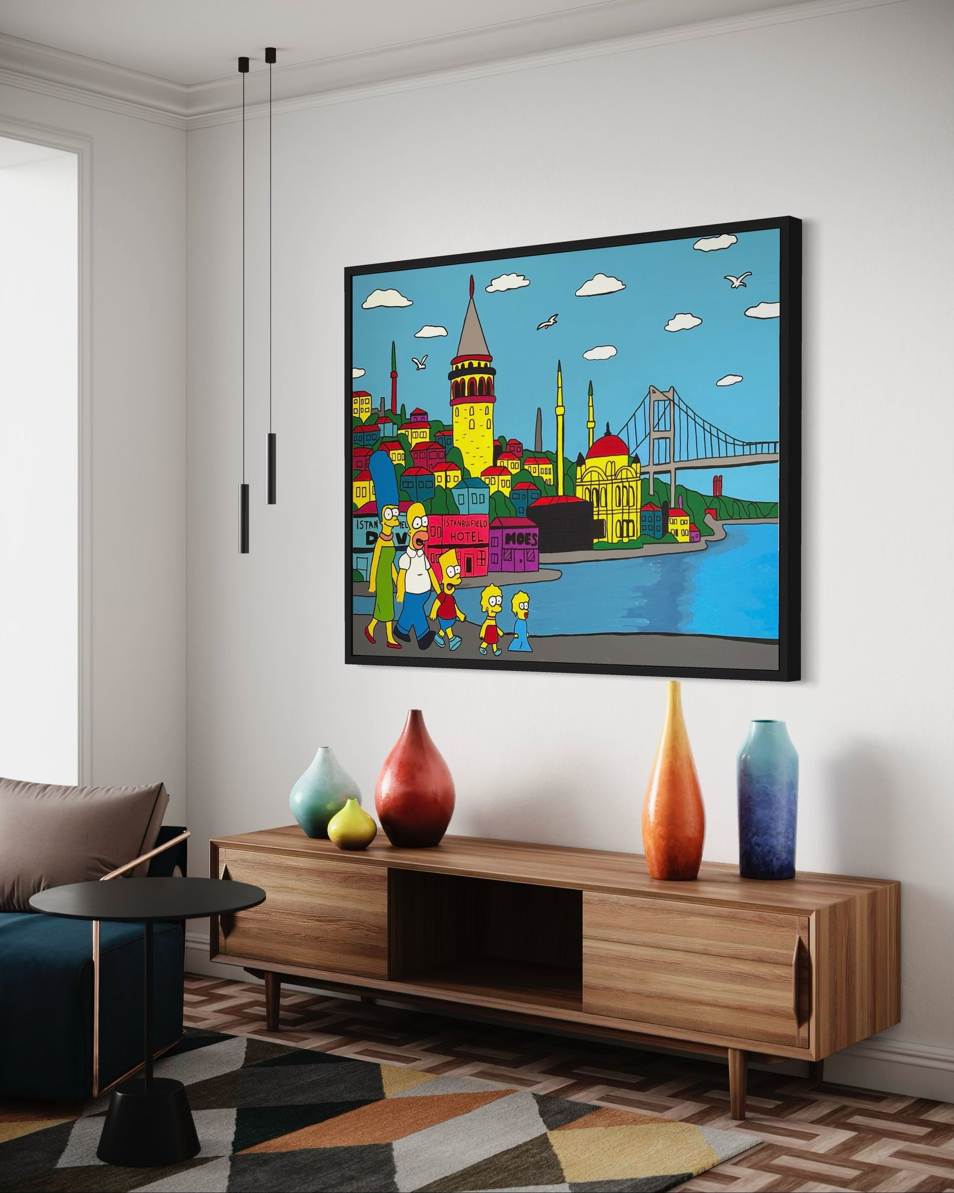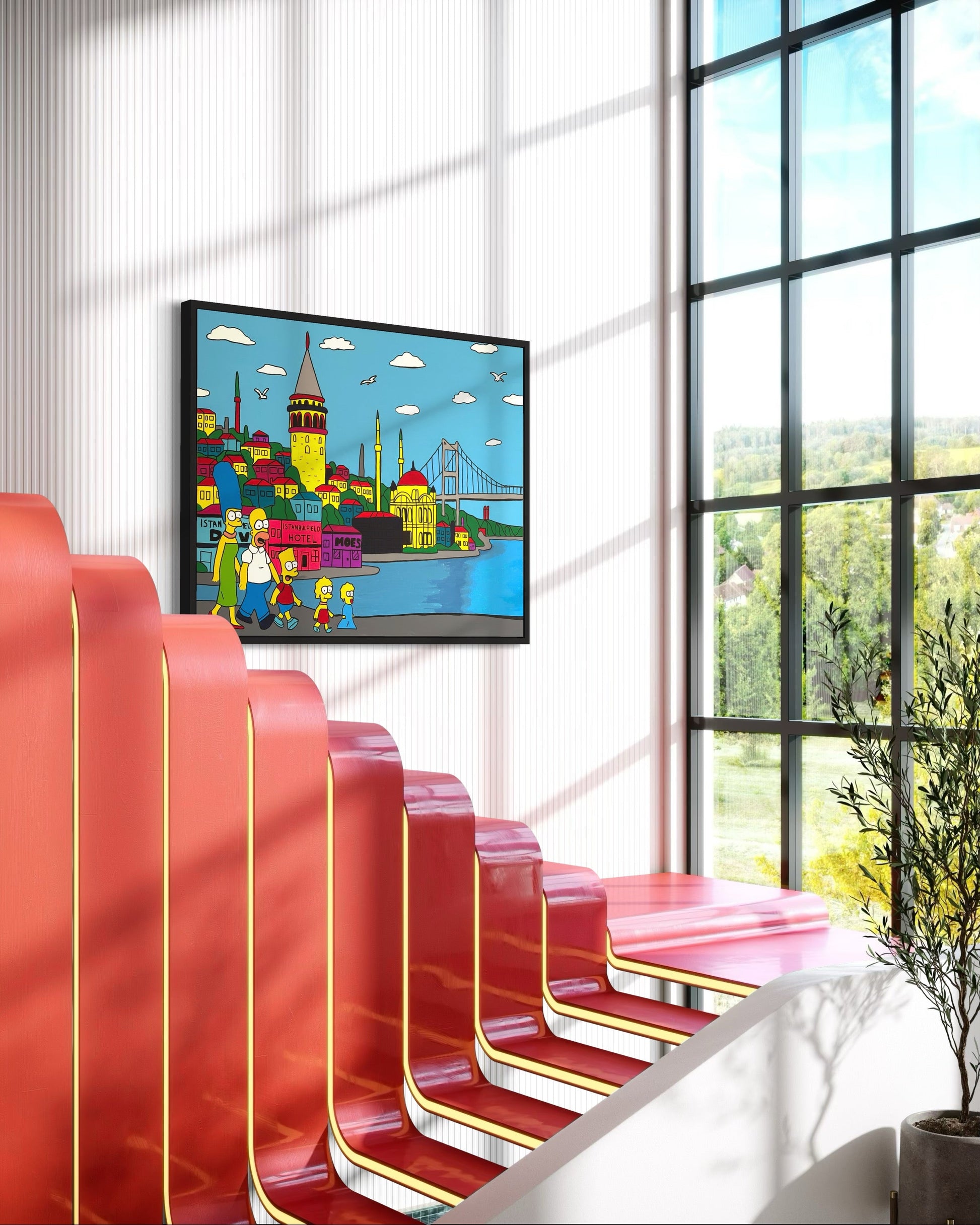 Symbols such as the Galata Tower, Ortaköy Mosque and the Bosphorus Bridge take on a new reality with yellow characters and pastel tones. This work blurs the boundaries of pop culture and urban aesthetics, making the viewer both think and smile.