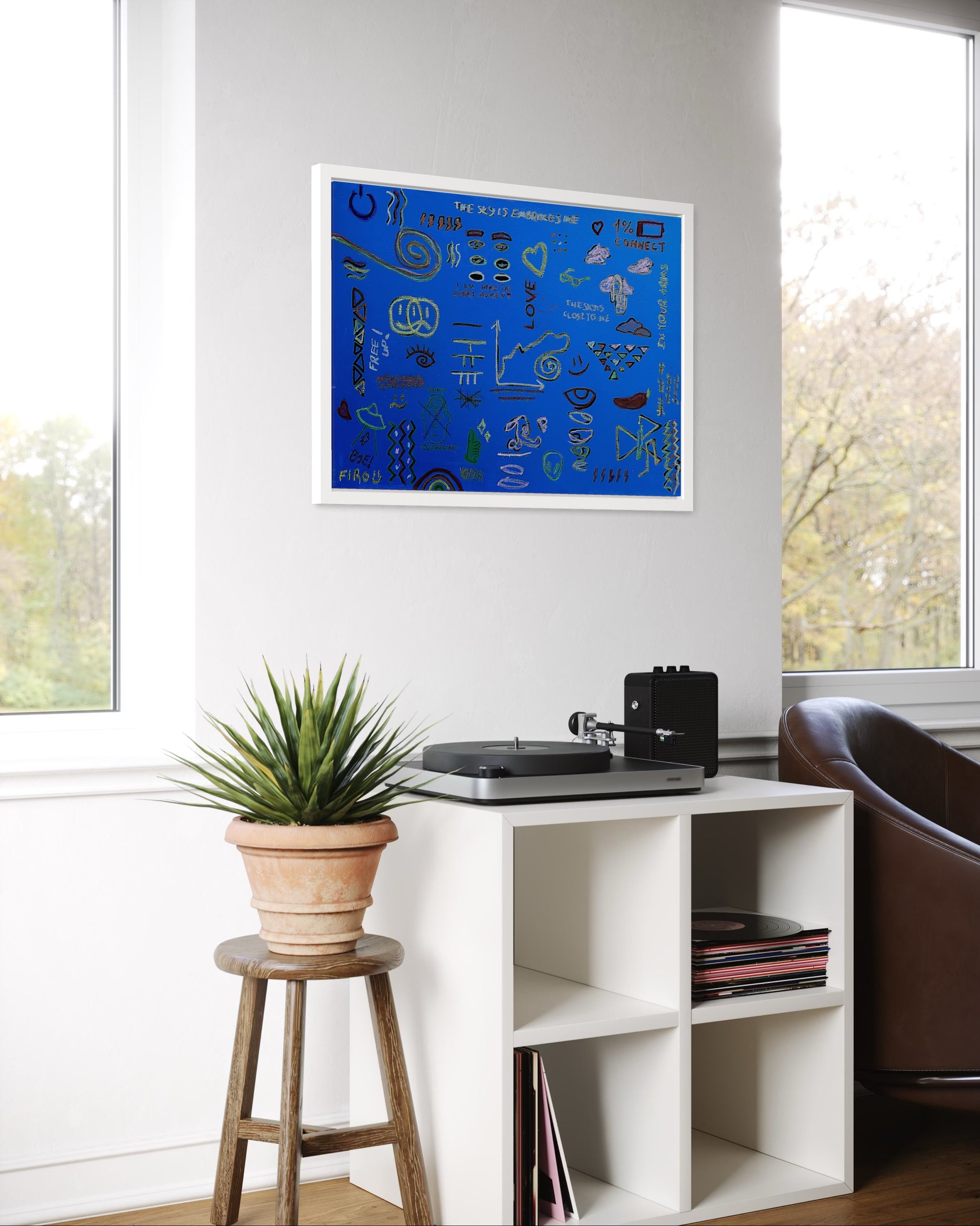 The Inner Embrace (50x70 cm) is an inner map constructed with acrylic and pastel traces on an electric blue background. Spiral and eye motifs, stairs, lightning, clouds, hearts, and directional arrows appearing on the surface, combined with short notes ( “The sky is embracing me,” “I am here in every moment,” “1% connect” ), invite the viewer into an inner dialogue .