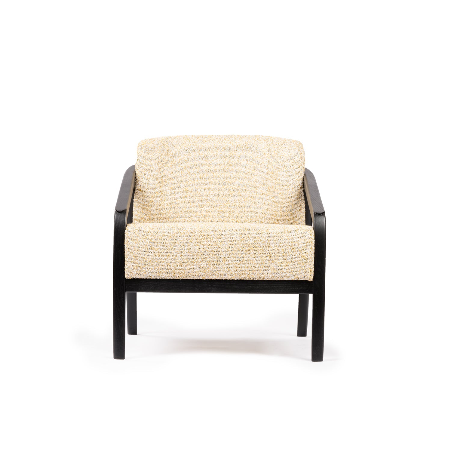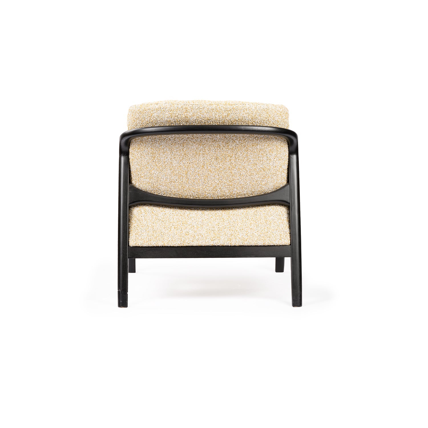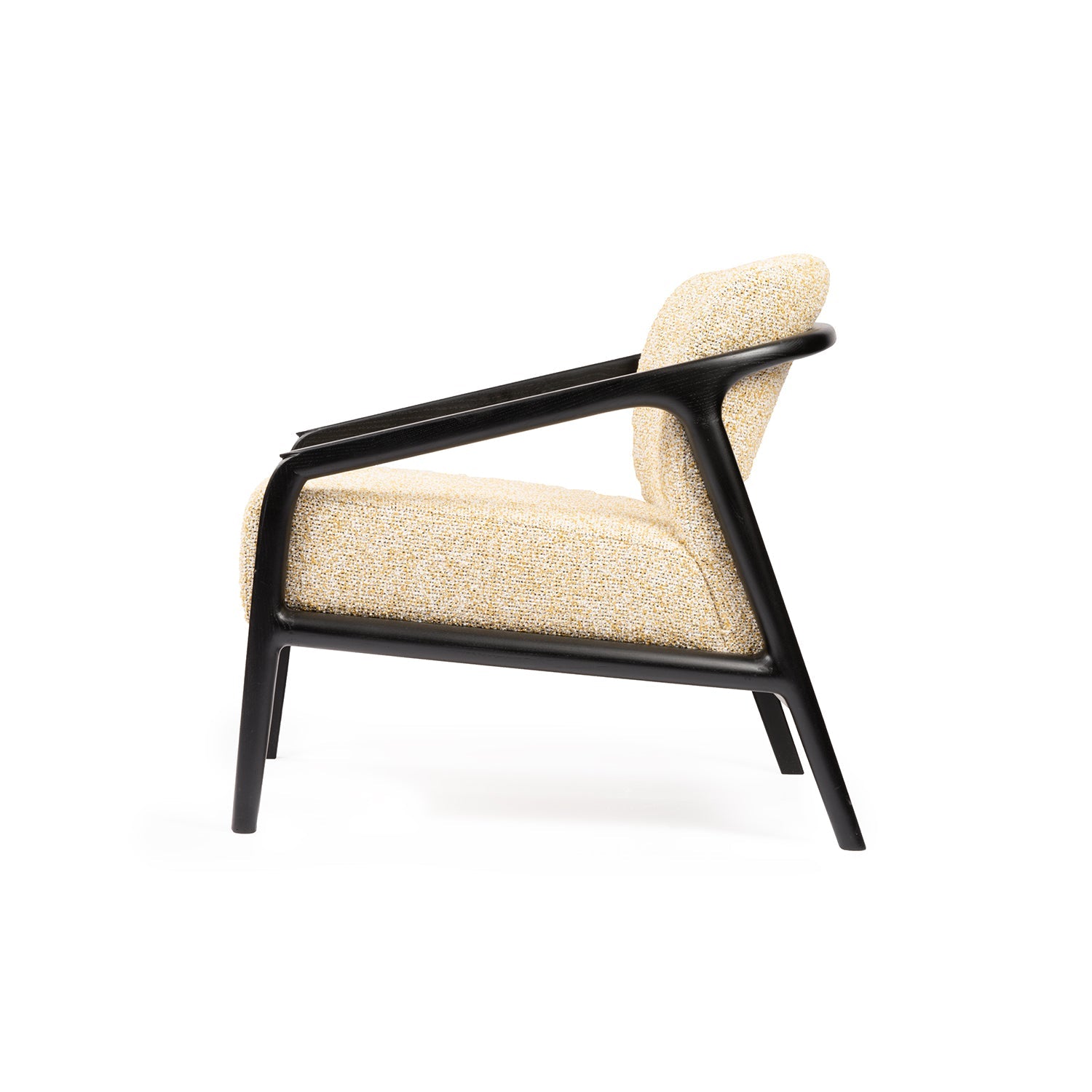 Hitit is an armchair with a chestnut wood body and fixed fabric upholstery. The wood body provides a warm touch and a natural look, while the fabric upholstery offers a comfortable seating experience. This combination creates a visually appealing piece of furniture and provides comfort to the user.