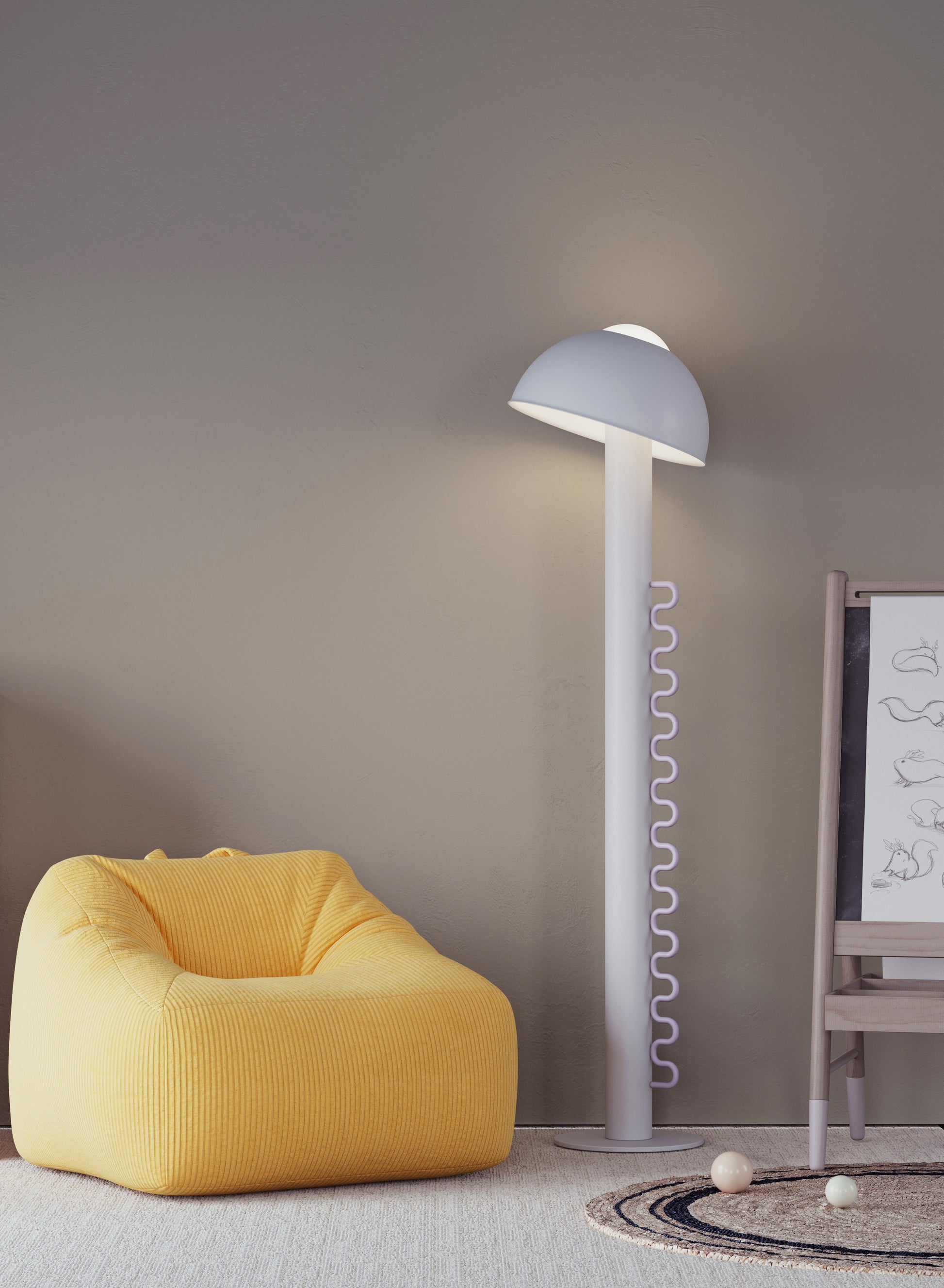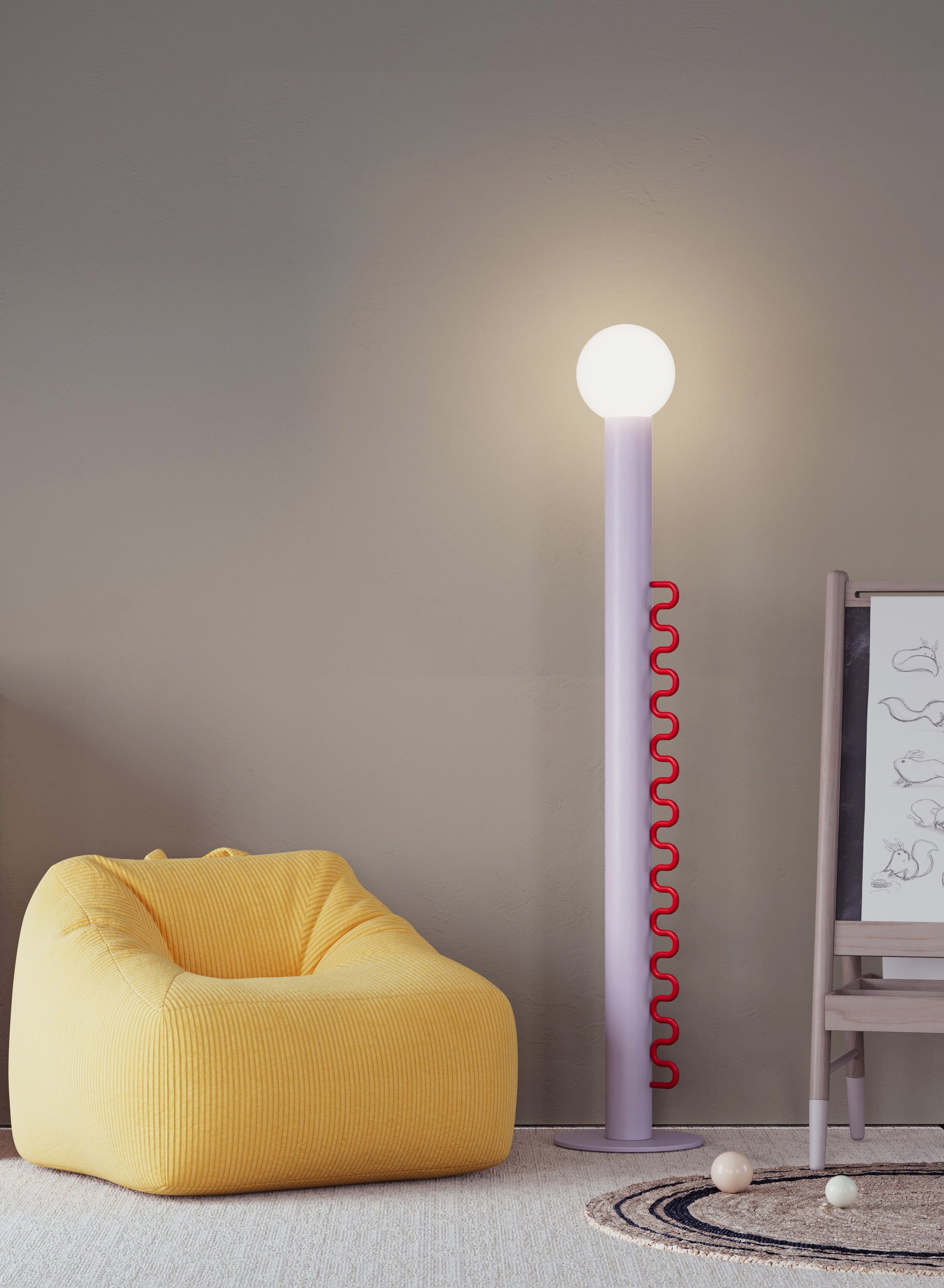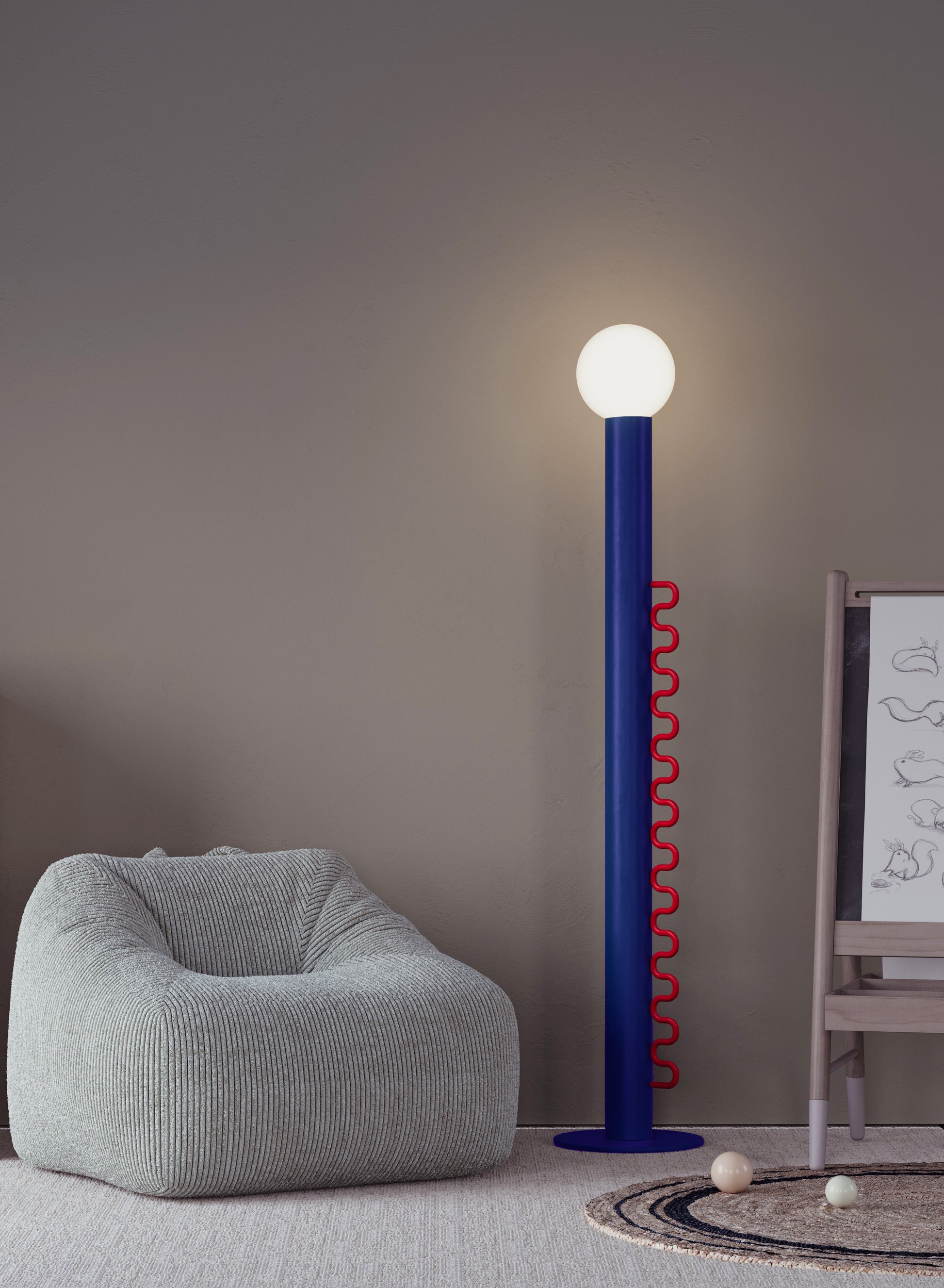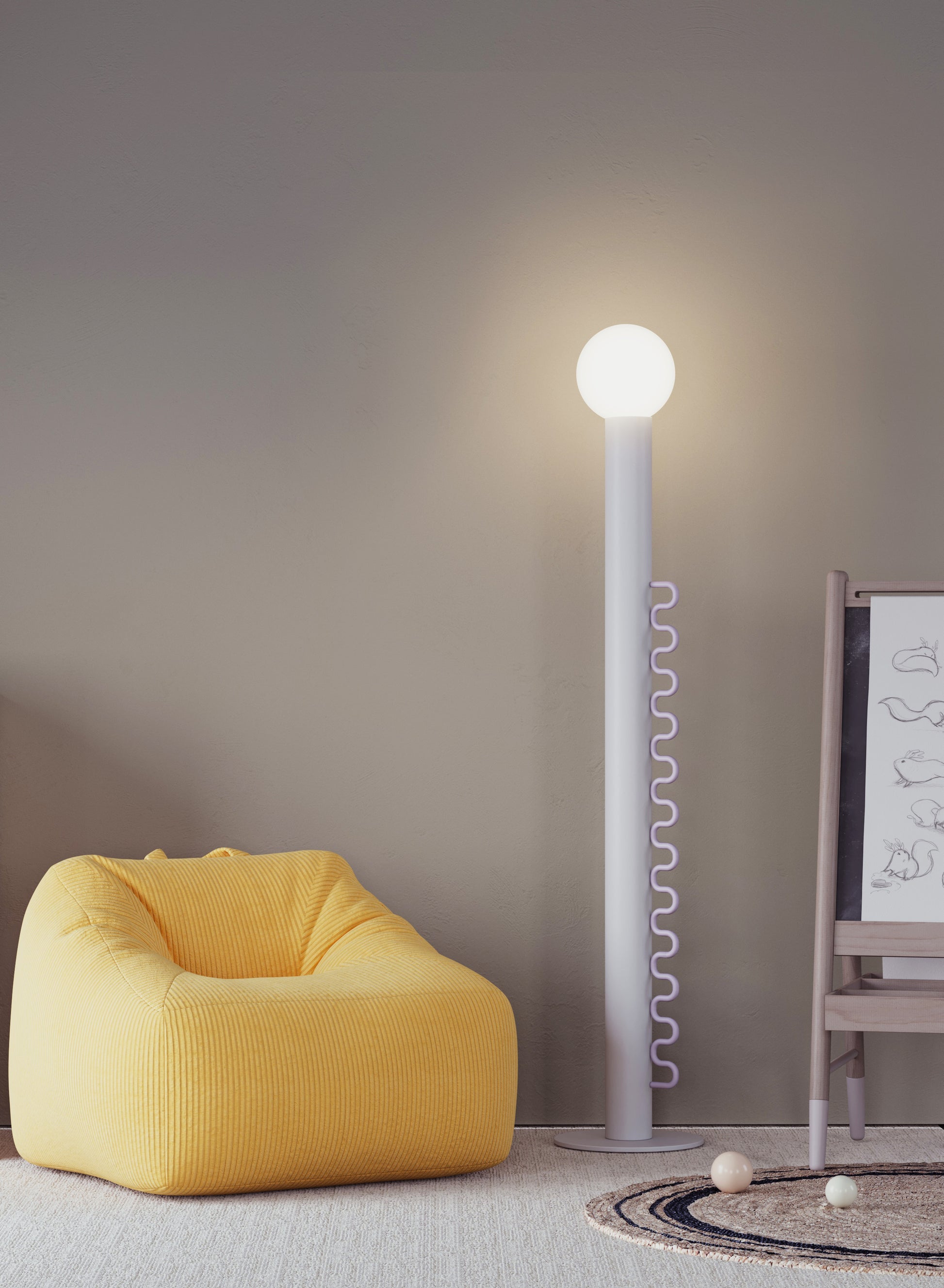 Wave lighting is an ideal solution for children's rooms and colorful, fun environments. It attracts attention with its stylish and functional design. The cap can be removed when desired or adjusted to different angles to control the direction of the light. The cap balanced on the opal sphere allows the light to be directed in the desired direction. Thanks to its dimmable feature, the light brightness can be adjusted precisely, so the atmosphere of the environment can be easily arranged. Its fun and interactive design makes it enjoyable to use, while providing functionality with simple adjustment and dimming controls. Wave adapts to both children's rooms and colorful spaces with its modern design and innovative features.