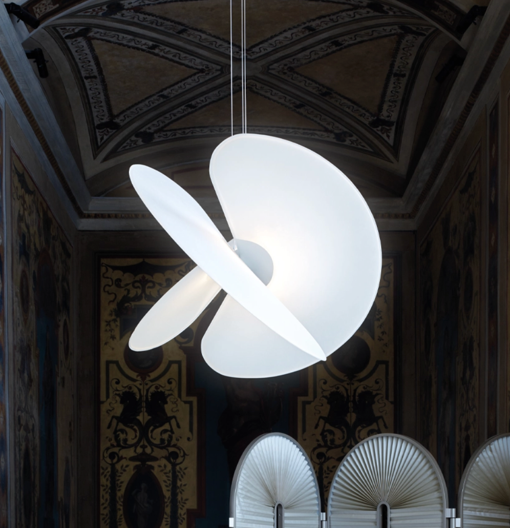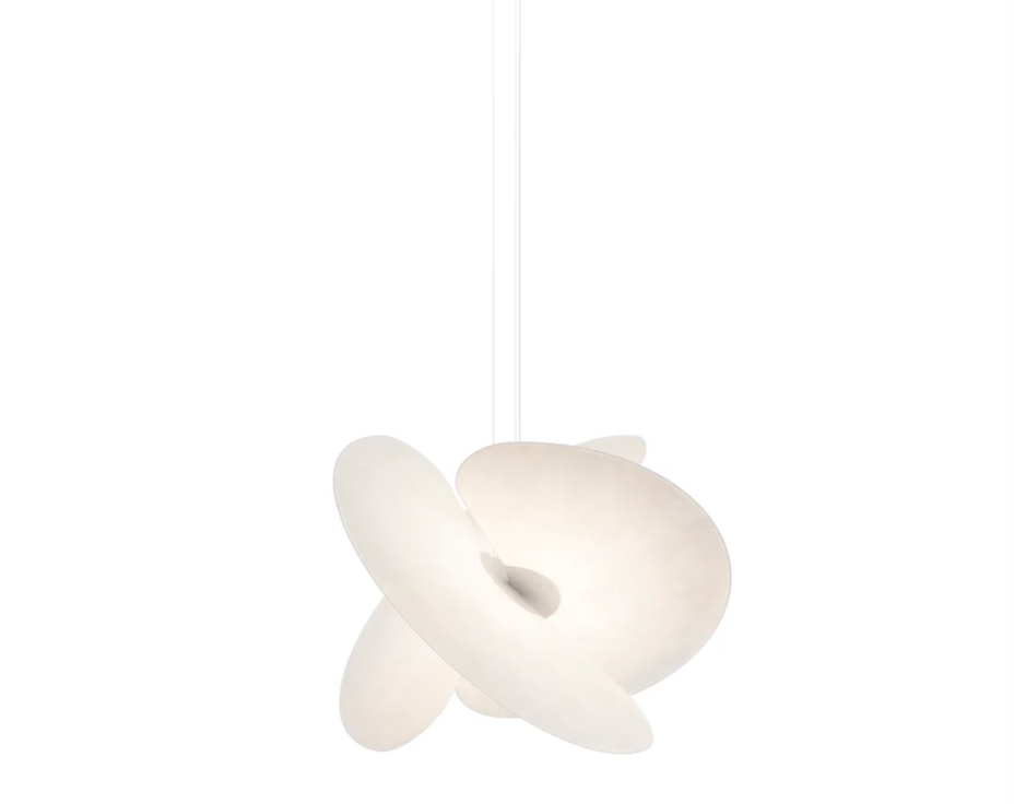 Üç büyük yelpazenin kesişiminden oluşur ve tasarım dünyasında alışılmadık bir malzeme kullanır — aslında gıda endüstrisinden gelen, pirinç kâğıdını andıran bu malzeme, ışığı mekânın tamamına homojen şekilde yayma özelliğine sahiptir.