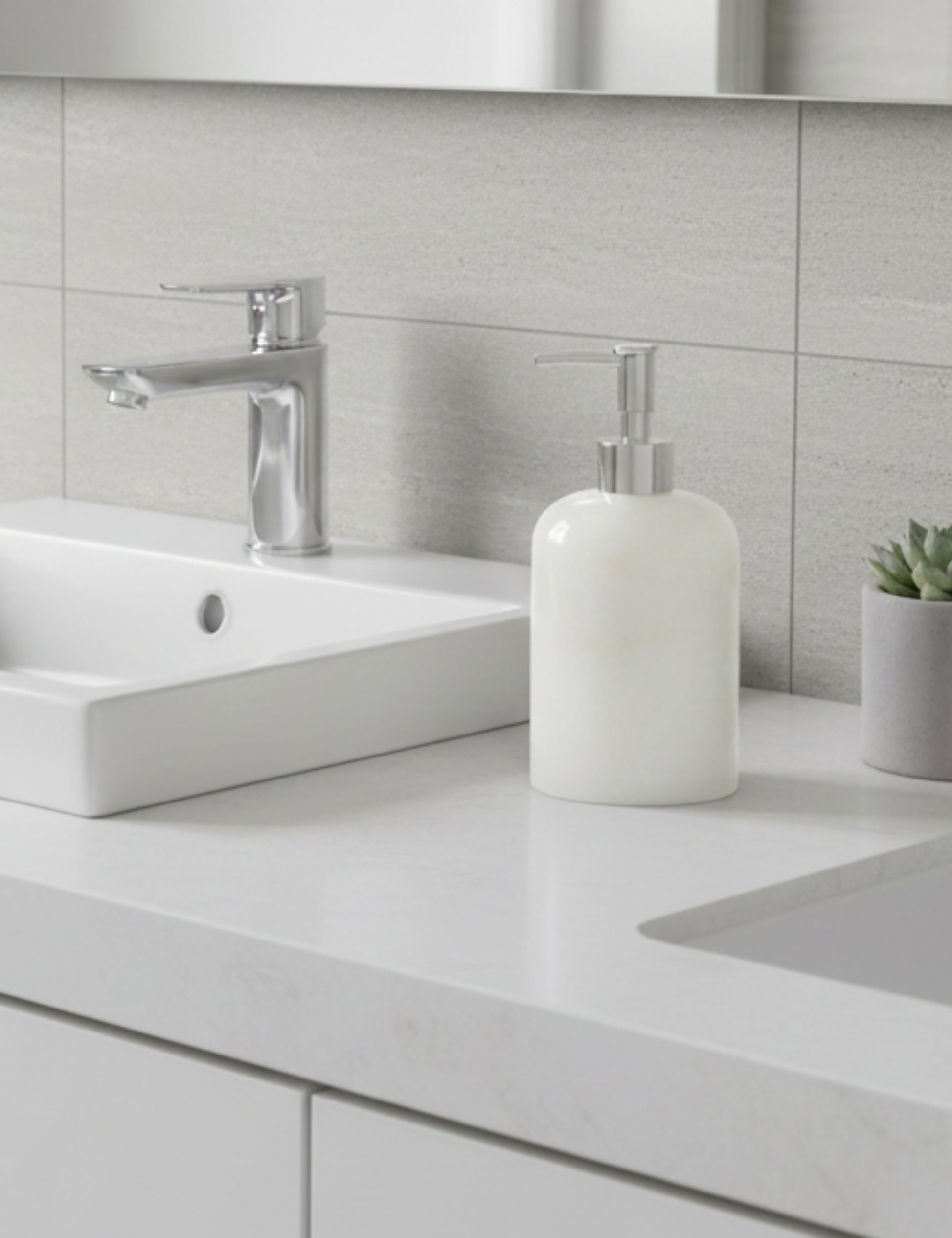 The natural, pale white tone of marble adds warmth and organic texture to the bathroom ambiance. Its cylindrical, soft-lined bottle shape, combined with the weight and feel of the natural material, gives the product a lasting and timeless feel.