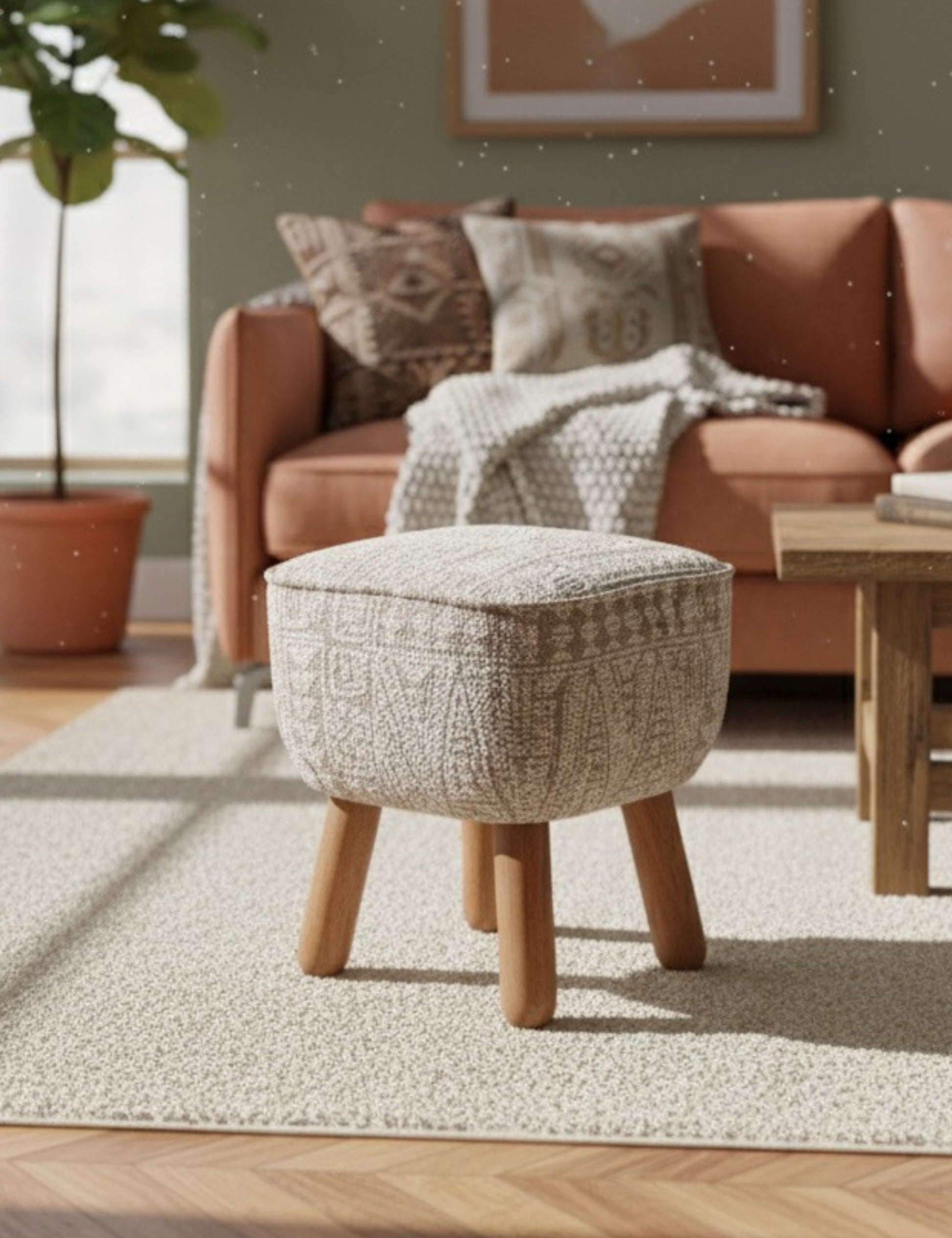 Mythology combines ethnic lines with traditional patterns from different cultures and natural materials to create a warm and sophisticated atmosphere in the home. The pouf becomes a focal point against the room's simple backdrop.