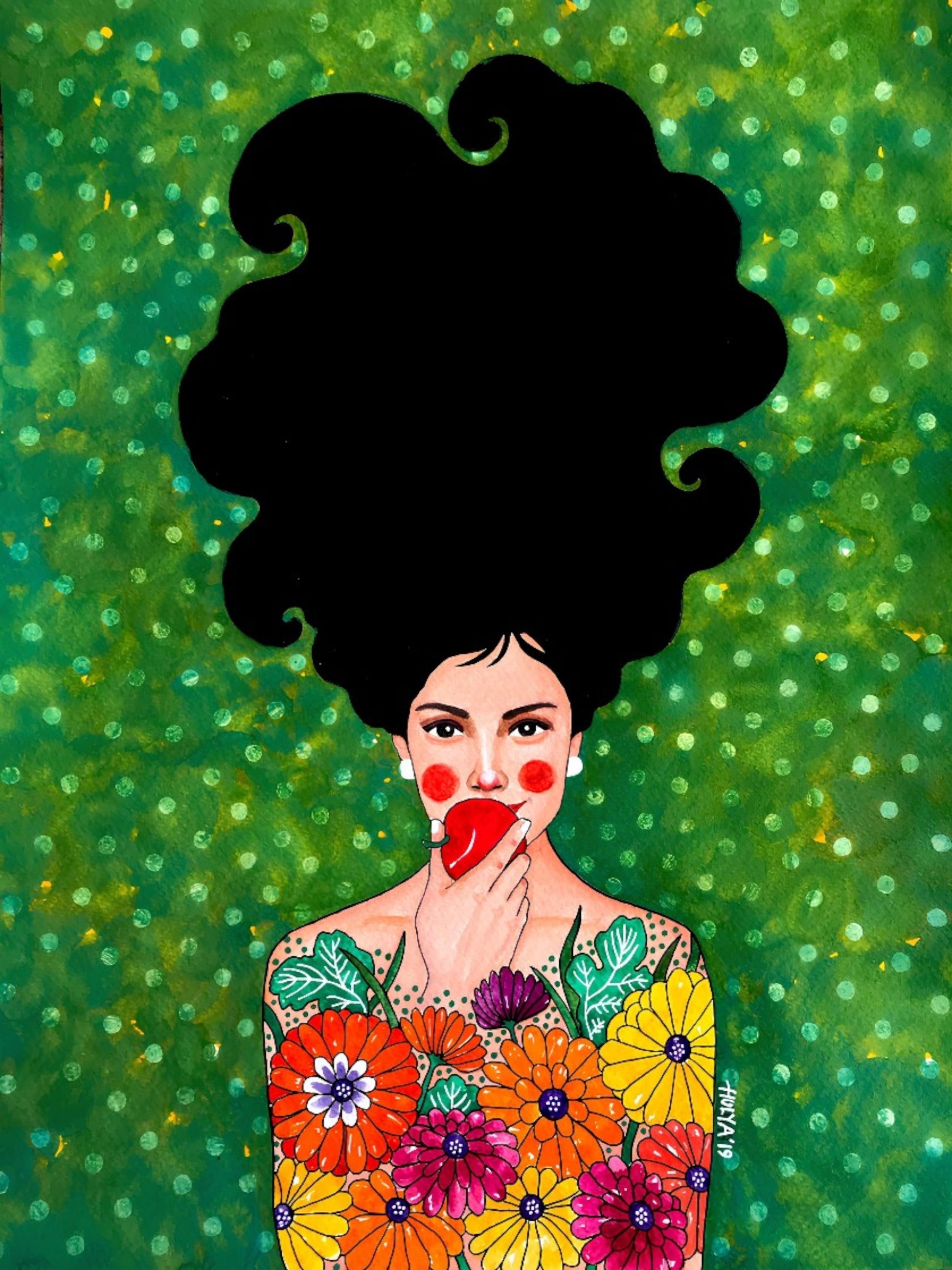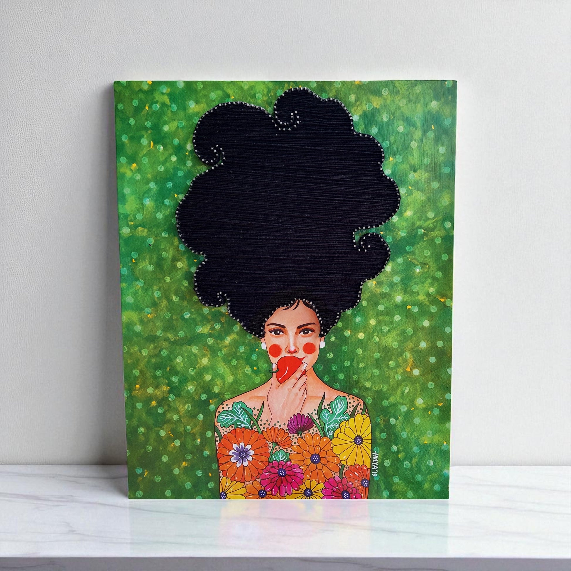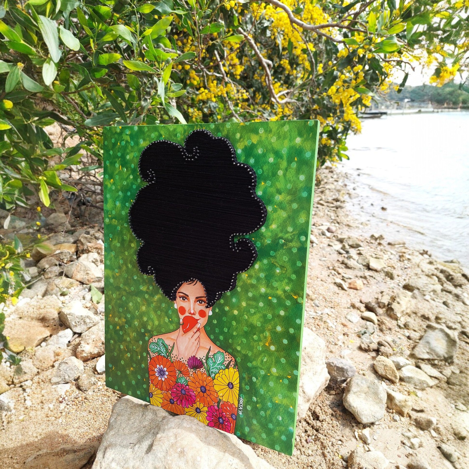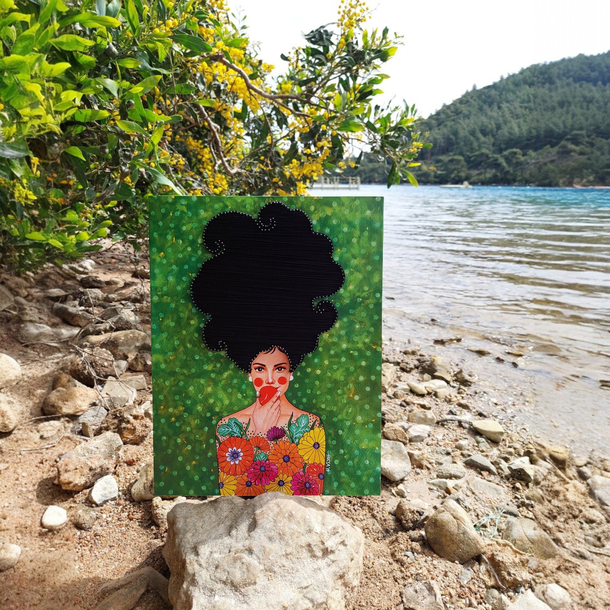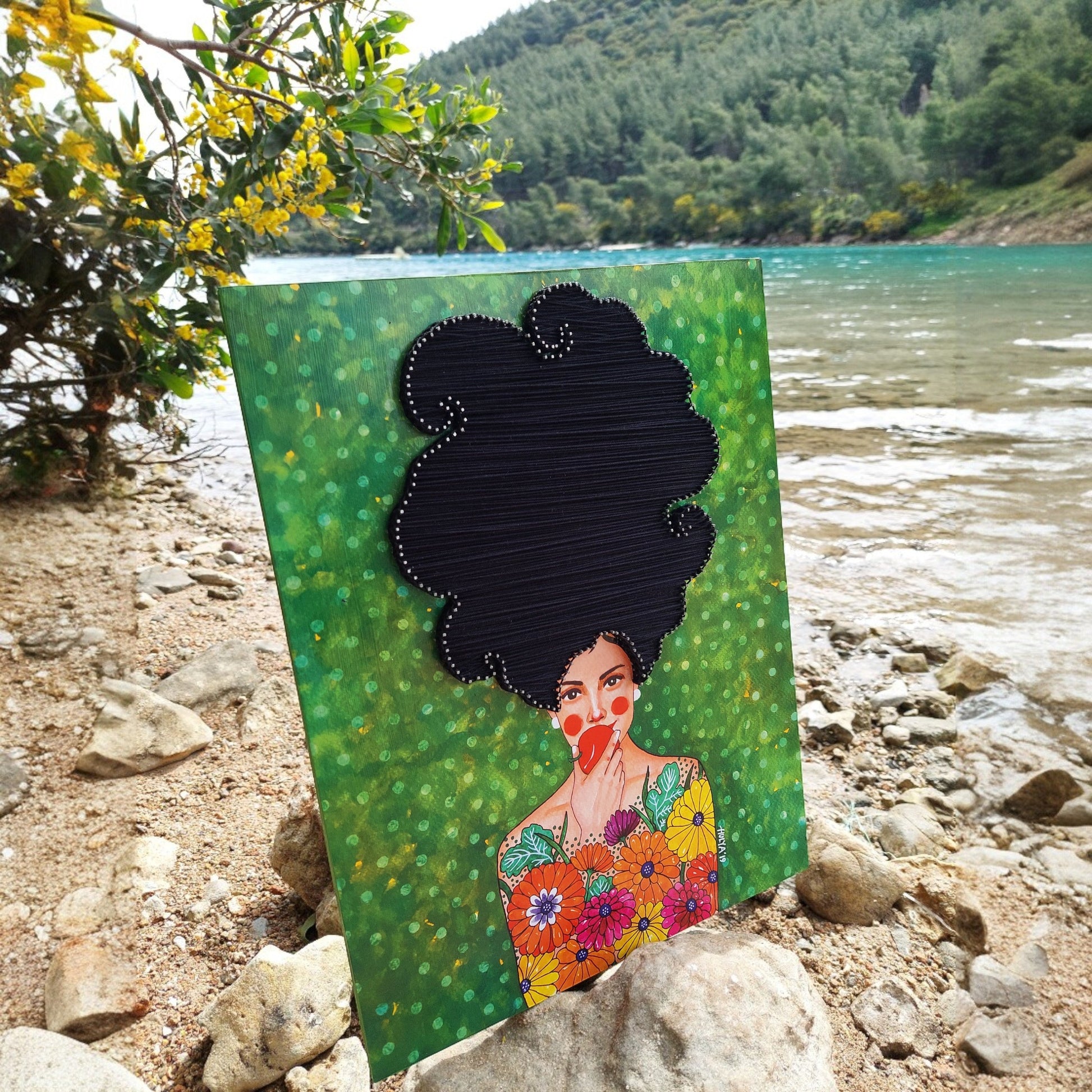 *İllüstrasyon sanatçısı Hülya Özdemir'in sulu boya ile yapmış olduğu birbirinden özgün kadın portelerinin yüksek çözünürlüklü görselini ahşaba aktarıp saç kısmında çivi ve ip kullanarak string art tablosu yapılmıştır.