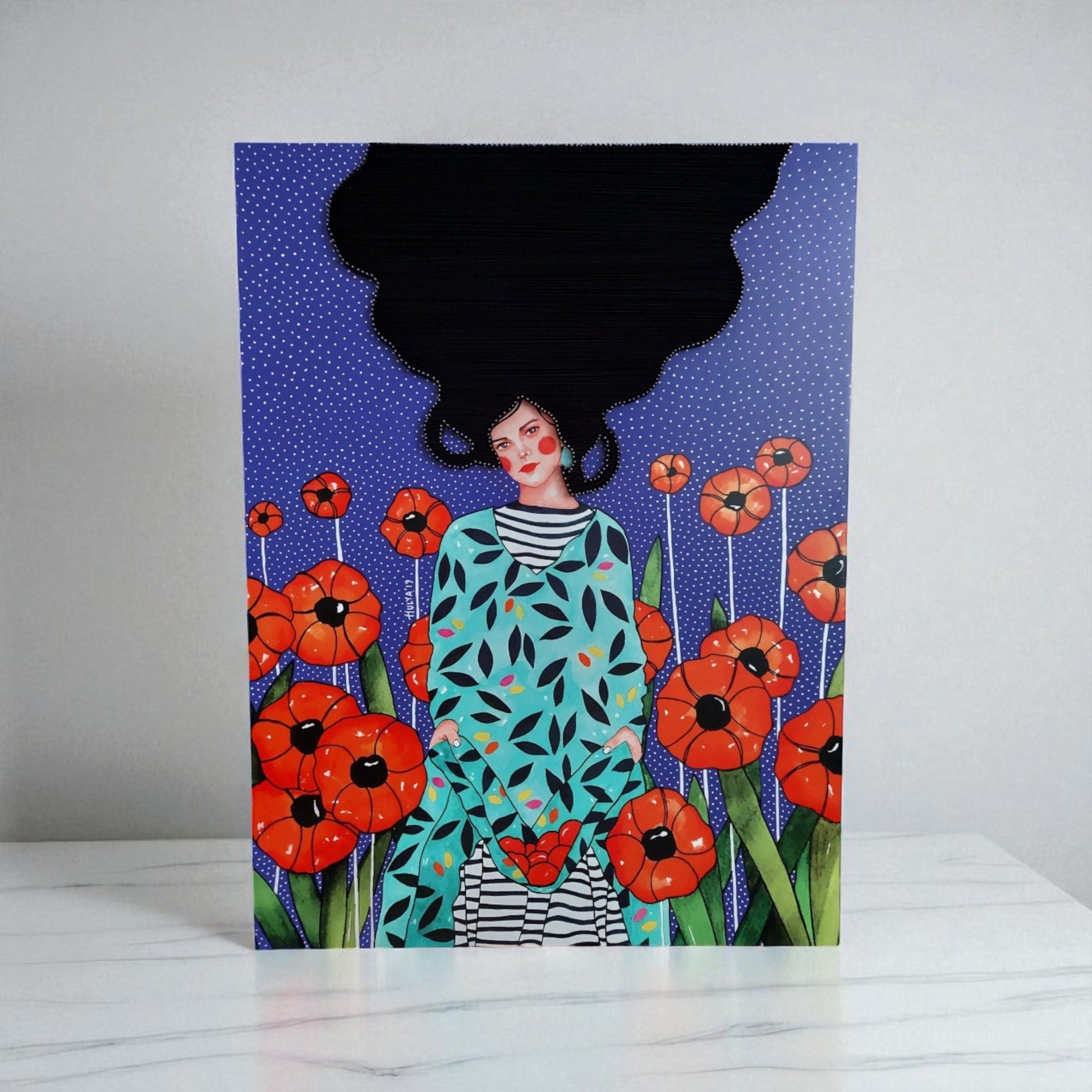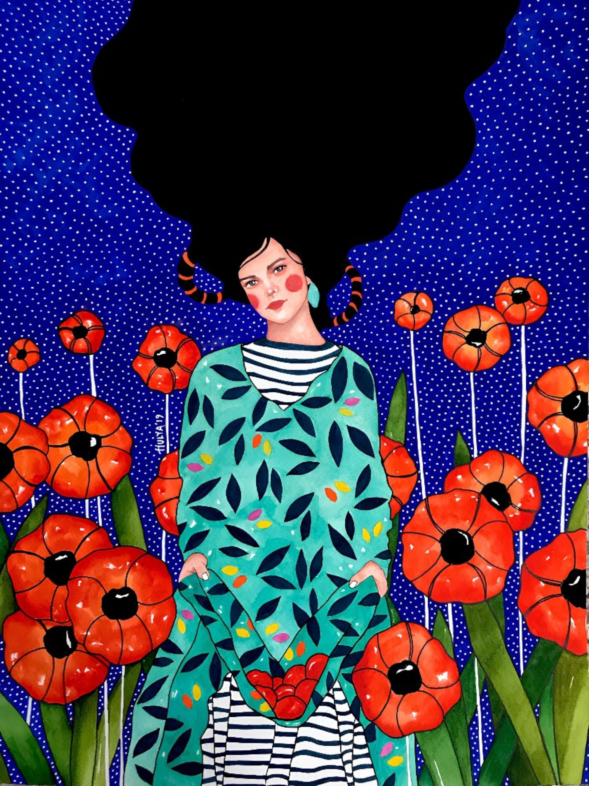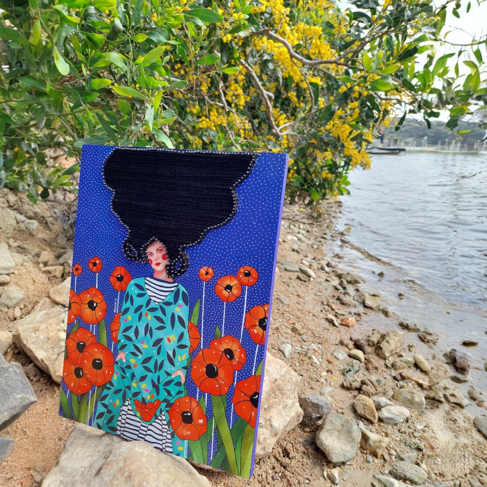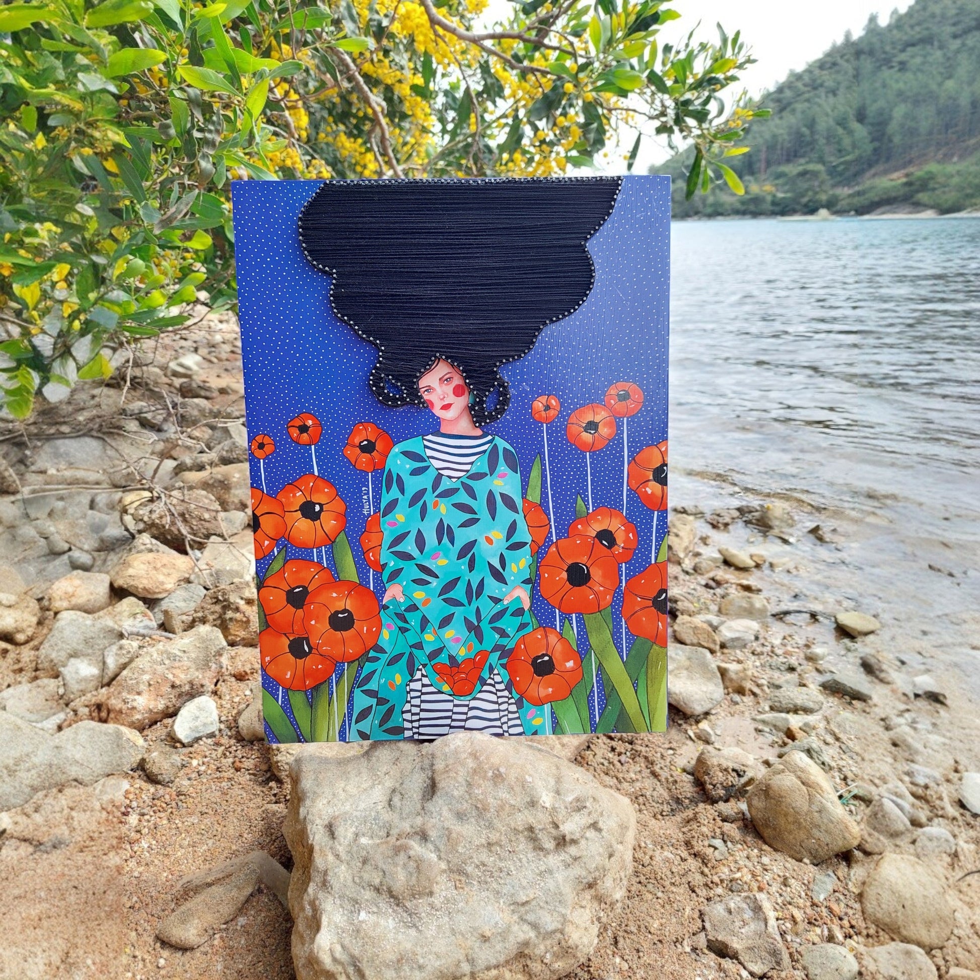 *İllüstrasyon sanatçısı Hülya Özdemir'in sulu boya ile yapmış olduğu birbirinden özgün kadın portelerinin yüksek çözünürlüklü görselini ahşaba aktarıp saç kısmında çivi ve ip kullanarak string art tablosu yapılmıştır.