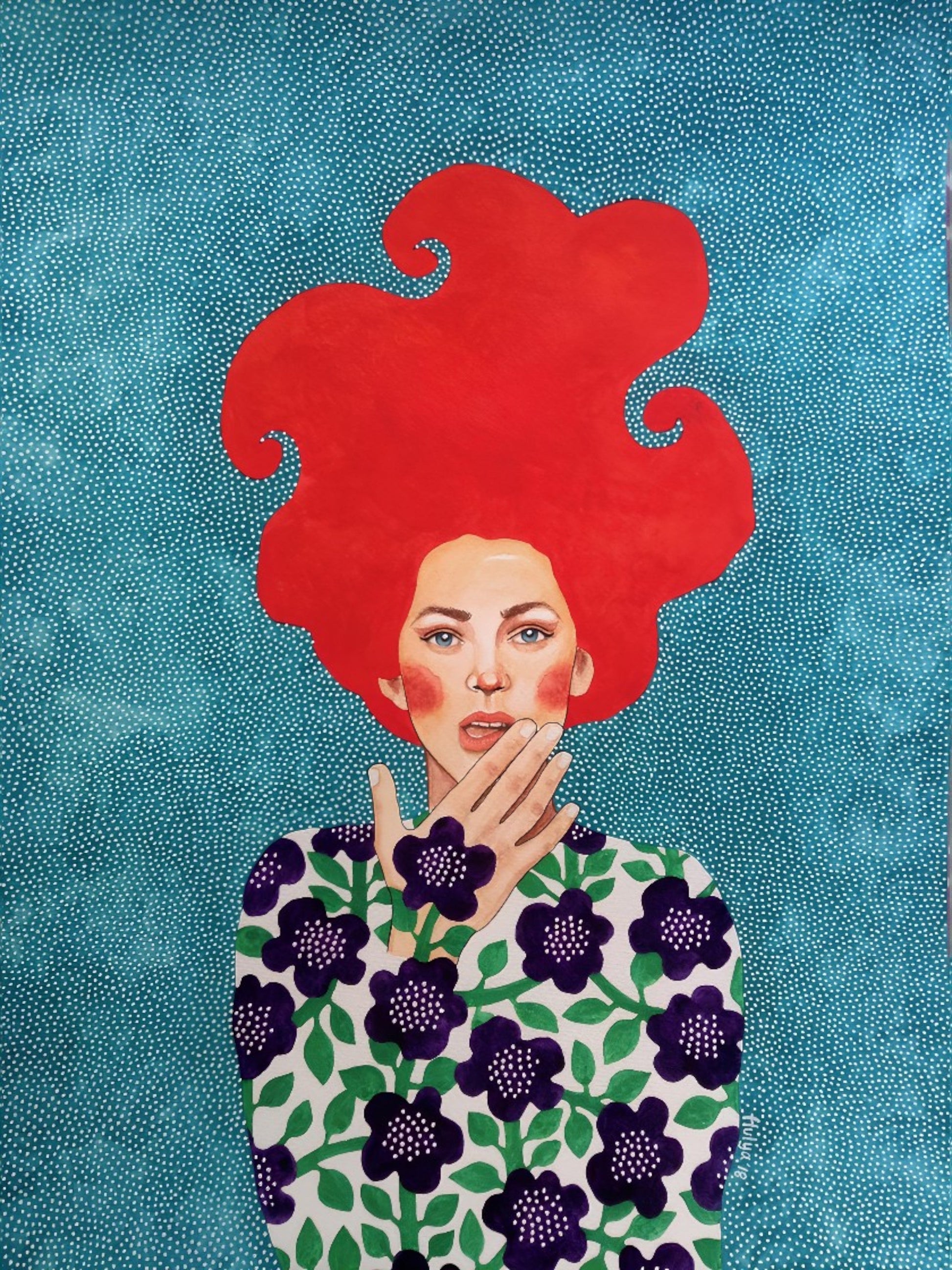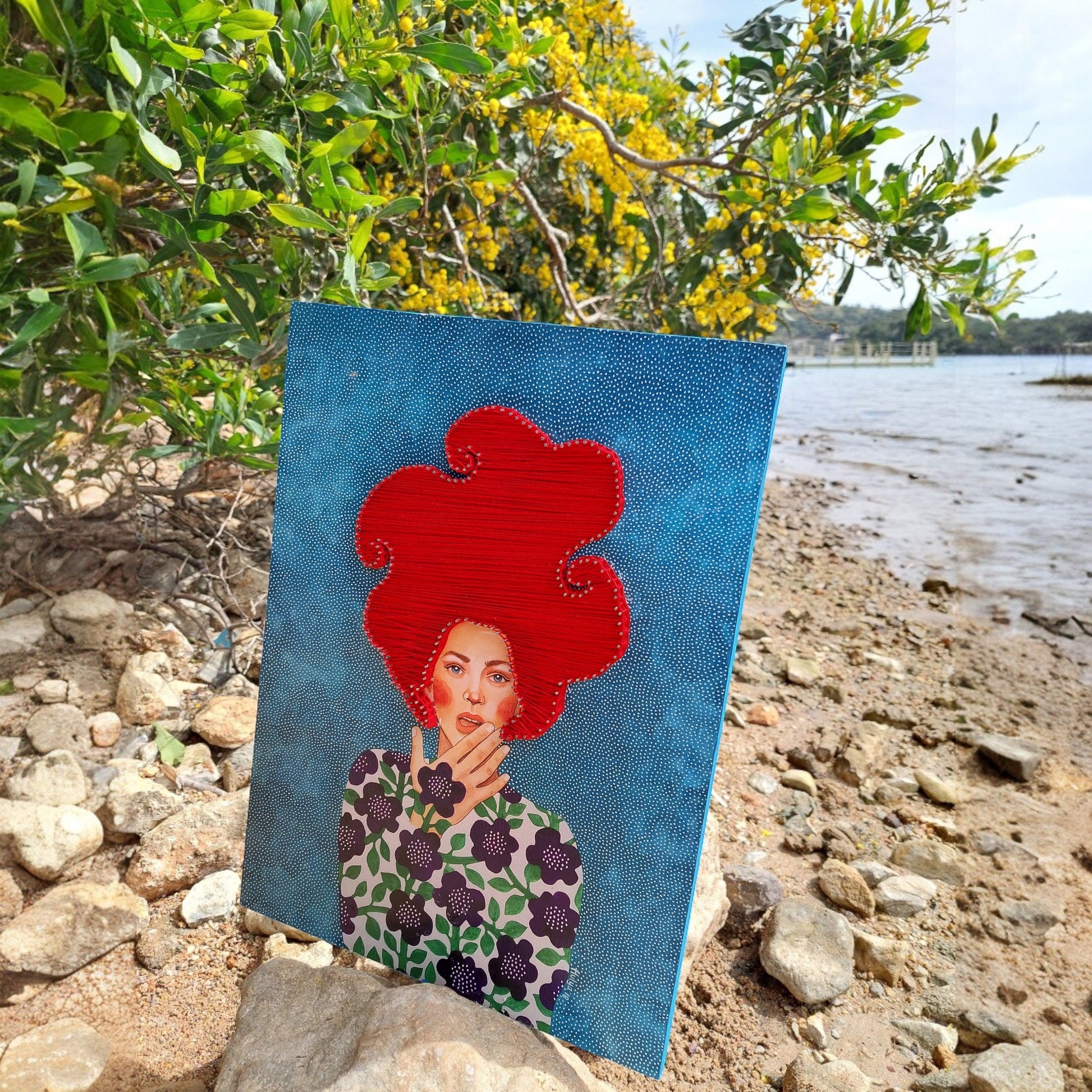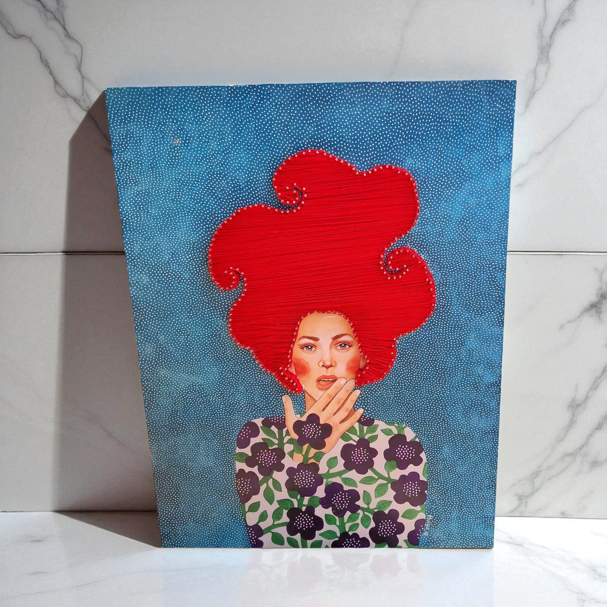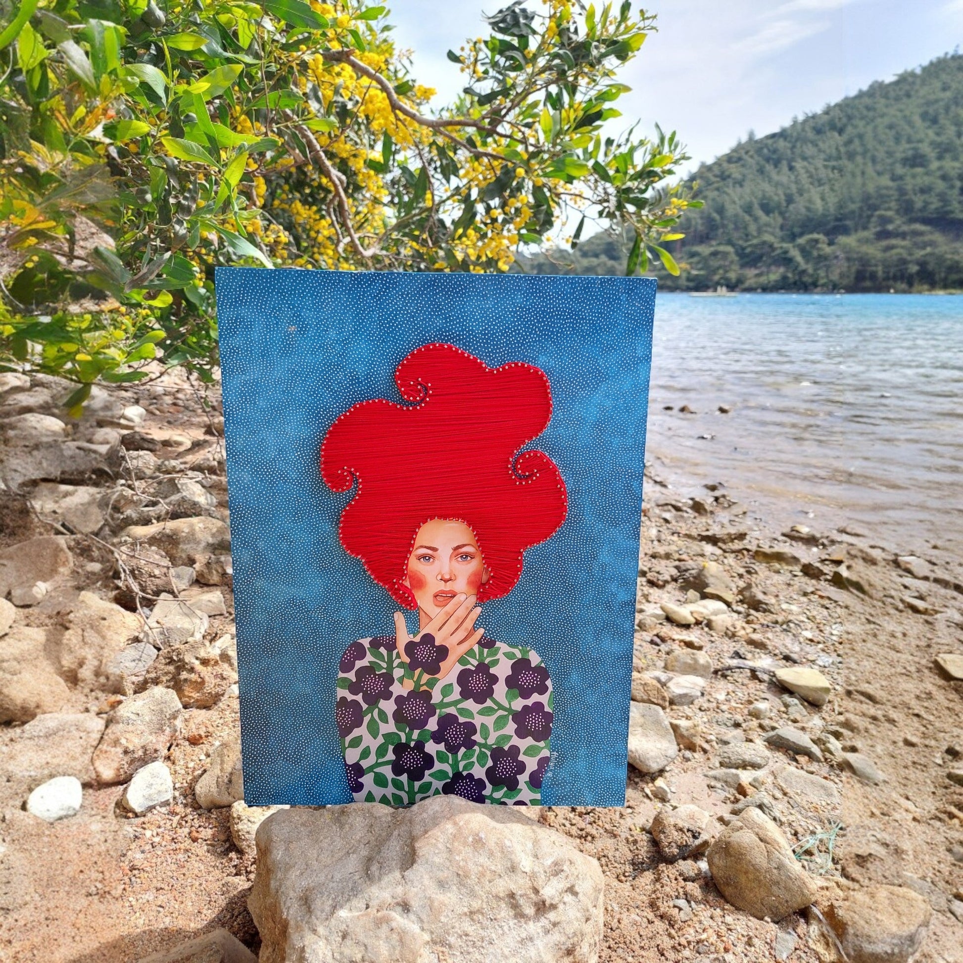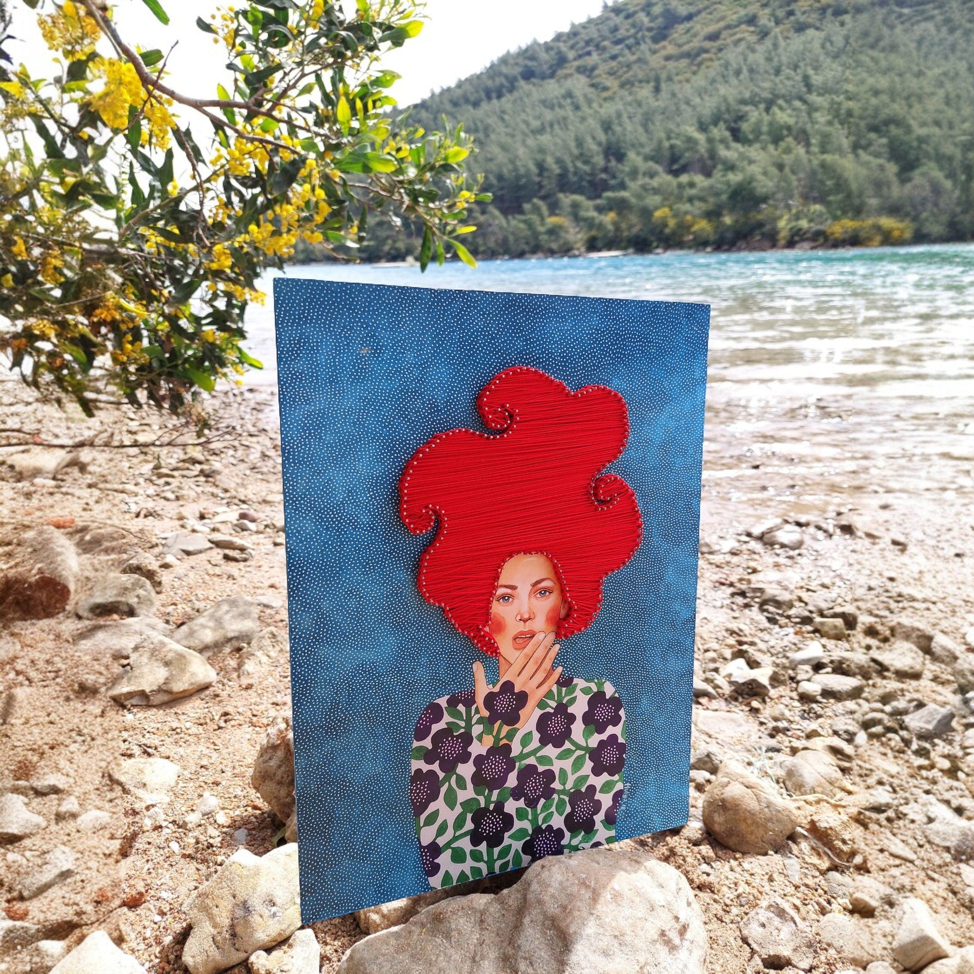 *İllüstrasyon sanatçısı Hülya Özdemir'in sulu boya ile yapmış olduğu birbirinden özgün kadın portelerinin yüksek çözünürlüklü görselini ahşaba aktarıp saç kısmında çivi ve ip kullanarak string art tablosu yapılmıştır.