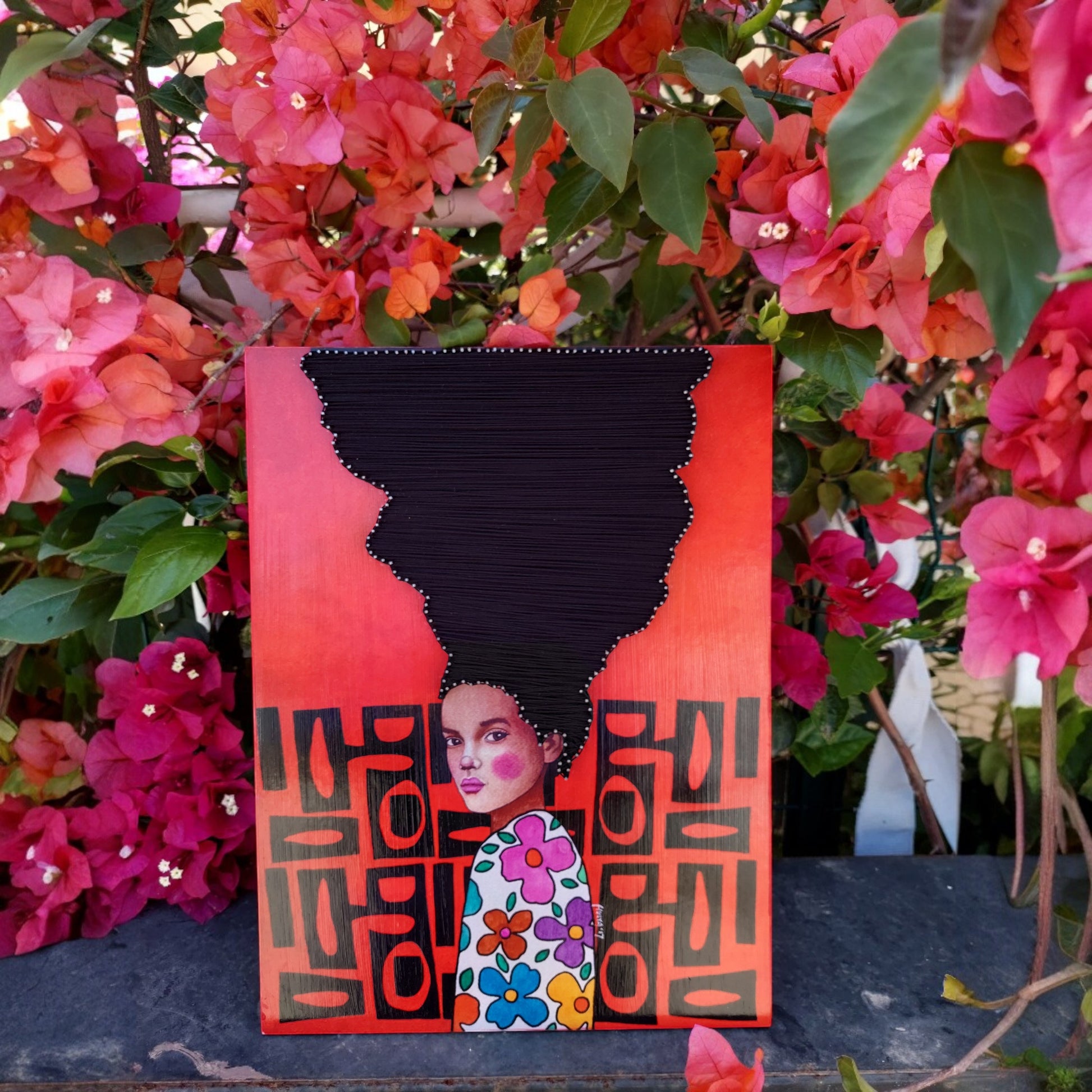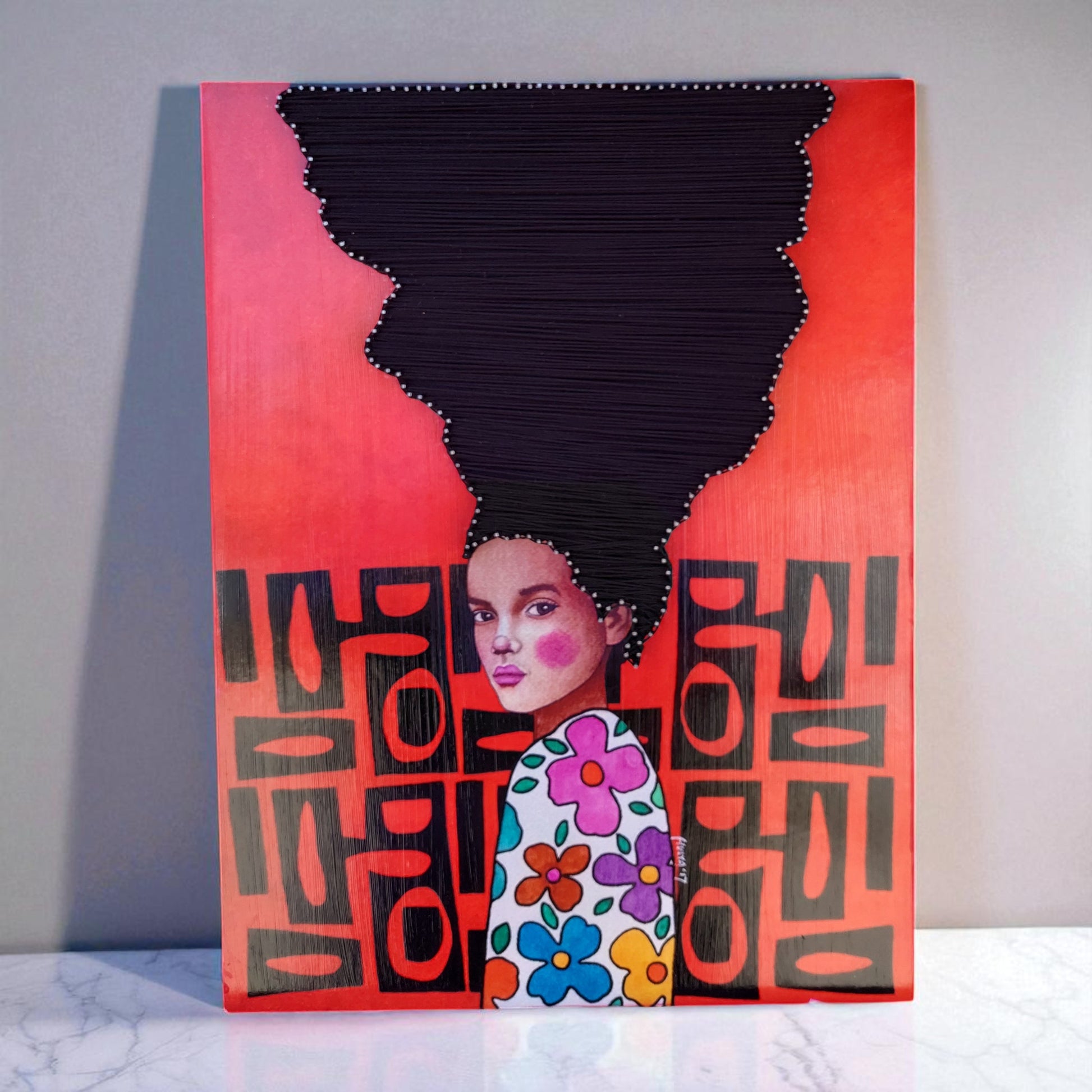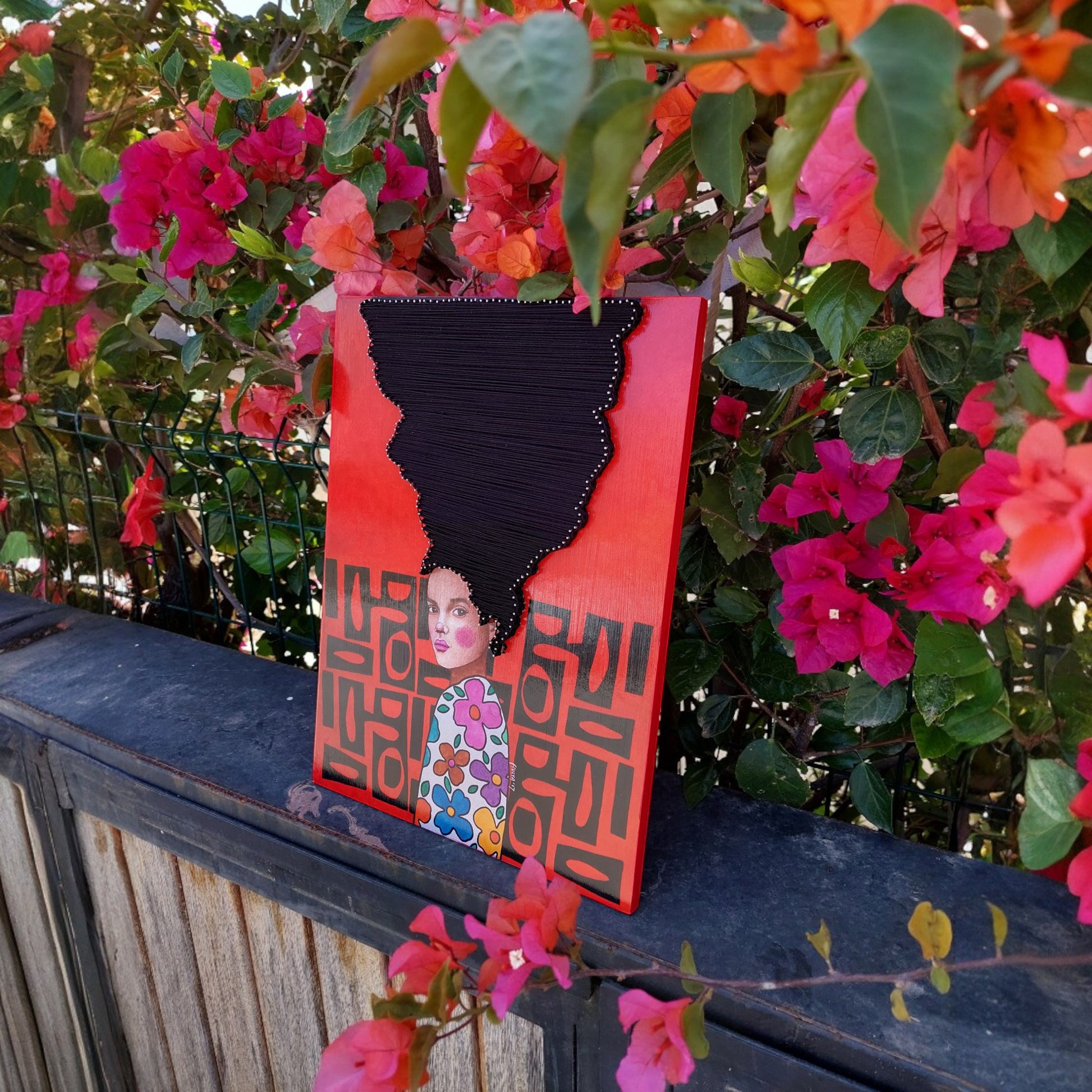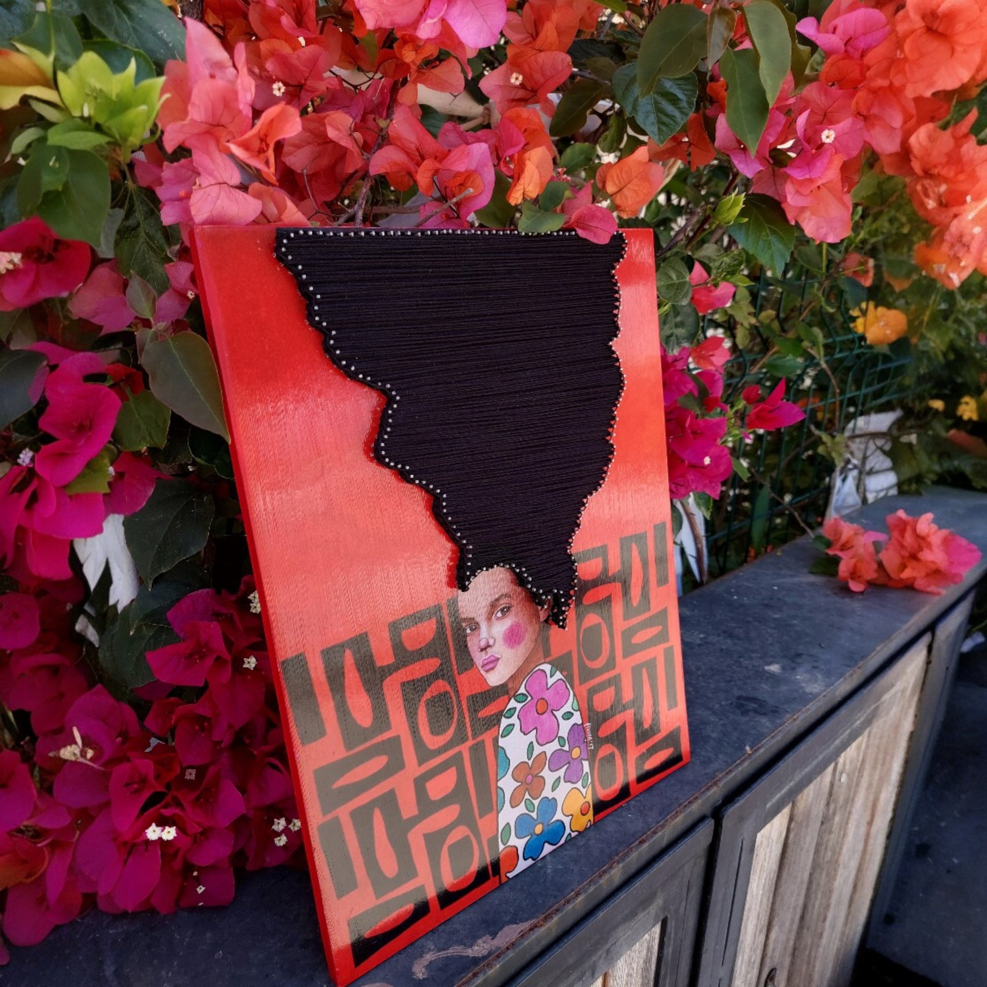*İllüstrasyon sanatçısı Hülya Özdemir'in sulu boya ile yapmış olduğu birbirinden özgün kadın portelerinin yüksek çözünürlüklü görselini ahşaba aktarıp saç kısmında çivi ve ip kullanarak string art tablosu yapılmıştır.