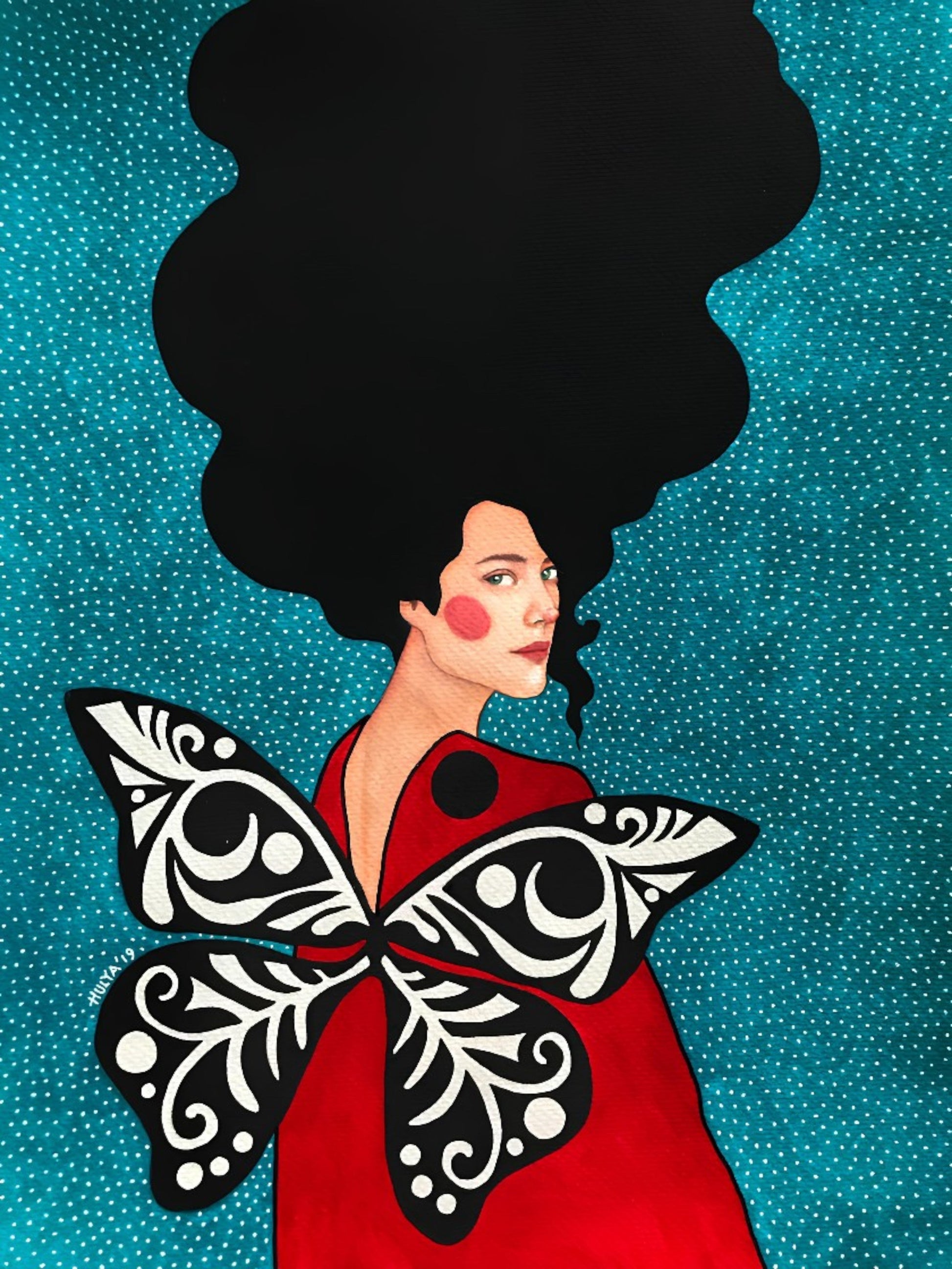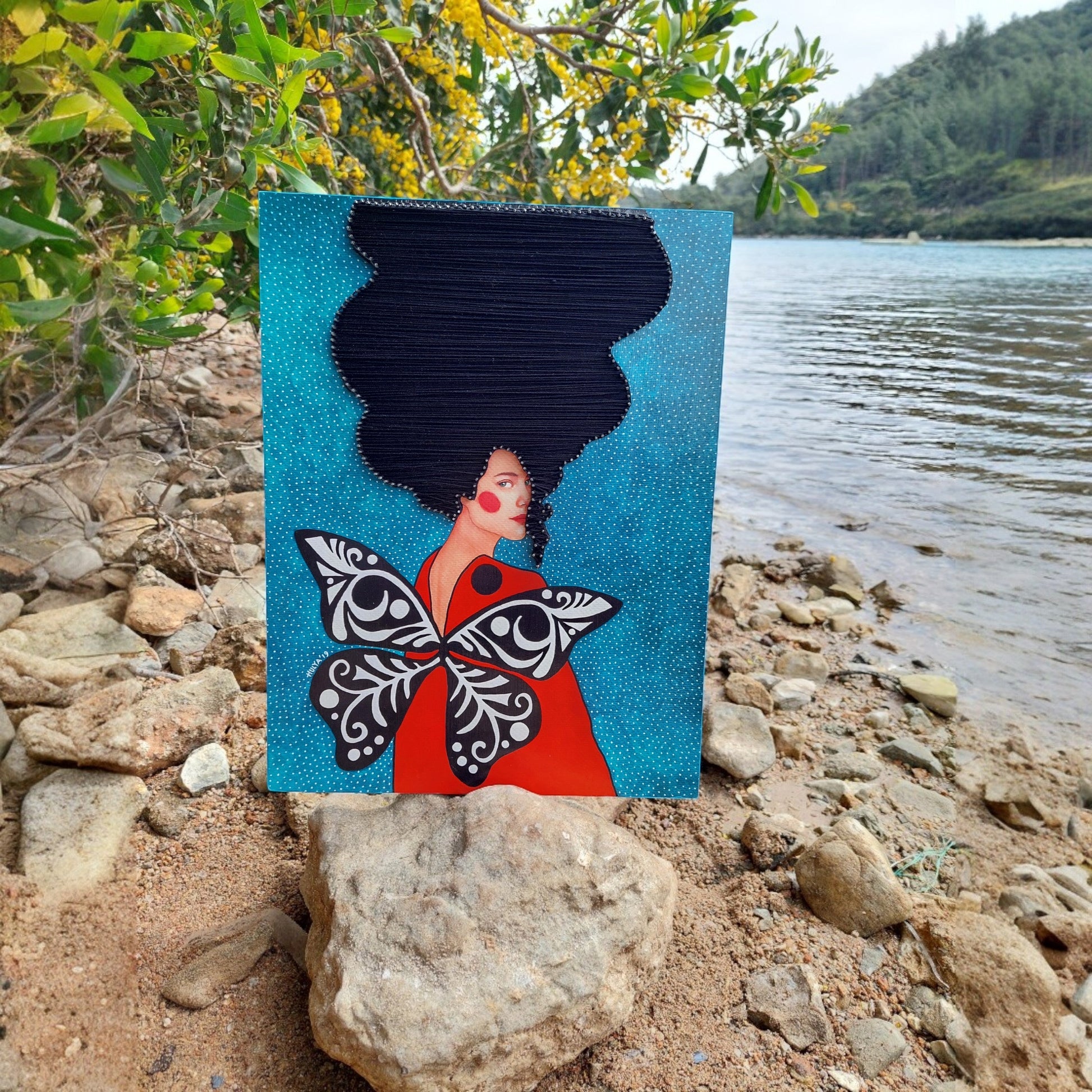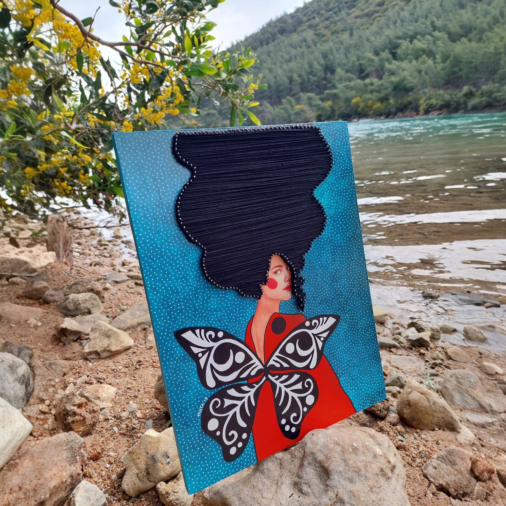 *İllüstrasyon sanatçısı Hülya Özdemir'in sulu boya ile yapmış olduğu birbirinden özgün kadın portelerinin yüksek çözünürlüklü görselini ahşaba aktarıp saç kısmında çivi ve ip kullanarak string art tablosu yapılmıştır.