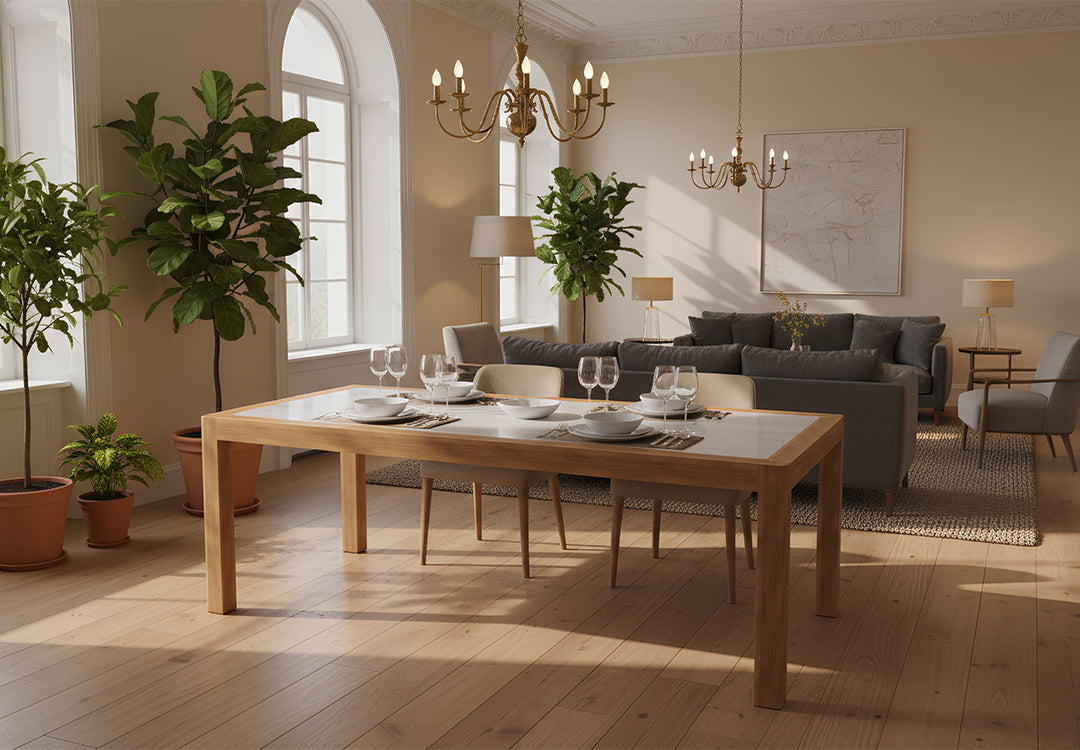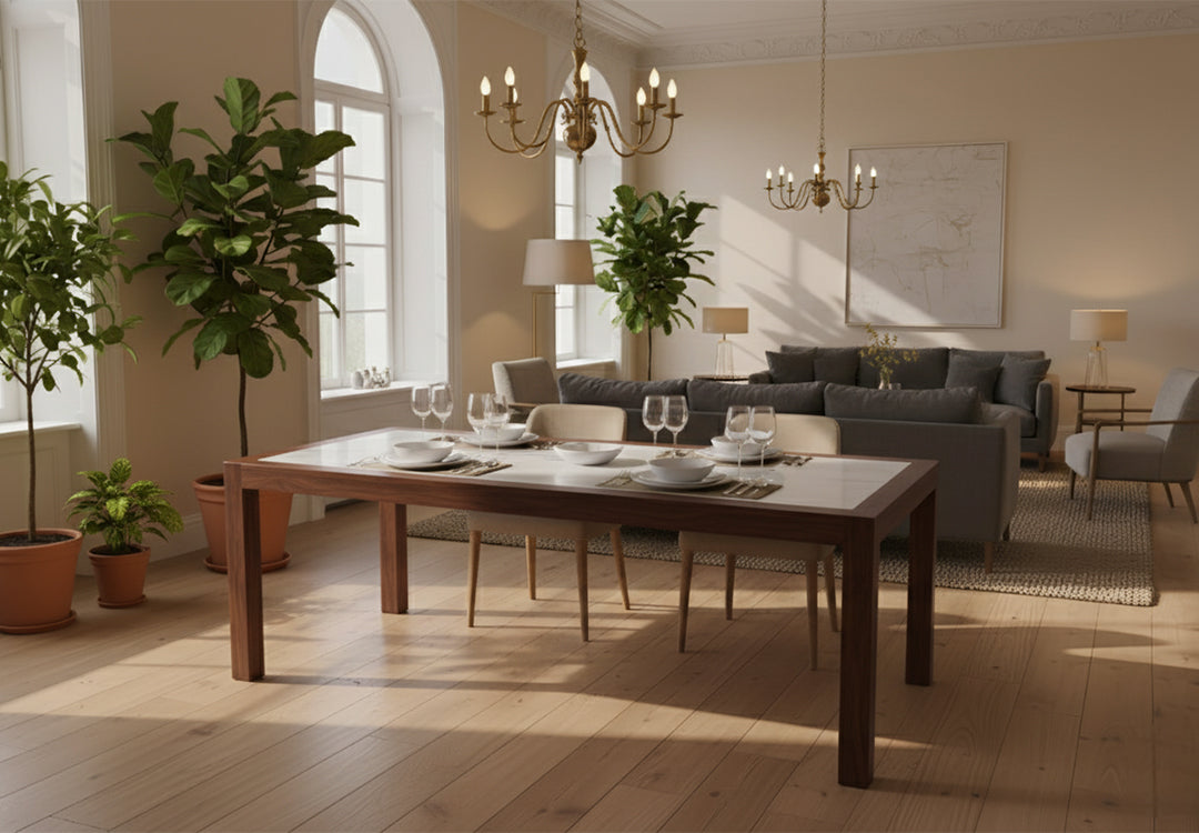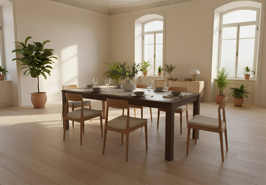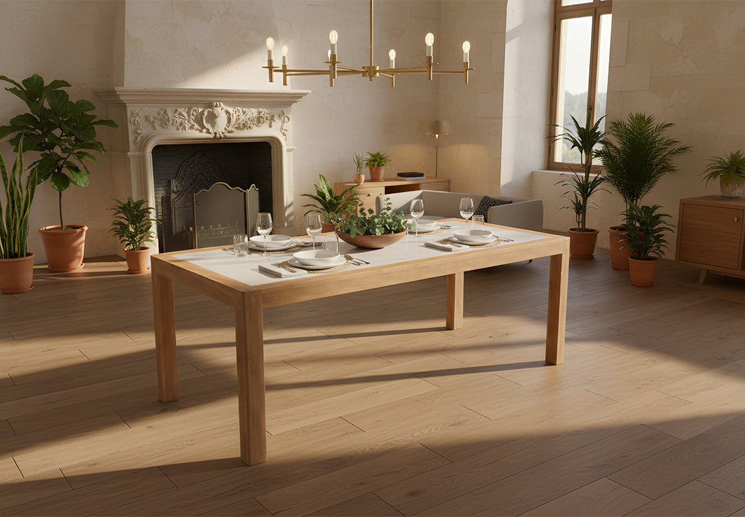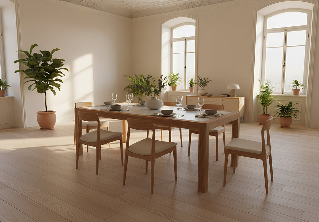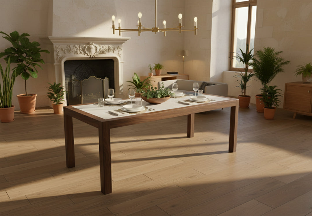 Noma masa, yalın formuyla öne çıkan çağdaş bir tasarım anlayışı sunuyor. Mermer yüzeyin doğal dokusu ile masif ahşabın sıcaklığı zarif bir çerçevede buluşuyor. El işçiliğiyle üretilen bu masa, net çizgileri ve dengeli duruşuyla hem estetik hem de zamansız bir karaktere sahip. Noma, sakin ama güçlü bir ifade arayan yaşam alanları için tasarlandı.