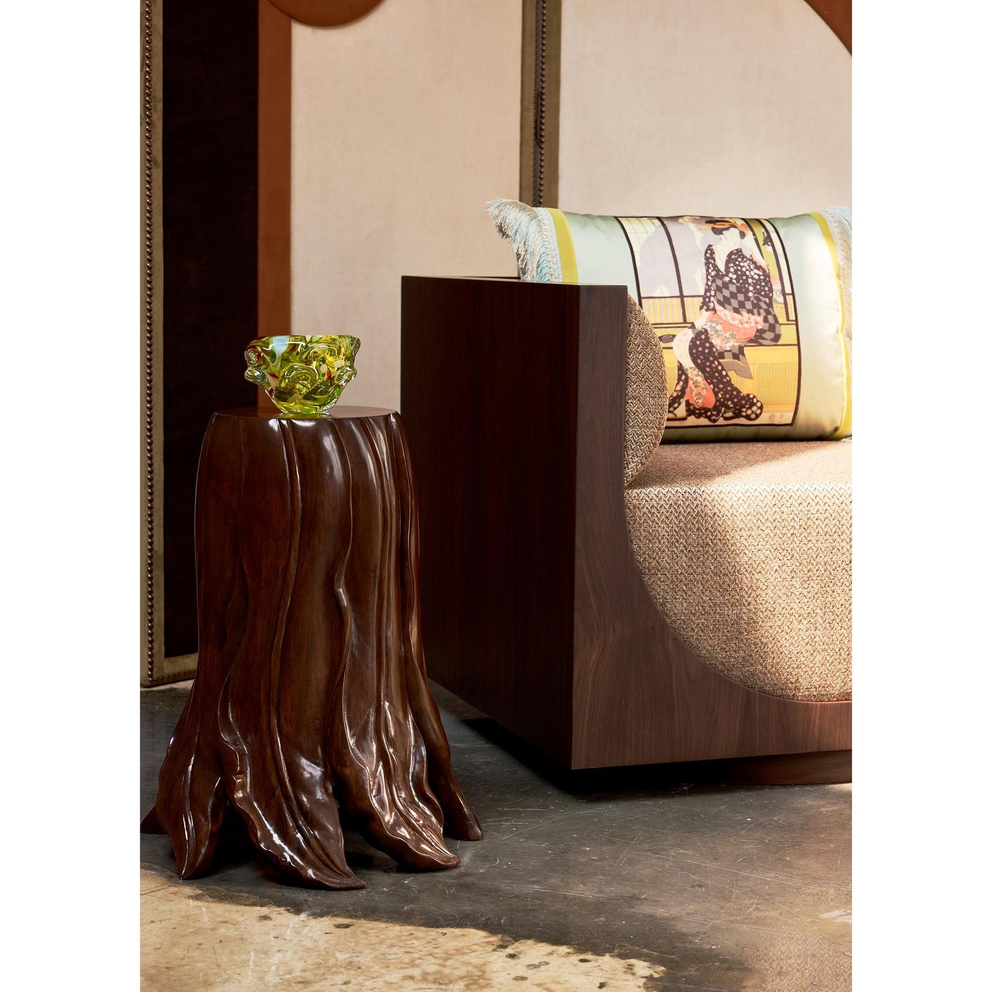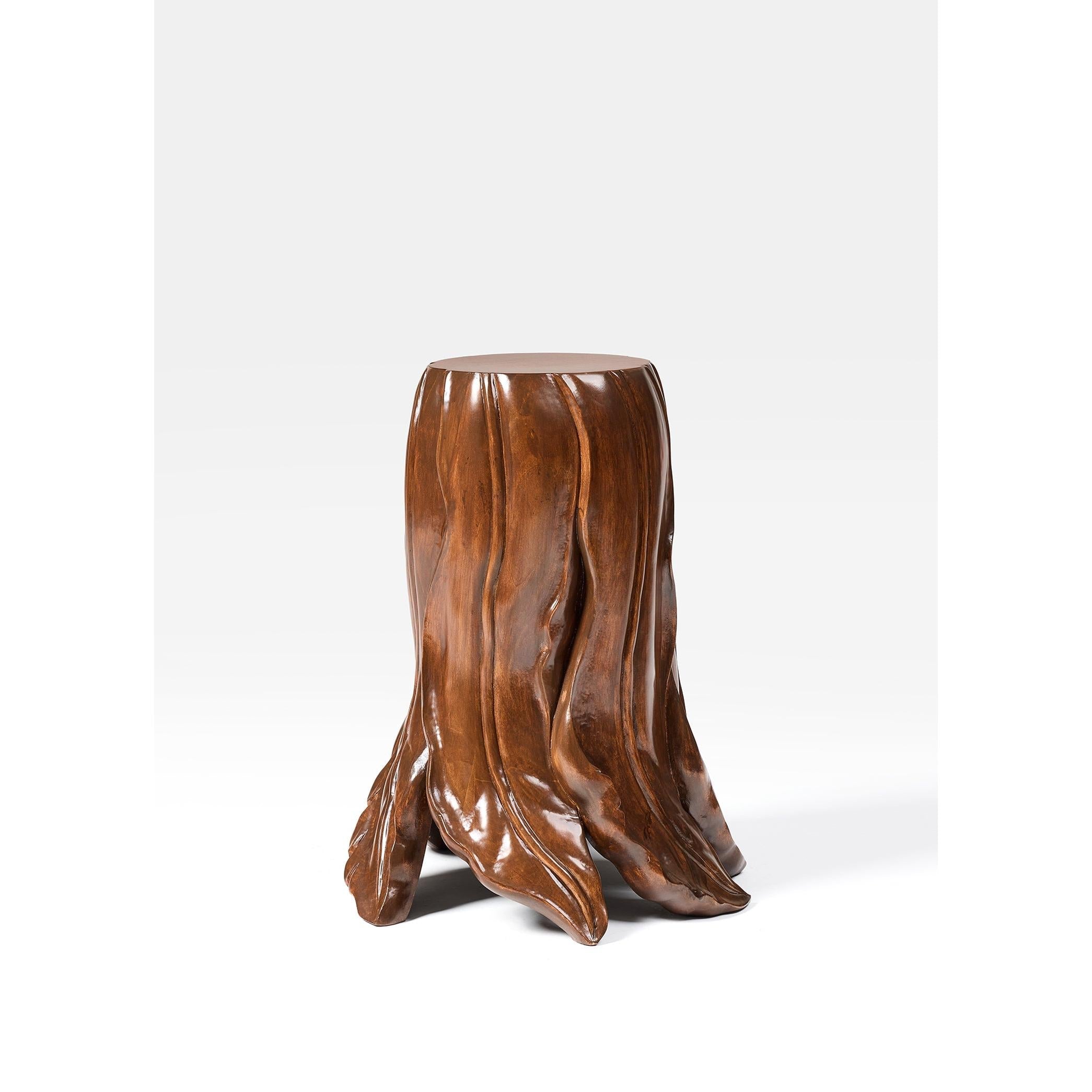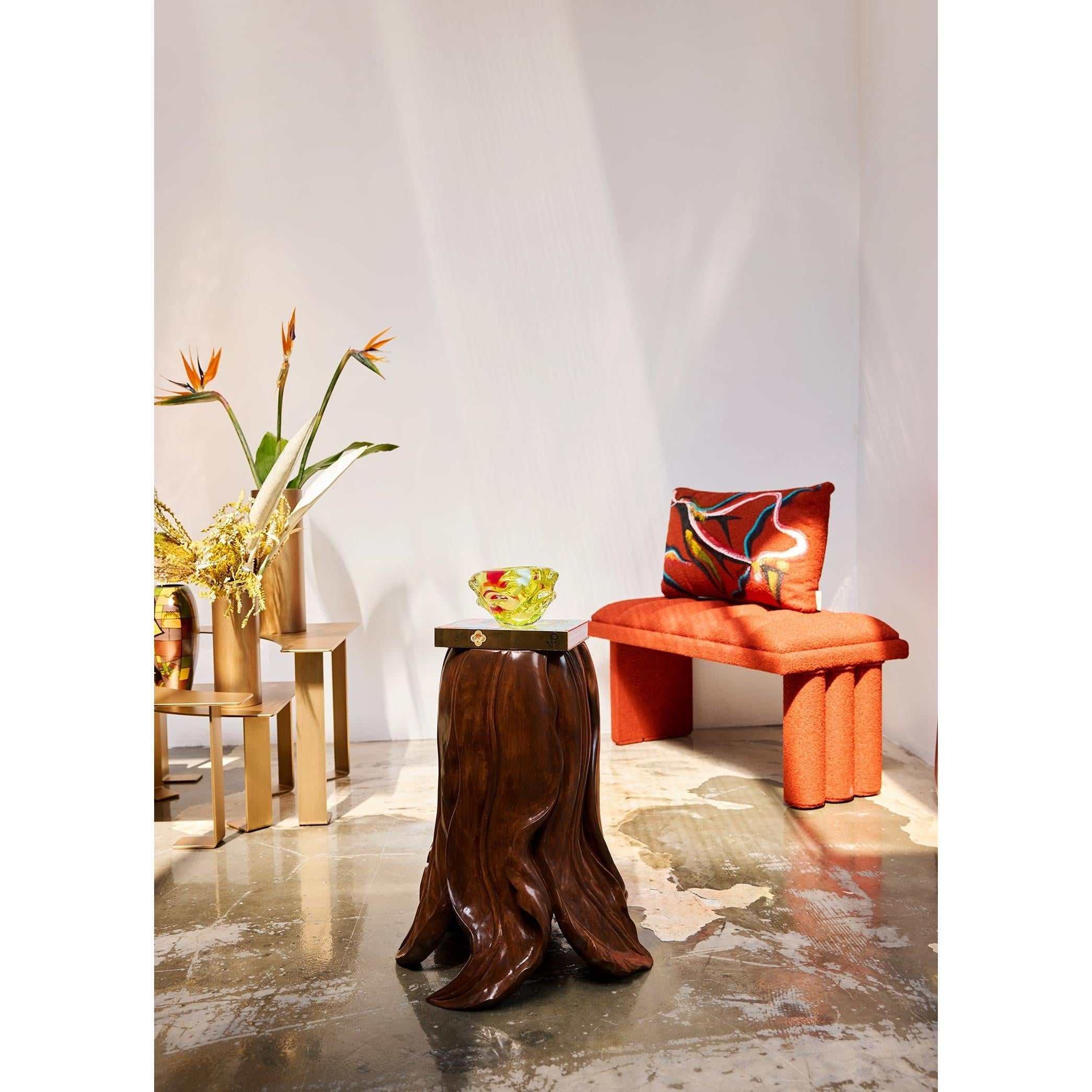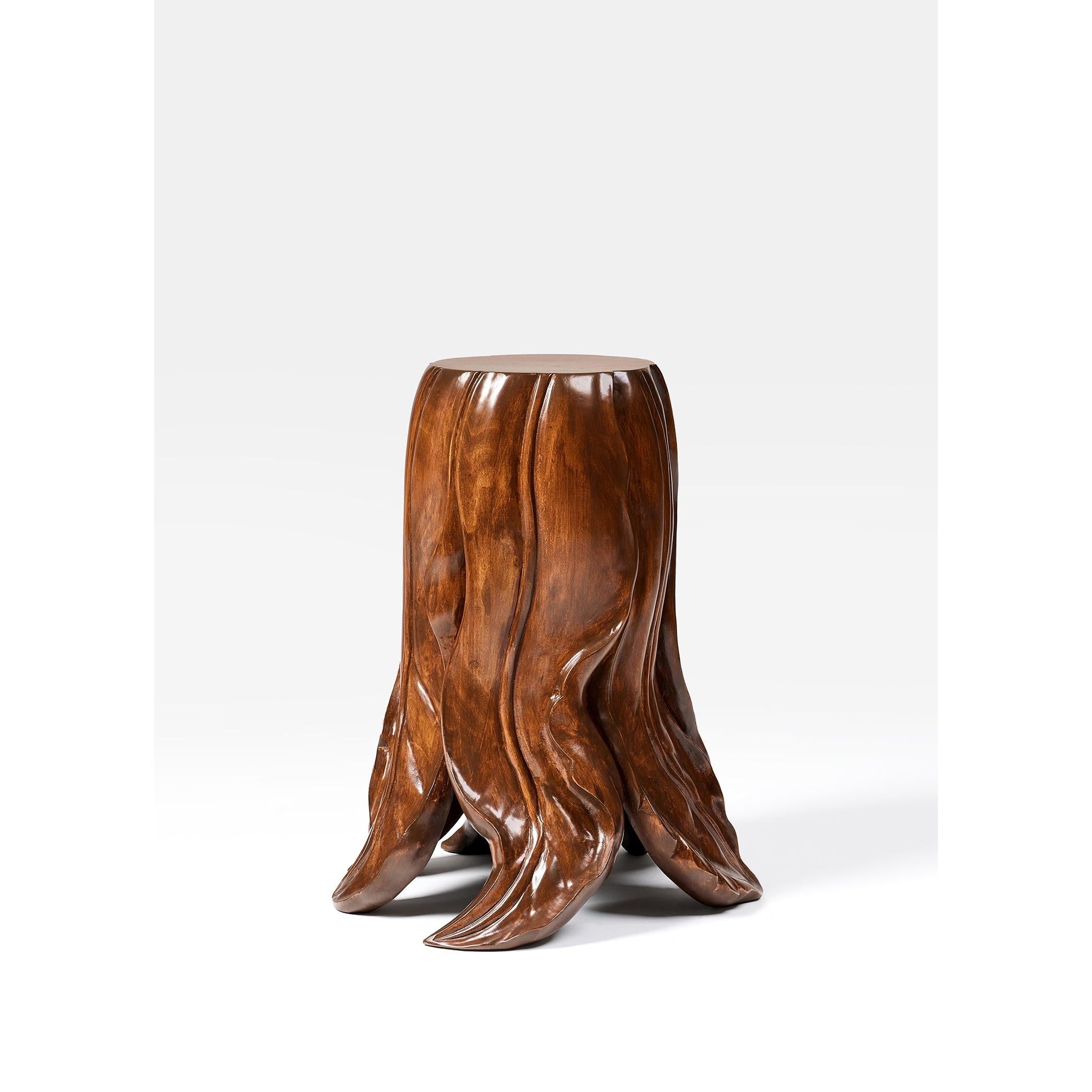Folia yan sehpa, yapraktan ilham alan zarif formu ve el oyması tasarımıyla öne çıkıyor. Ihlamur ağacının sıcak ve doğal yüzeyi, her kıvrımda ustalıklı bir işçiliği yansıtır. Sehpanın yüzeyinden tabanına doğru uzanan çizgisel hareket, doğadaki büyüme ve dönüşüm hissini çağrıştırır. Heykelsi yapısı sayesinde yalnızca işlevsel değil, aynı zamanda mekânda kendine özgü bir duruş sergiler. Organik çizgileriyle sade, rafine ve zamansız bir tamamlayıcı.