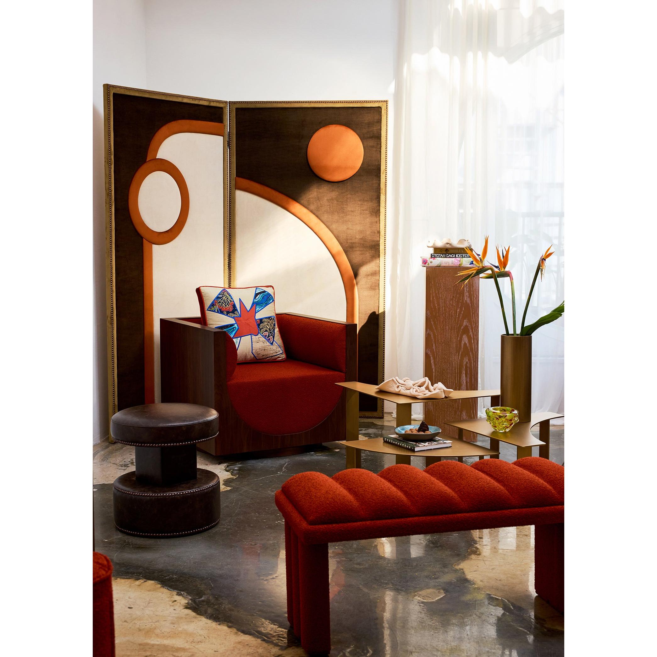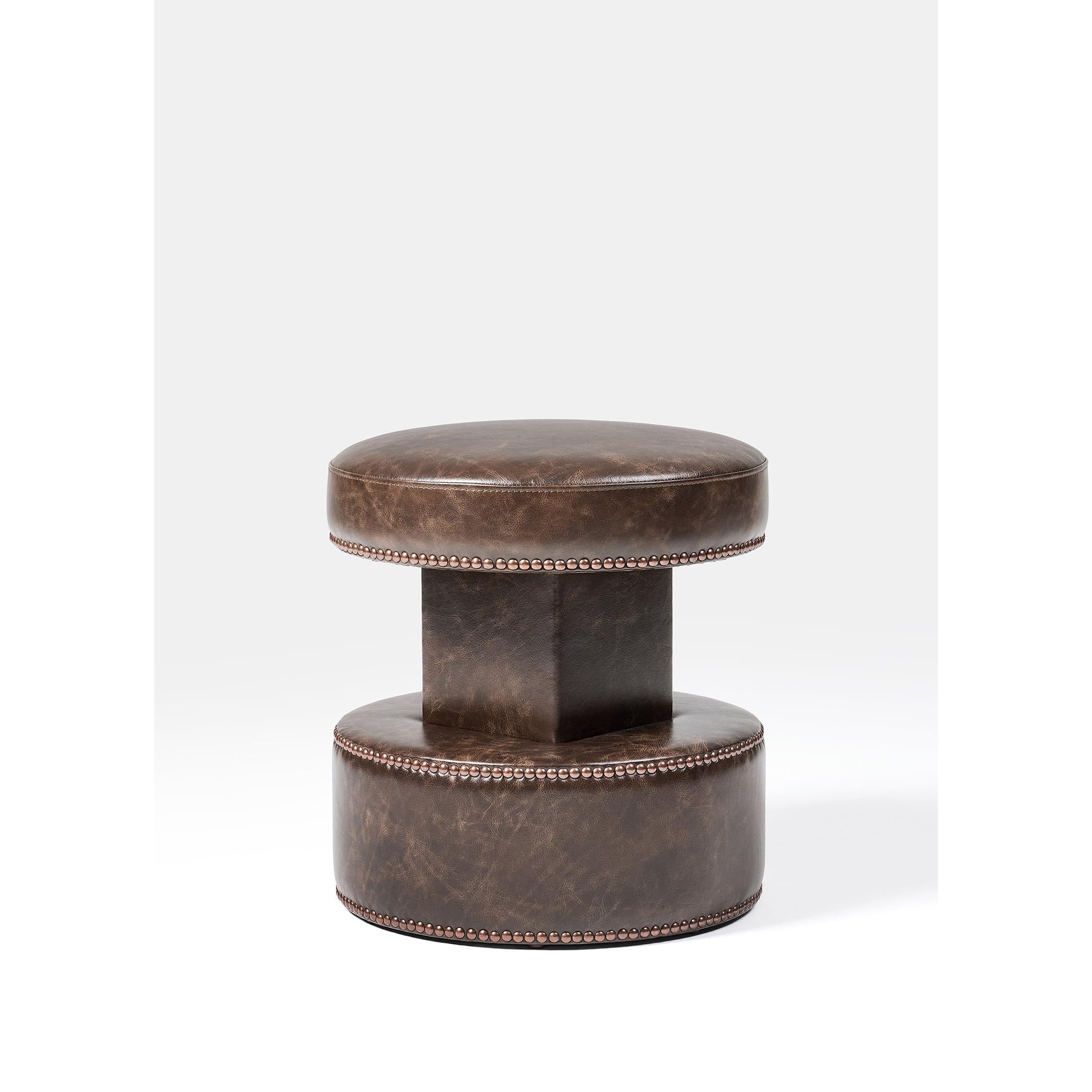 Nova Stool, güçlü geometrisi ve zamansız duruşuyla dikkat çekerken, bu versiyonunda doğal eskime efekti taşıyan deri kaplamasıyla daha karakterli bir ifade kazanıyor. Dokusu zamana meydan okuyan bir yüzey hissi sunarken, çevresini saran dekoratif kabara detayları nostaljik ama rafine bir dokunuş ekler. Tek başına bir vurgu objesi olabilen bu parça, klasikle modern arasında köprü kuran mekanlar için özel olarak tasarlandı.