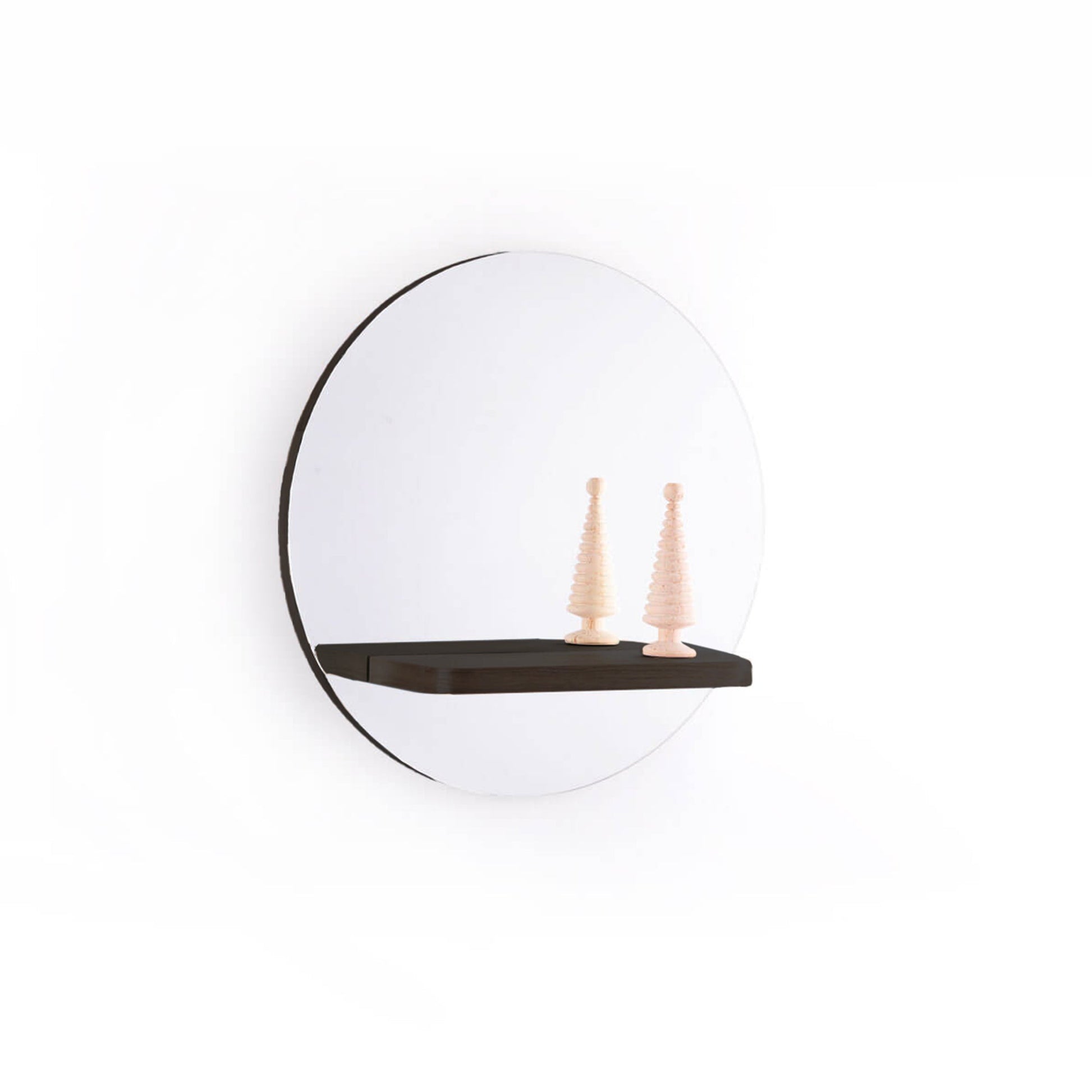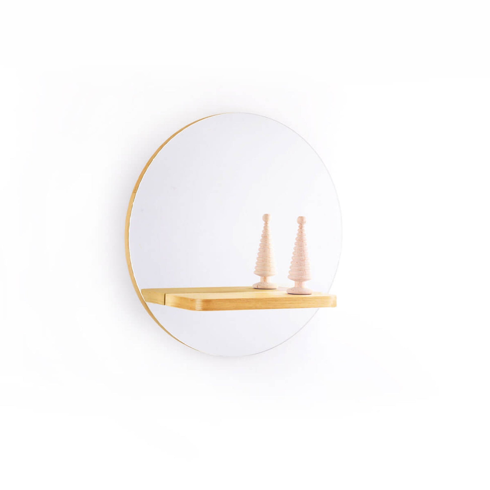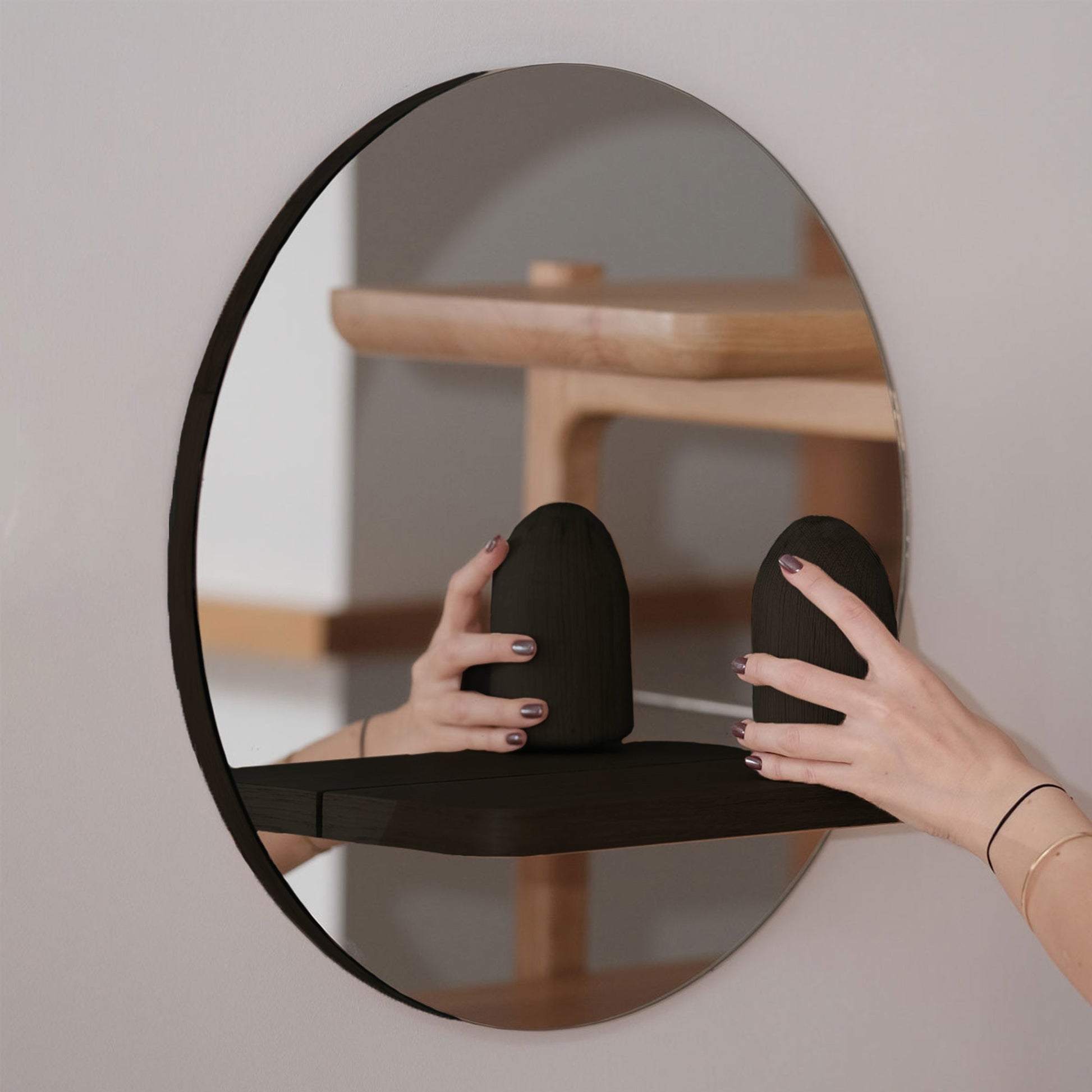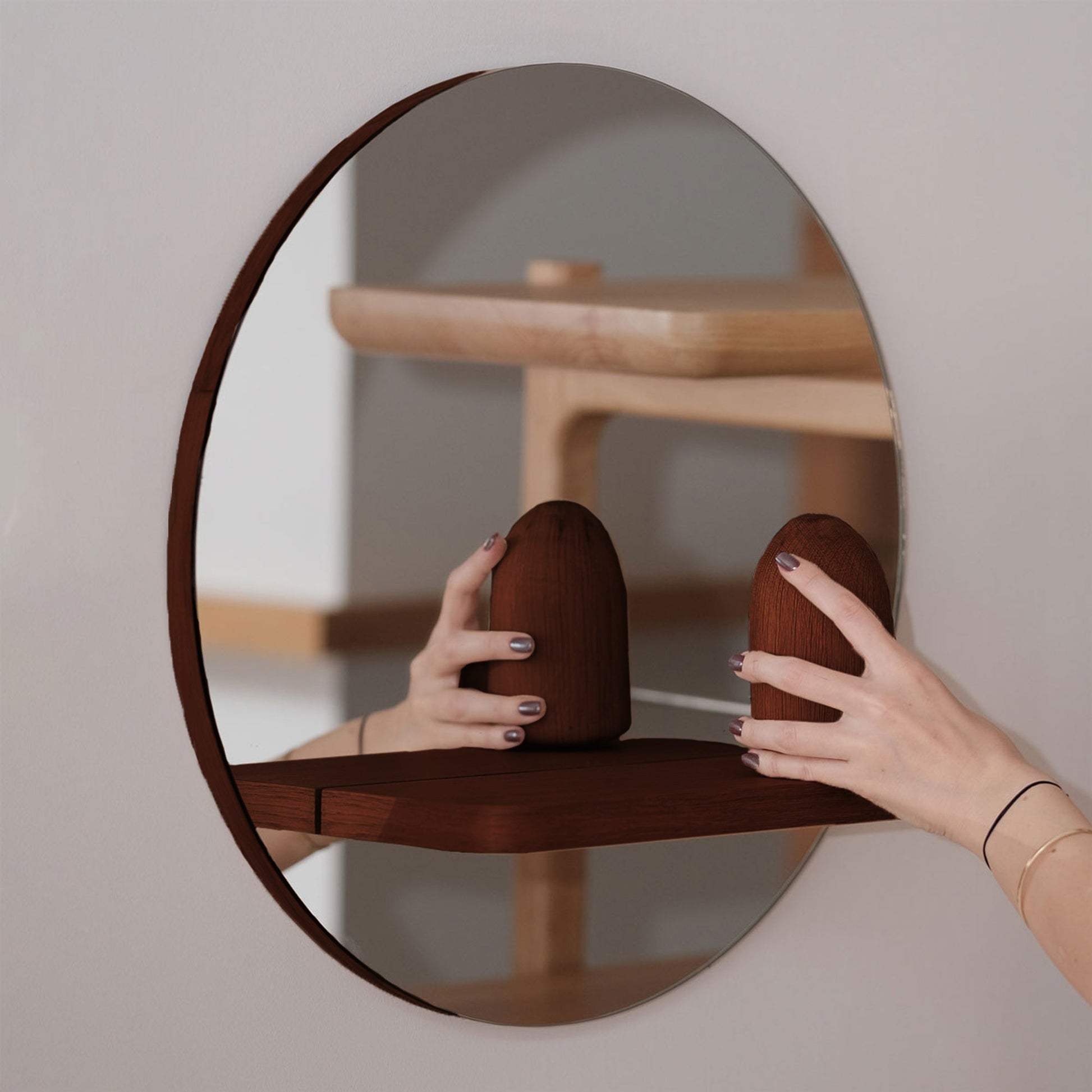 Masif meşe ağacından el işçiliği ile üretilen yuvarlak raflı ayna, zarif tasarımı ve işlevselliğiyle hem dekoratif hem de kullanışlı bir seçenek sunar. Koridor, banyo veya oturma odasında ideal bir tamamlayıcıdır.