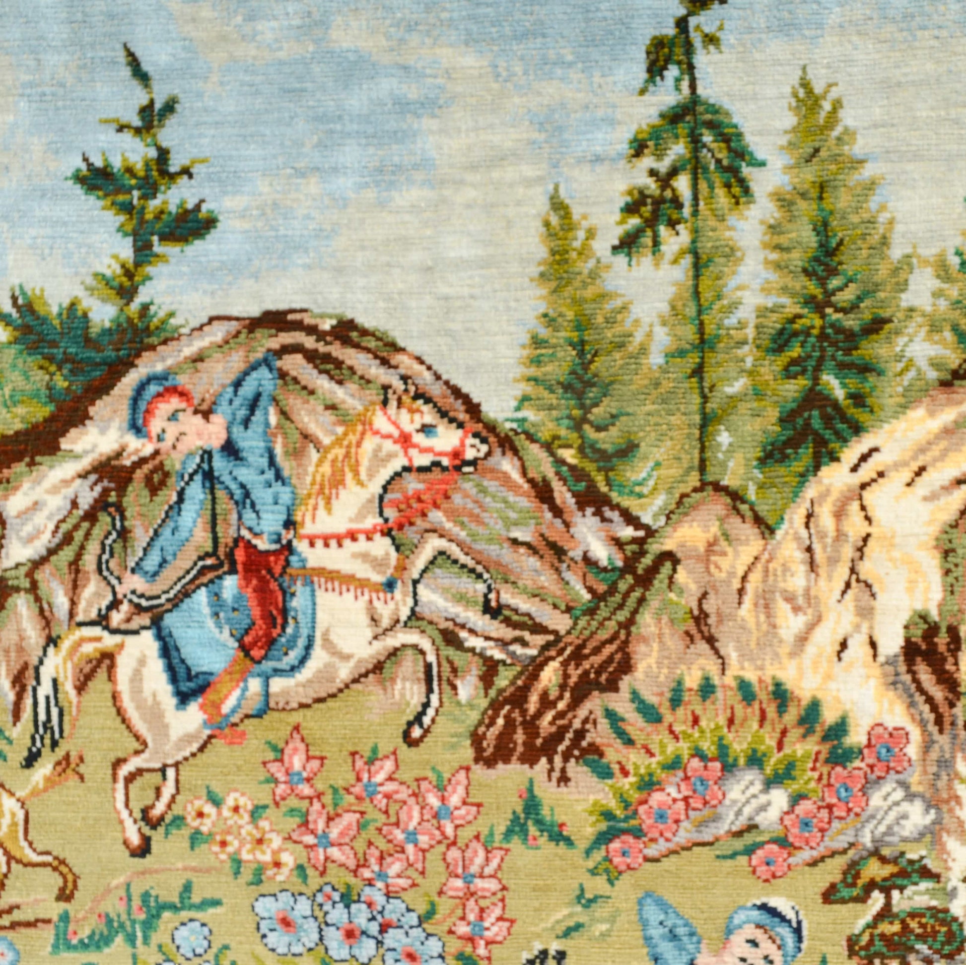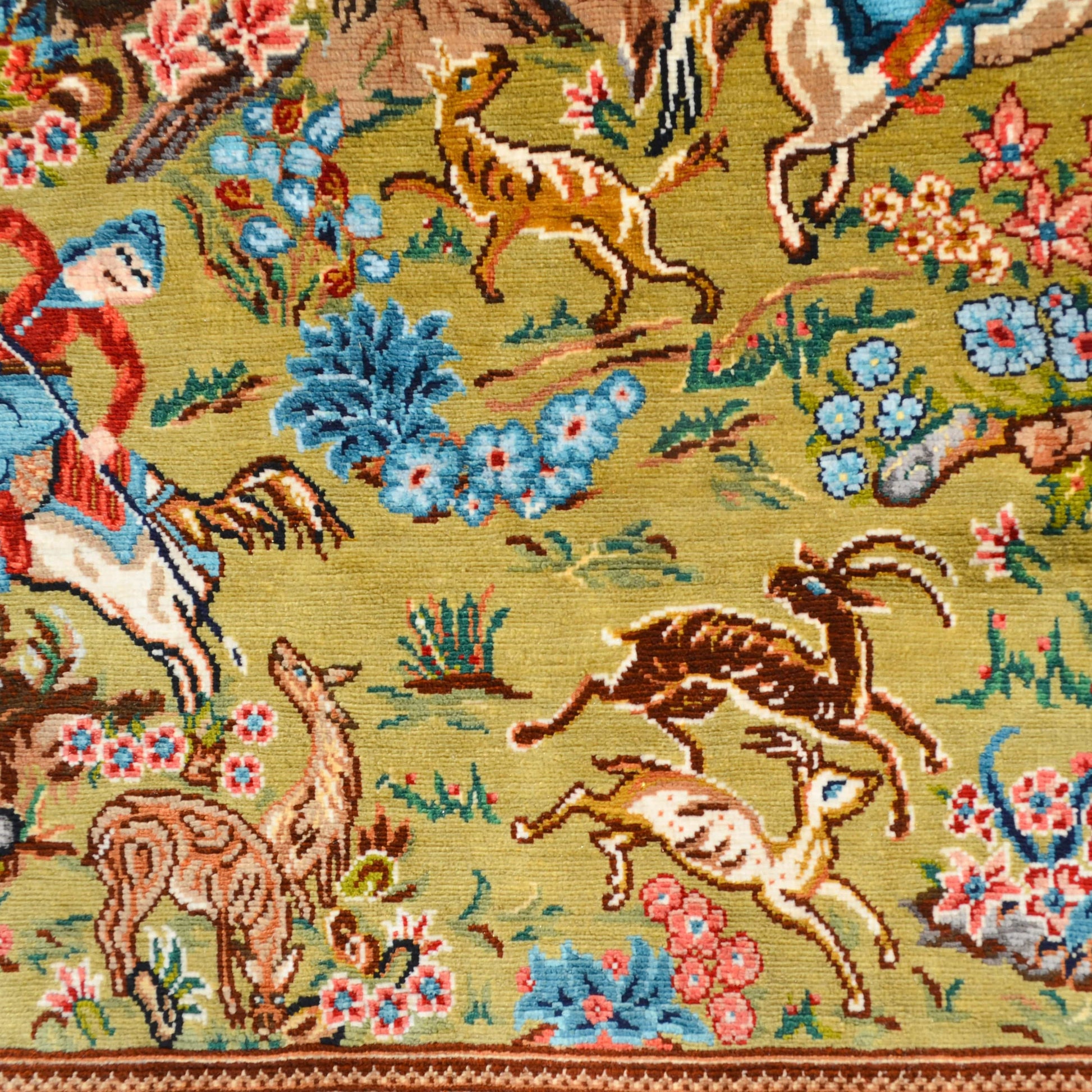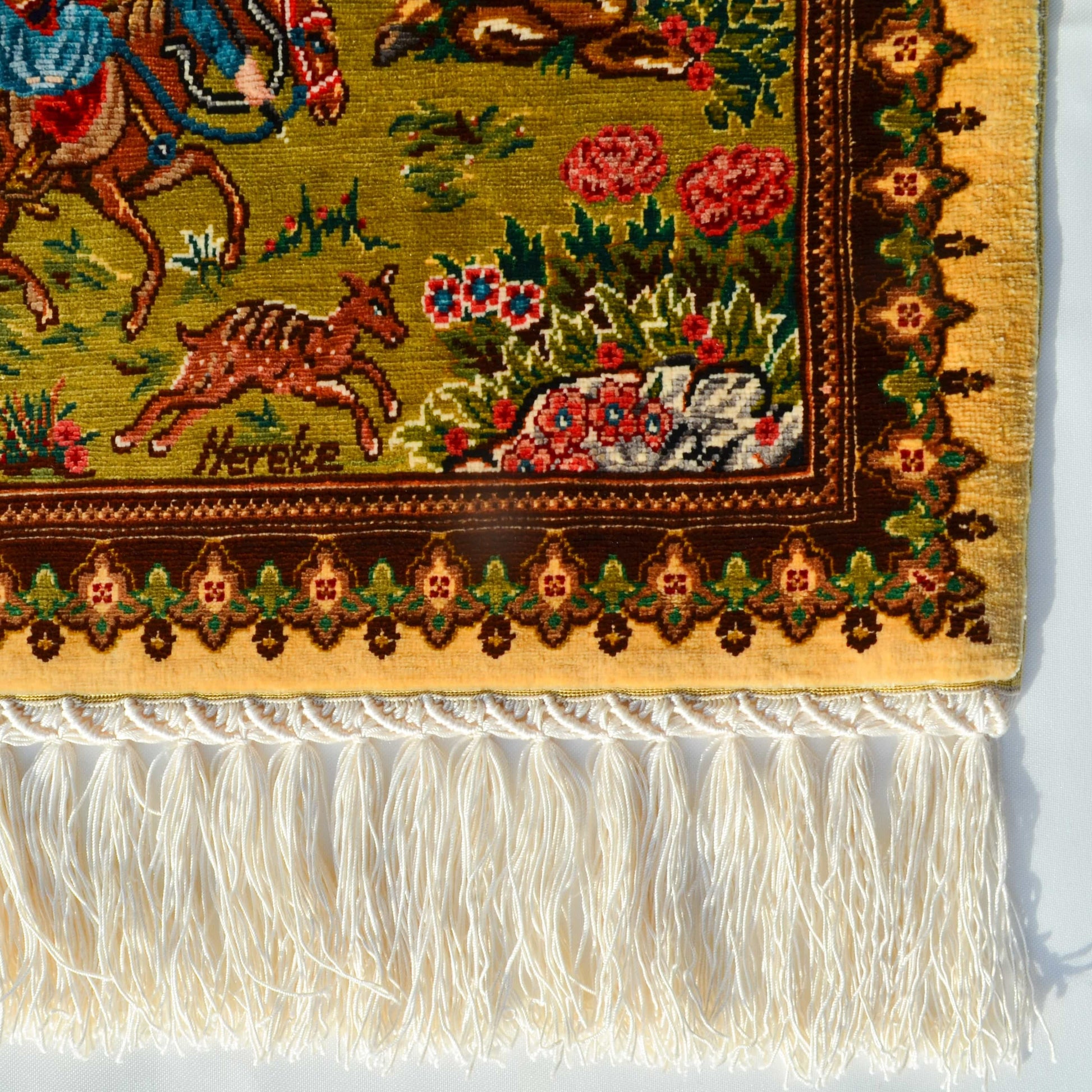 Orijinal Bursa ipeğinden, tamamen el işçiliğiyle dokunan bu özel Hereke halısı, 12x12 kaliteye sahip olup metrekaresinde yaklaşık 1,44 milyon düğüm barındırır. “Av Sahnesi” deseni, geleneksel Anadolu yaşamını ve doğayla insan etkileşimini detaylı bir şekilde resmeder. Saf ipeğin parlaklığı ve renk geçişleri, sahnedeki hareket ve dinamizmi canlı bir biçimde ortaya çıkarır.