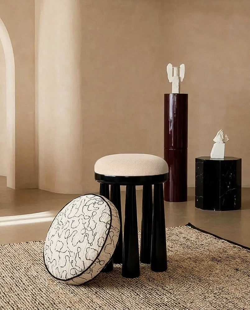 Dalgalı motif dokusuyla modern yaşam alanlarına akışkan bir enerji katar. Yuvarlak form, desenin ritmini daha heykelsi kılarken, siyah biye detayı tasarıma güçlü bir çerçeve ekler.