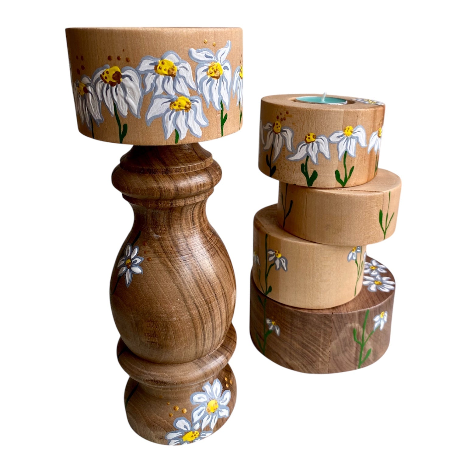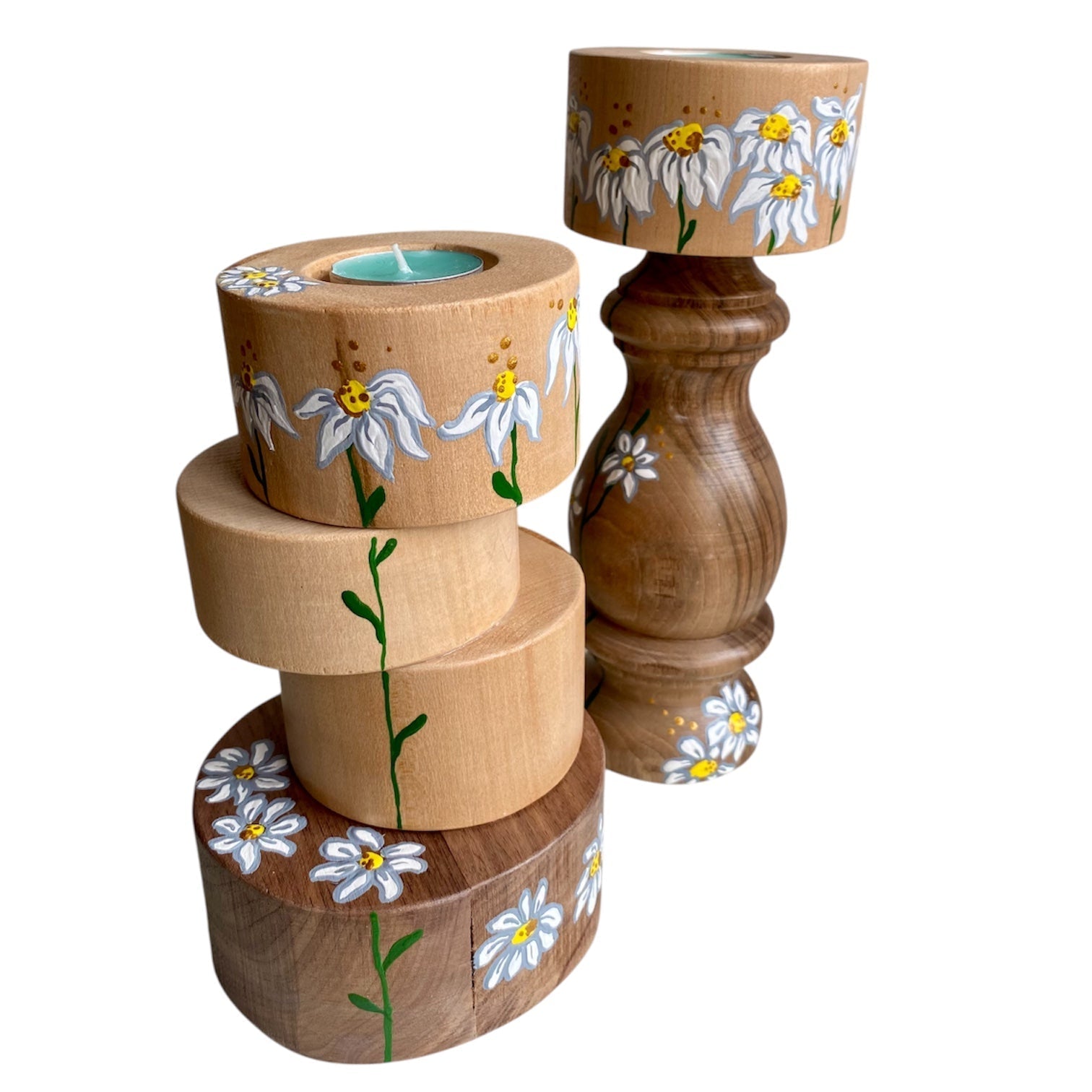 Akrilik boya ile papatya çiçekleri esprili bir şekilde çalışılmıştır.