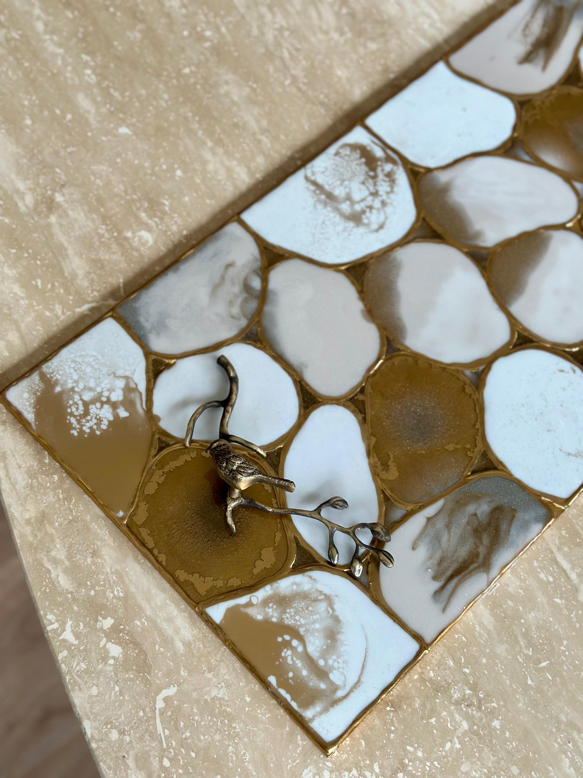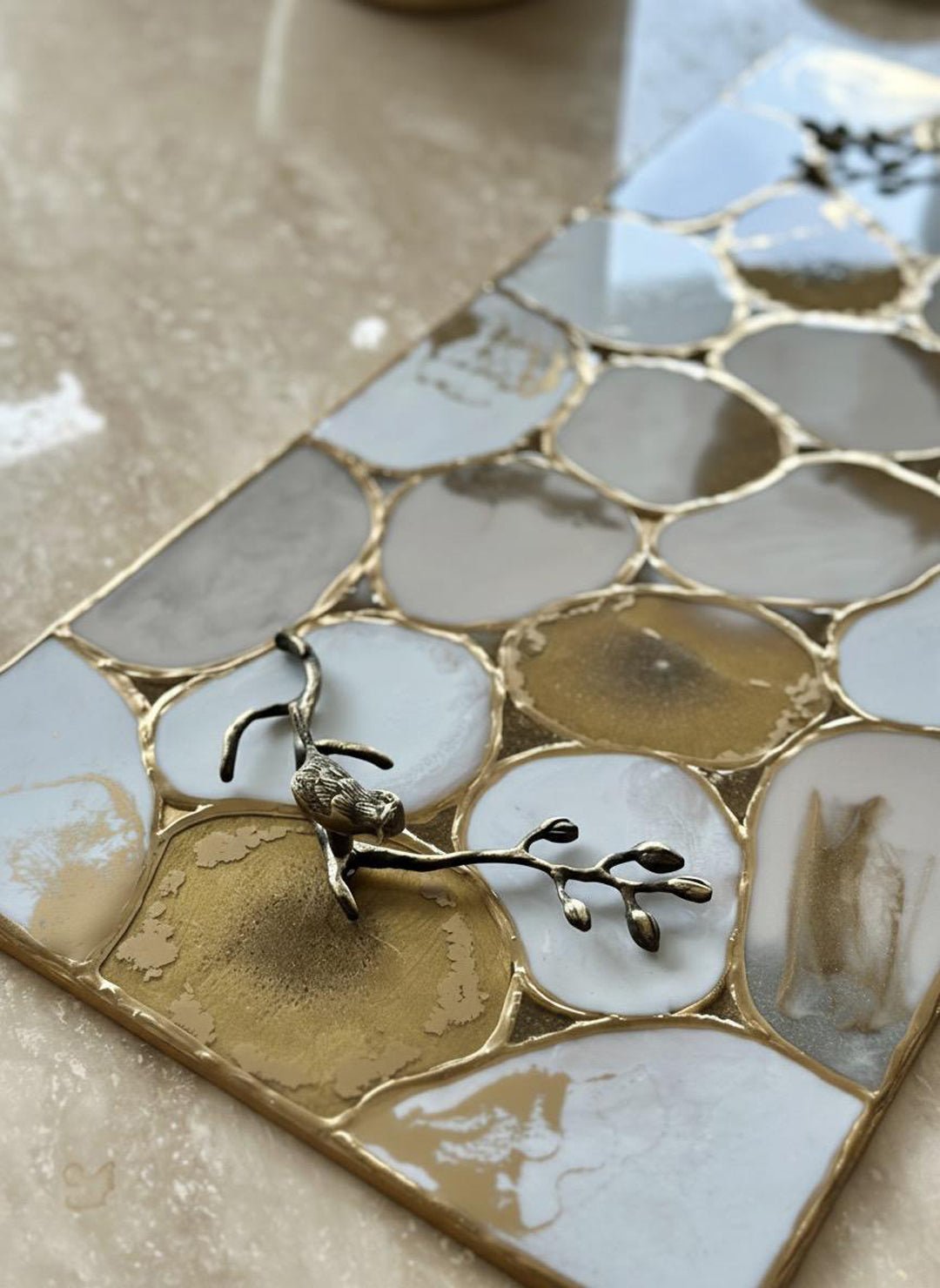 Ağacın özünden gelen reçineyi bizler onu farklı materyallerle buluşturduk ve içine renkleri akıtıp böylesi sanatsal bir tasarım elde ettik.