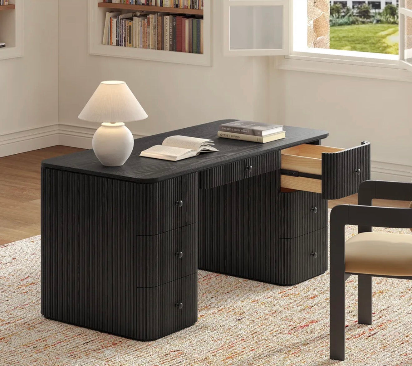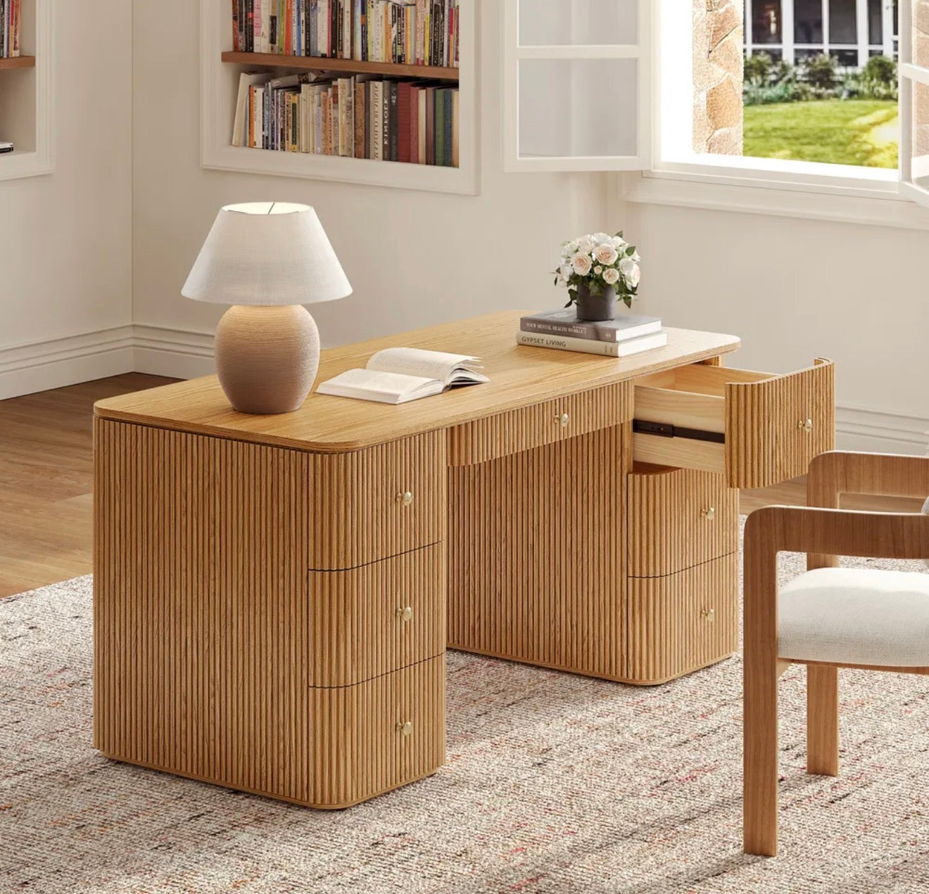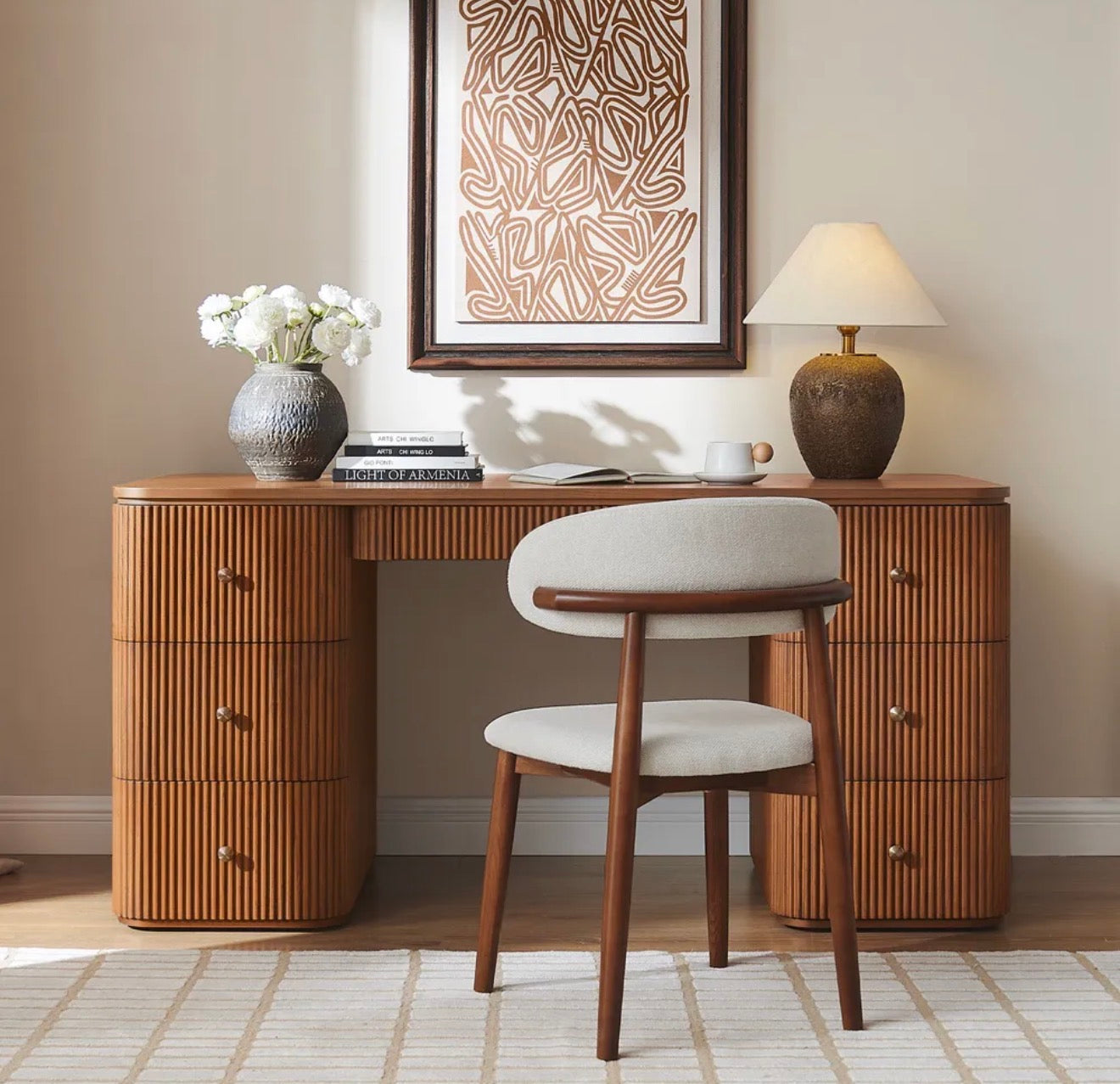 Orta yüzyıl esintili formu, flüt detaylı yüzeyi ve dengeli geometrik yapısıyla mekâna güçlü bir karakter kazandırır. Doğal meşe kaplama yüzeyi, sıcak tonları ve derin dokusuyla zamansız bir görünüm sunar. Hem estetik hem ergonomik bir çalışma deneyimi için tasarlanan Esona, ev ofislerden kreatif stüdyolara kadar her alanda modern bir odak noktası oluşturur.