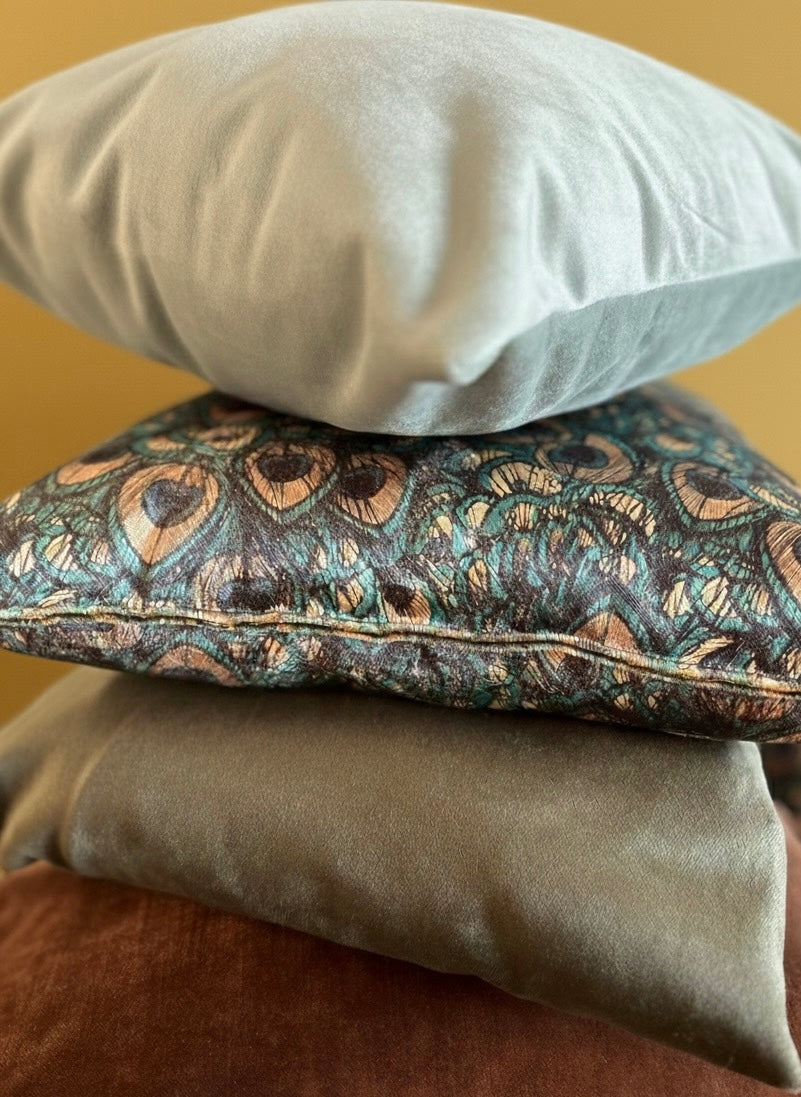 Tavus Kuşu Desenli Parlak Kadife Kırlent Kılıfı