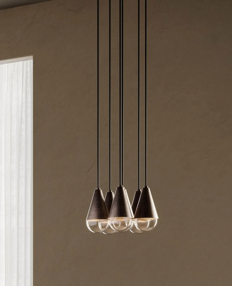 Dew adlı İtalyan iç mekân aydınlatma koleksiyonunun net çizgileri, demirin saf doğasını ön plana çıkarır.