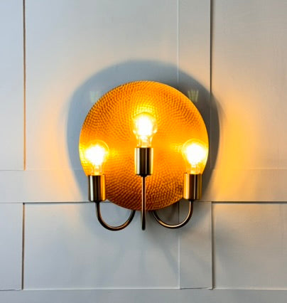 Trio dövme demir gövdesi, pirinç malzemenin şıklığıyla mekanınız için hem duvar dekoru hem de rustik bir aydınlatma alternatifi.