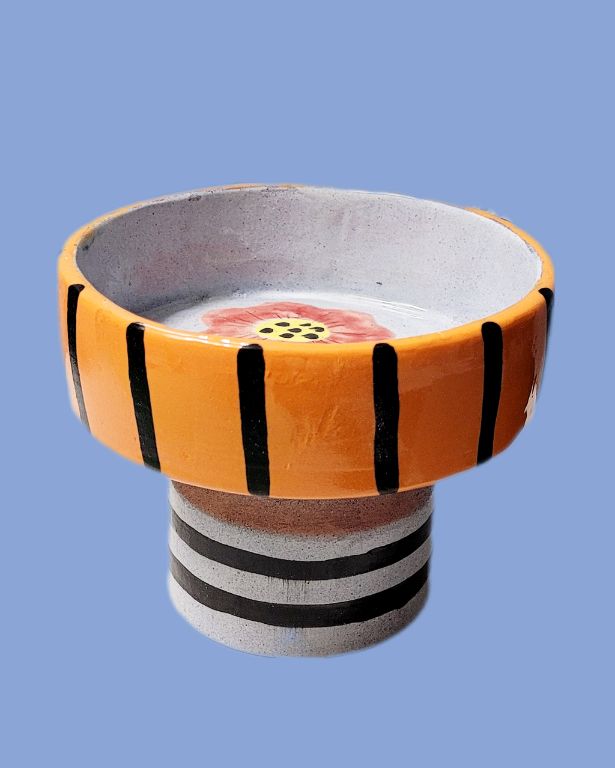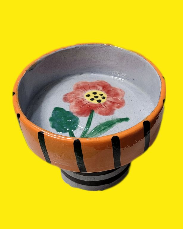 El yapımı, renkli, çiçekli, ayaklı seramik sunum kasesi.