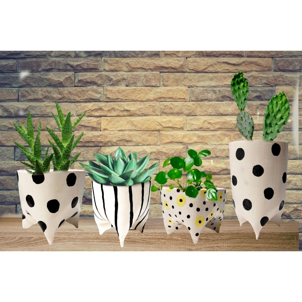 Farkli boylarda, puantiyeli, çizgili, ayaklı, sevimli, seramik, elle sekillendirilmiş ve dekorlanmış saksılar.