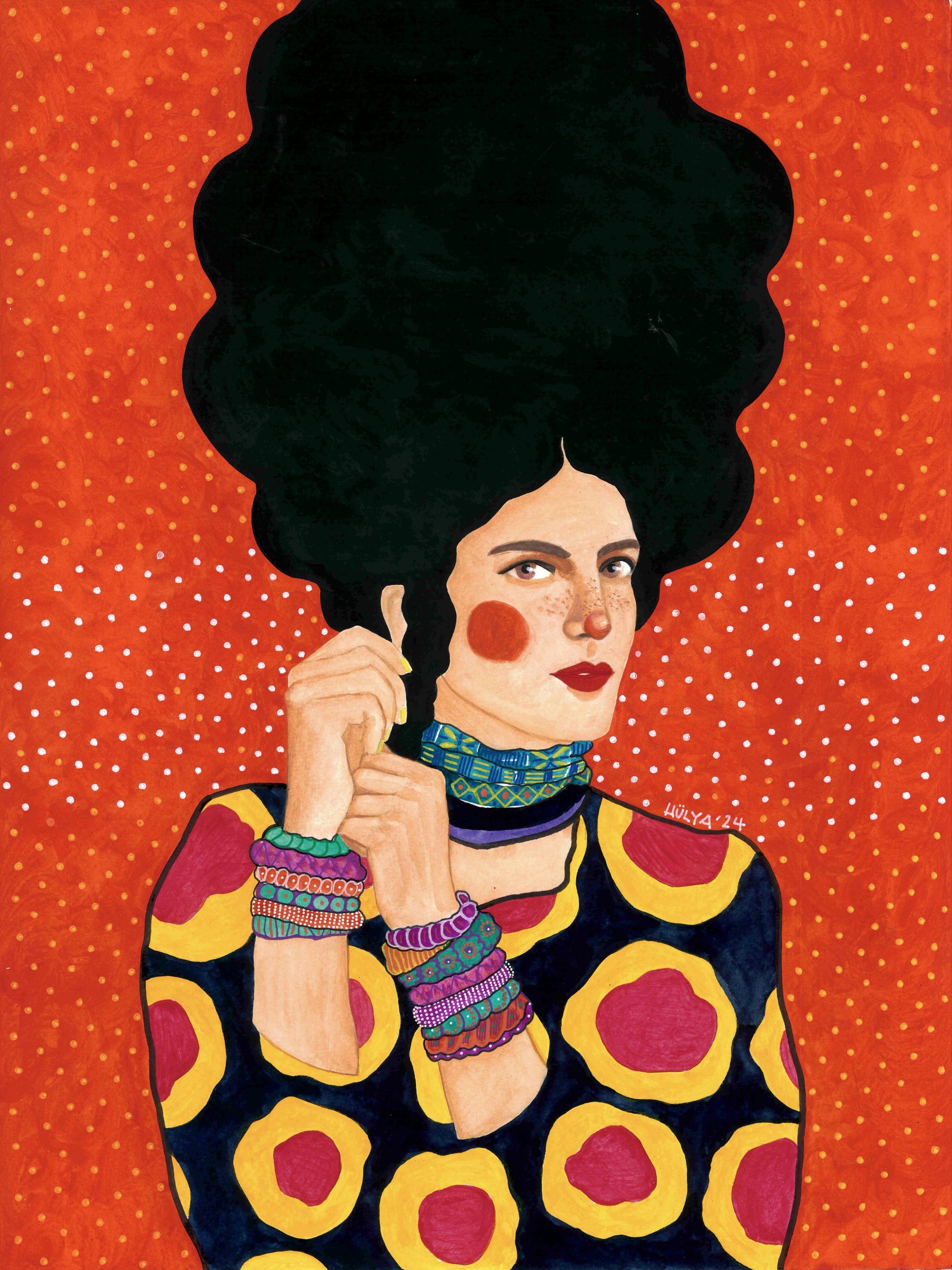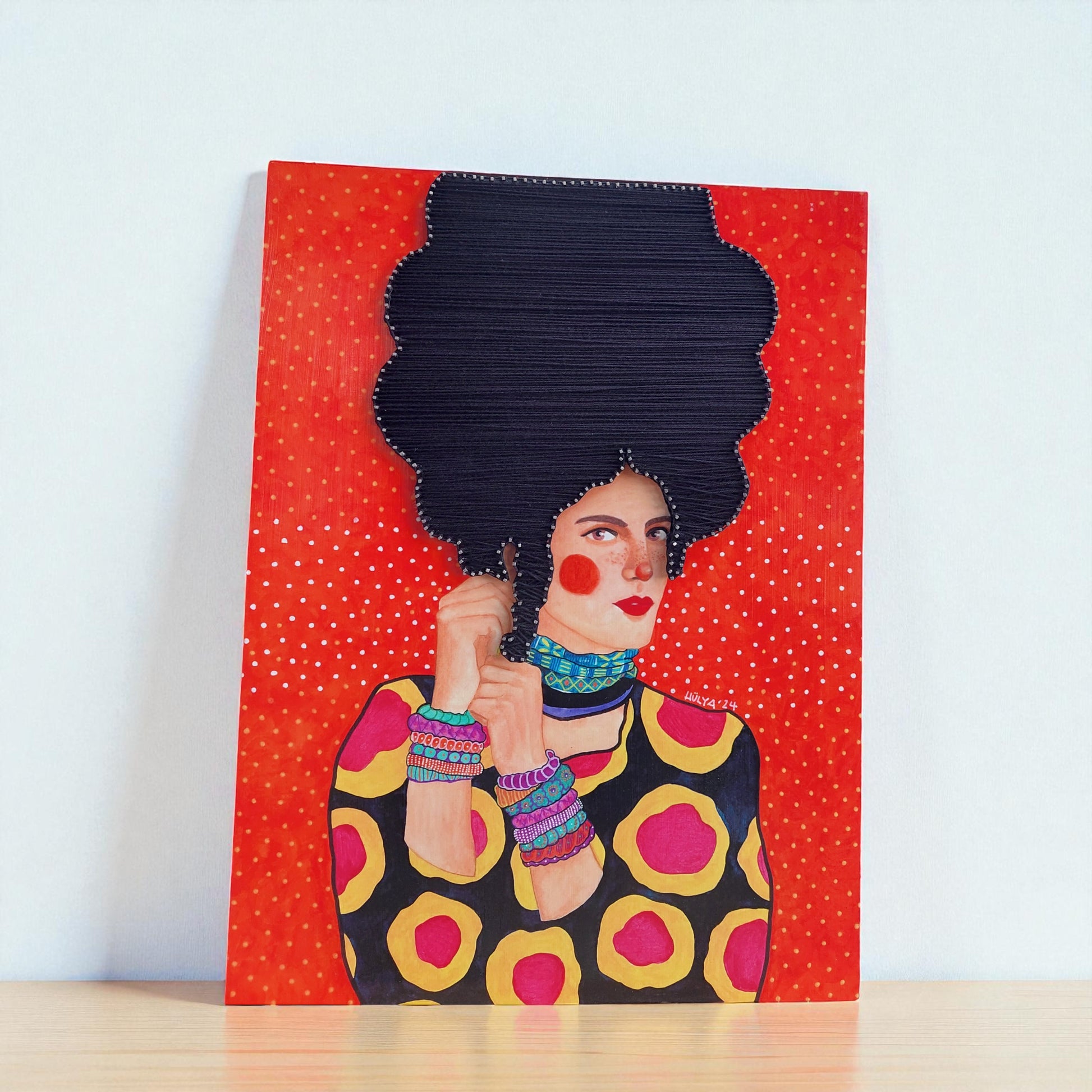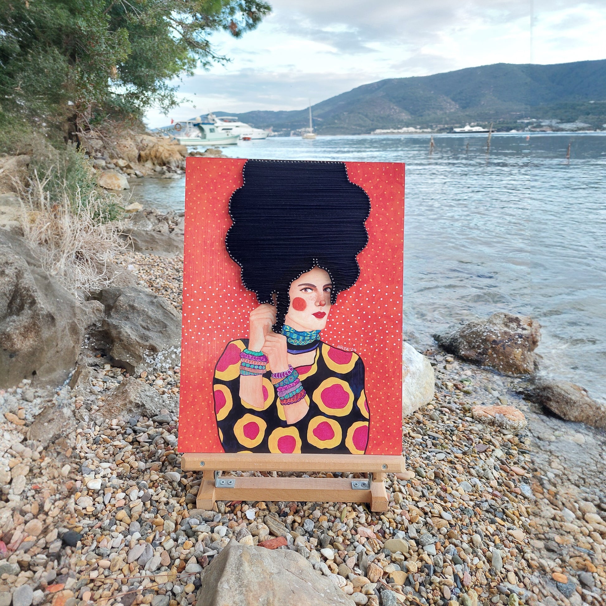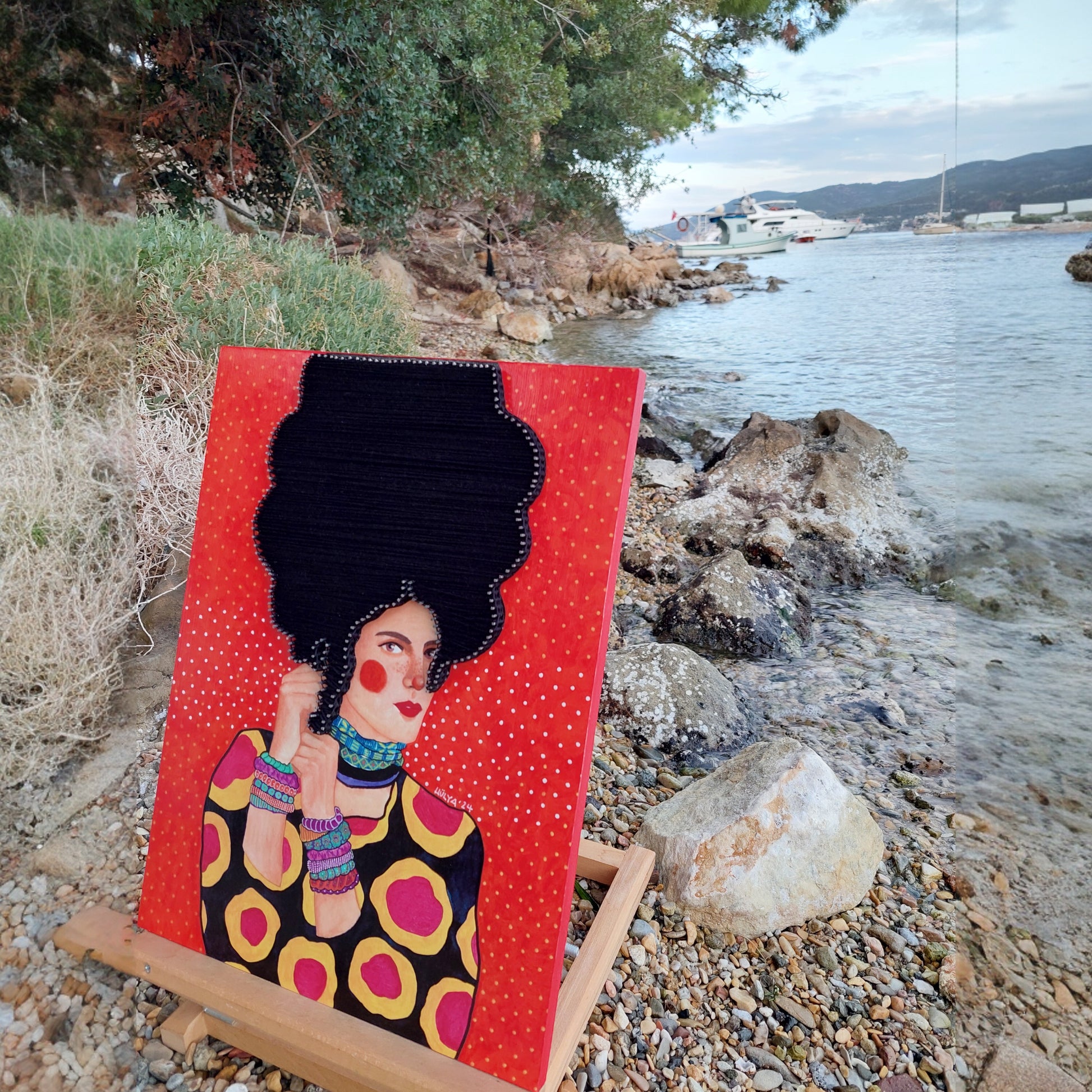*İllüstrasyon sanatçısı Hülya Özdemir'in sulu boya ile yapmış olduğu birbirinden özgün kadın portelerinin yüksek çözünürlüklü görselini ahşaba aktarıp saç kısmında çivi ve ip kullanarak string art tablosu yapılmıştır.