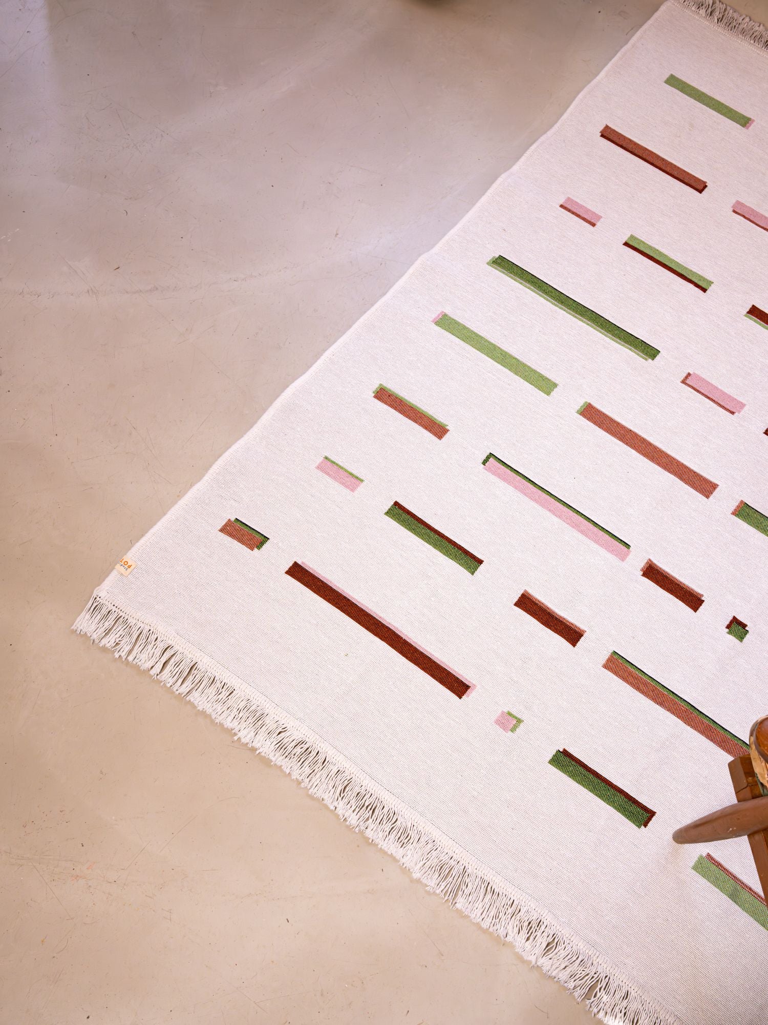 Bu kilim, tarafımızdan tasarlanmış ve geri dönüştürülmüş tekstil iplikleri ile yapılmıştır.  Makine üretimi olması sebebiyle el dokuması kilimlere göre biraz daha sık dokunmuş olan bu kilimi iç veya dış mekanda çift taraflı olarak kullanabilir ve çamaşır makinenizde yıkayabilirsiniz.